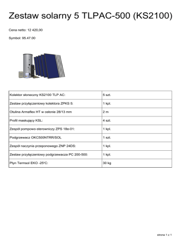 Zestaw solarny 5 TLPAC-500 (KS2100) Cena netto: 12 420,00 Symbol: 95.47.00 Kolektor słoneczny KS2100 TLP AC: 5 szt. Zestaw przyłączeniowy kolektora ZPKS 5: 1 kpl. Otulina Armaflex HT w osłonie 28/13 mm 2m Profil maskujący KSL: 4 szt. Zespół pompowo-sterowniczy ZPS 18e-01: 1 kpl. Podgrzewacz OKC500NTRR/SOL 1 szt. Zespół naczynia przeponowego ZNP 24DS: 1 kpl. Zestaw przyłączeniowy podgrzewacza PC 200-500: 1 kpl. Płyn Termsol EKO -25oC: 30 kg strona 1 z 1