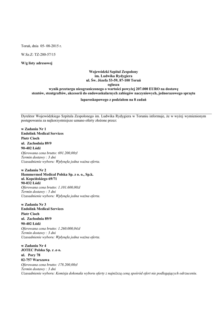 Toruń, dnia 05- 08-2015 r. W.Sz.Z: TZ-280-57/15 W/g listy adresowej Wojewódzki Szpital Zespolony im. Ludwika Rydygiera ul. Św. Józefa 53-59, 87-100 Toruń ogłasza wynik przetargu nieograniczonego o wartości powyżej 207.000 EURO na dostawę stentów, stentgraftów, akcesorii do endowaskularnych zabiegów naczyniowych, jednorazowego sprzętu laparoskopowego z podziałem na 8 zadań Dyrektor Wojewódzkiego Szpitala Zespolonego im. Ludwika Rydygiera w Toruniu informuje, że w wyżej wymienionym postępowaniu za najkorzystniejsze uznano oferty złożone przez: w Zadaniu Nr 1 Endolink Medical Services Piotr Cioch ul. Zachodnia 89/9 90-402 Łódź Oferowana cena brutto: 691.200,00zł Termin dostawy : 3 dni Uzasadnienie wyboru: Wpłynęła jedna ważna oferta. w Zadaniu Nr 2 Hammermed Medical Polska Sp. z o. o., Sp.k. ul. Kopcińskiego 69/71 90-032 Łódź Oferowana cena brutto: 1.101.600,00zł Termin dostawy : 5 dni Uzasadnienie wyboru: Wpłynęła jedna ważna oferta. w Zadaniu Nr 3 Endolink Medical Services Piotr Cioch ul. Zachodnia 89/9 90-402 Łódź Oferowana cena brutto: 1.260.000,04zł Termin dostawy : 3 dni Uzasadnienie wyboru: Wpłynęła jedna ważna oferta. w Zadaniu Nr 4 JOTEC Polska Sp. z .o o. ul. Pory 78 02-757 Warszawa Oferowana cena brutto: 178.200,00zł Termin dostawy : 3 dni Uzasadnienie wyboru: Komisja dokonała wyboru oferty z najniższą ceną spośród ofert nie podlegających odrzuceniu. w Zadaniu Nr 5 EFmed Sp. z o. o. ul. Marynarki Polskiej 100 80-557 Gdańsk Oferowana cena brutto: 256.284,00zł Termin dostawy : 3 dni Uzasadnienie wyboru: Wpłynęła jedna ważna oferta. w Zadaniu Nr 6 Biotronik Polska Sp. z o. o. ul. Murawa 12-18 61-655 Poznań Oferowana cena brutto: 322.920,00zł Termin dostawy : 1 dzień Uzasadnienie wyboru: Wpłynęła jedna ważna oferta. w Zadaniu Nr 7 Johnson & Johnson Poland Sp. z o. o. ul. Iłżecka 24 02-135 Warszawa Oferowana cena brutto: 2.101.588,20zł Termin dostawy : 1 dzień Uzasadnienie wyboru: Wpłynęła jedna ważna oferta. w Zadaniu Nr 8 Biotronik Polska Sp. z o. o. ul. Murawa 12-18 61-655 Poznań Oferowana cena brutto: 109.620,00zł Termin dostawy : 1 dzień Uzasadnienie wyboru: Dokonano wyboru oferty najkorzystniejszej w oparciu o kryteria określone w SIWZ. Umowy z wybranymi Wykonawcami zostaną zawarte w dniu 17-08-2015r. Prosimy o przybycie uprawnionych reprezentantów firm, których oferty zostały wybrane jako najkorzystniejsze w ww. terminie, celem podpisania umowy. Informacja o Wykonawcach, którzy złożyli oferty oraz punktacja przyznana ofertom w kryterium ceny. Nr Zadania Nr Oferty 1 1 2 2 3 1 4 2 Nazwa i adres Wykonawcy Endolink Medical Services Piotr Cioch ul. Zachodnia 89/9 90-402 Łódź Hammermed Medical Polska Sp. z o. o., Sp.k. ul. Kopcińskiego 69/71 90-032 Łódź Endolink Medical Services Piotr Cioch ul. Zachodnia 89/9 90-402 Łódź Hammermed Medical Polska Sp. z o. o., Sp.k. ul. Kopcińskiego 69/71 90-032 Łódź Liczba pkt w kryterium cena Liczba pkt w kryterium Termin dostawy Razem 691.200,00zł 95 5 100 1.101.600,00zl 95 5 100 1.260.000,00 95 5 100 Cena oferty brutto 75.600,00 Oferta odrzucona na podstawie art.90 ust 3– Pzp. 4 5 3 6 5 7 7 5 8 6 JOTEC Polska Sp. z .o o. ul. Pory 78 02-757 Warszawa EFmed Sp. z o. o. ul. Marynarki Polskiej 100 80-557 Gdańsk Biotronik Polska Sp. z o. o. ul. Murawa 12-18 61-655 Poznań Johnson & Johnson Poland Sp. z o. o. ul. Iłżecka 24 02-135 Warszawa Biotronik Polska Sp. z o. o. ul. Murawa 12-18 61-655 Poznań Bard Poland Sp. z o. o. ul. Cybernetyki 9 02-677 Warszawa 178.200,00zł 95 256.284,00zł 95 322.920,00zł 95 2.101.588,20zł 95 109.620,00zł 95 167.940,00zł 62 100 5 100 5 100 5 100 5 100 5 2,5 64.50 Podstawa prawna oraz uzasadnienie odrzucenia oferty z Zadania Nr 4 firmy Hammermed Medical Polska Sp. z o. o., Sp.k., ul. Kopcińskiego 69/71, 90-032 Łódź Podstawa prawna: art. 90 ust. 3 ustawy - Prawo zamówień publicznych (Dz. U. z 2013 r. poz. 907 z późn. zm.) Uzasadnienie: W toku badania oceny ofert Zamawiający powziął wątpliwości związane z ceną oferty zaproponowaną przez firmę Hammermed Medical Polska Sp. z o. o., Sp.k.. Zamawiający poinformował Wykonawcę, że oferowana cena w Zadaniu Nr 4 odbiega od średniej arytmetycznej cen wszystkich złożonych ofert oraz od wartości szacunkowej zamówienia ustalonej przez Zamawiającego. Zamawiający wezwał Wykonawcę pismem z dnia 31.07.2015r do złożenia wyjaśnień dotyczących rażąco niskiej ceny. Wykonawca do wyznaczonego terminu nie złożył wyjaśnień. W związku z powyższym Zamawiający odrzuca ofertę Wykonawcy na podstawie art. 90 ust. 3 ustawy - Prawo zamówień publicznych (Dz. U. z 2013 r. poz. 907 z późn. zm.) Z poważaniem