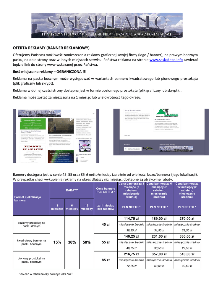 OFERTA REKLAMY (BANNER REKLAMOWY) Oferujemy Państwu możliwość zamieszczenia reklamy graficznej swojej firmy (logo / banner), na prawym bocznym pasku, na dole strony oraz w innych miejscach serwisu. Państwa reklama na stronie www.saskakepa.info zawierać będzie link do strony www wskazanej przez Państwa. Ilość miejsca na reklamy – OGRANICZONA !!! Reklama na pasku bocznym może występować w wariantach banneru kwadratowego lub pionowego prostokąta (plik graficzny lub skrypt). Reklama w dolnej części strony dostępna jest w formie poziomego prostokąta (plik graficzny lub skrypt). . Reklama może zostać zamieszczona na 1 miesiąc lub wielokrotność tego okresu. Bannery dostępna jest w cenie 45, 55 oraz 85 zł netto/miesiąc (zależnie od wielkości boxu/bannera i jego lokalizacji). W przypadku chęci wykupienia reklamy na okres dłuższy niż miesiąc, dostępne są atrakcyjne rabaty: RABATY Cena bannera PLN NETTO * 3 6 12 miesiące miesięcy miesięcy za 1 miesiąc bez rabatów Format i lokalizacja bannera poziomy prostokąt na pasku dolnym kwadratowy banner na pasku bocznym 45 zł 15% 30% pionowy prostokąt na pasku bocznym 50% 55 zł 85 zł Cena bannera za 3 Cena bannera za 6 miesiące (z miesięcy (z rabatem, rabatem, miesięcznie miesięcznie średnio) średnio) PLN NETTO * PLN NETTO * PLN NETTO * 114,75 zł 189,00 zł 270,00 zł miesięcznie średnio miesięcznie średnio miesięcznie średnio 38,25 zł 31,50 zł 22,50 zł 140,25 zł 231,00 zł 330,00 zł miesięcznie średnio miesięcznie średnio miesięcznie średnio 46,75 zł 38,50 zł 27,50 zł 216,75 zł 357,00 zł 510,00 zł miesięcznie średnio miesięcznie średnio miesięcznie średnio 72,25 zł *do cen w tabeli należy doliczyć 23% VAT Cena bannera za 12 miesięcy (z rabatem, miesięcznie średnio) 59,50 zł 42,50 zł W przypadku bannerów o innych formatach (wielkość) lub umieszczonych w innych miejscach serwisu (pasek dolny, reklamy nad wpisami, pod wpisami, etc.) lub emitowanych w okresie innym niż miesiąc lub jego wielokrotność prosimy o kontakt z serwisem ([email protected]) celem ustalenia warunków cenowych. UWAGA: dla właścicieli wpisów PREMIUM dostępne są dodatkowe opcje rabatowe!!! Dodatkowe informacje dostępne są na życzenie: [email protected]. Opłata wnoszona jest z góry za cały okres, w ciągu 7 dni od daty wystawienia przez właściciela serwisu faktury proforma za usługę. Zgłoszenia chęci skorzystania z reklamy na pasku należy dokonywać mailem, na adres: [email protected] . UWAGA: opcja reklamowa nie jest dostępna dla: usług towarzyskich, promocji alkoholu oraz innych używek, przemocy / broni i treści ogólnie uznawanych za obraźliwe.