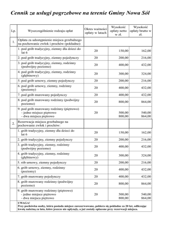Cennik za usługi pogrzebowe na terenie Gminy Nowa Sól Lp. Wyszczególnienie rodzaju opłat 1. Opłata za udostępnienie miejsca grzebalnego na pochowanie zwłok i prochów (pokładne): 2. Wysokość Wysokość Okres ważności opłaty netto opłaty brutto w opłaty w latach w zł. zł. 1. pod grób tradycyjny, ziemny dla dzieci do lat 6 20 150,00 162,00 2. pod grób tradycyjny, ziemny pojedynczy 20 200,00 216,00 3. pod grób tradycyjny, ziemny, rodzinny (podwójny poziomo) 20 400,00 432,00 4. pod grób tradycyjny, ziemny, rodzinny (głębinowy) 20 300,00 324,00 5. pod grób urnowy, ziemny pojedynczy 20 200,00 216,00 6. pod grób urnowy, ziemny, rodzinny (poziomy) 20 400,00 432,00 7. pod grób murowany pojedynczy 20 400,00 432,00 8. pod grób murowany rodzinny (podwójny poziomo) 20 800,00 864,00 9. pod grób murowany rodzinny (piętrowo) - jedno miejsce piętrowo - dwa miejsca piętrowo 20 500,00 800,00 540,00 864,00 1. grób tradycyjny, ziemny dla dzieci do lat 6 20 150,00 162,00 2. grób tradycyjny, ziemny pojedynczy 20 200,00 216,00 3. grób tradycyjny, ziemny, rodzinny (podwójny poziomo) 20 400,00 432,00 4. grób tradycyjny, ziemny, rodzinny (głębinowy) 20 300,00 324,00 5. rób urnowy, ziemny pojedynczy 20 200,00 216,00 6. grób urnowy, ziemny, rodzinny (poziomy) 20 400,00 432,00 7. grób murowany pojedynczy 20 400,00 432,00 8. grób murowany rodzinny (podwójny poziomo) 20 800,00 864,00 9. grób murowany rodzinny (piętrowo) - jedno miejsce piętrowo - dwa miejsca piętrowo 20 500,00 800,00 540,00 864,00 Rezerwacja miejsca grzebalnego na pochowanie zwłok i prochów: UWAGA! Przy pochówku osoby, która posiada miejsce zarezerwowane, pobiera się pokładne za 20 lat, odliczając kwotę należną za lata, które jeszcze nie upłynęły, a już zostały opłacone przy rezerwacji miejsca. Przedłużenie opłaty na następne 20 lat za 3. udostępnienie miejsca grzebalnego na pochowanie zwłok i prochów: 1. pod grób tradycyjny, ziemny dla dzieci do lat 6 20 150,00 162,00 2. pod grób tradycyjny, ziemny pojedynczy 20 200,00 216,00 3. pod grób tradycyjny, ziemny, rodzinny (podwójny poziomo) 20 400,00 432,00 4. pod grób tradycyjny, ziemny, rodzinny (głębinowy) 20 300,00 324,00 5. pod grób urnowy, ziemny pojedynczy 20 200,00 216,00 6. pod grób urnowy, ziemny, rodzinny (poziomy) 20 400,00 432,00 7. pod grób murowany pojedynczy 20 400,00 432,00 8. pod grób murowany rodzinny (podwójny poziomo) 20 800,00 864,00 9. pod grób murowany rodzinny (piętrowo) - jedno miejsce piętrowo - dwa miejsca piętrowo 20 500,00 800,00 540,00 864,00 UWAGA! Opłaty za zachowanie prawa do istniejącego grobu wnosi się w roku, w którym upływa 20 lat od wniesienia ostatniej opłaty za udostępnienie miejsca grzebalnego, na następne 20 lat. UWAGA! Opłata uzupełniająca, wnoszona przy każdym dochowaniu do istniejącego grobu (oprócz murowanych rodzinnych) przedłużająca jego ważność do kolejnych 20 lat (iloczyn różnicy lat pomiędzy rokiem w którym minie 20 lat od dochowania a rokiem do którego opłacone było przedmiotowe miejsce). 4. Opłata za możliwość dochowania do istniejącego grobu: 1. urny z prochami jednorazowo 200,00 216,00 2. trumny ze szczątkami po ekshumacji jednorazowo 200,00 216,00 jednorazowo 130,00 140,40 1. woda* 30,00 32,40 2. śmieci 100,00 108,00 5. Opłata eksploatacyjna UWAGA! Opłata wnoszona przy pochówku i przedłużeniu opłaty za miejsce na cmentarzu (obejmująca m.in. opłatę za wodę, utrzymanie cmentarza w czystości i porządku, przyjęcie odpadów na wysypisko) * nie dotyczy Cmentarzy komunalnych w miejscowości Lubięcin, Nowe Żabno, Ciepielów, Lubieszów 6. Opłata za wjazd na cmentarz celem: 7. 1. postawienie pomnika jednorazowo 60,00 64,80 2. ekshumacji jednorazowo 60,00 64,80 Opłata dla podmiotów wykonujących usługę pogrzebową jednorazowo 120,00 129,60