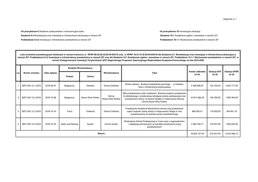 Załącznik nr 1 Oś priorytetowa 6 Solidarne społeczeństwo I konkurencyjne kadry Oś priorytetowa 10 Innowacyjna edukacja Działanie 6.4 Rewitalizacja oraz inwestycje w infrastrukturę edukacyjną w ramach ZIT Działanie 10.1 Kszatłcenie ogólne I zawodowe w ramach ZIT Poddziałanie 6.4.2 Inwestycje w infrastrukture przedszkolną w ramach ZIT Poddziałanie 10.1.1 Wychowanie przedszkolne w ramach ZIT Lista wniosków preselekcyjnych złożonych w ramach konkursu nr RPKP.06.04.02-IZ.00-04-053/16 oraz nr RPKP.10.01.01-IZ.00-04-054/16 dla Działania 6.4 Rewitalizacja oraz inwestycje w infrastrukturę edukacyjną w ramach ZIT, Poddziałania 6.4.2 Inwestycje w infrastrukturę przedszkolną w ramach ZIT oraz dla Działania 10.1 Kształcenie ogólne i zawodowe w ramach ZIT, Poddziałania 10.1.1 Wychowanie przedszkolne w ramach ZIT, w ramach Zintegrowanych Inwestycji Terytorialnych (ZIT) Regionalnego Programu Operacyjnego Województwa Kuajwsko-Pomorskiego na lata 2014-2020 Siedziba Wnioskodawcy Lp. Numer wniosku Data wpływu Powiat Gmina Wnioskodawca Tytuł Kwota całkowita (w zł) Dotacja EFS (w zł) Dotacja EFRR (w zł) 1 BZIT.042.12.1.2016 2016-09-27 Bydgoszcz Osielsko Gmina Osielsko Kraina zabawy. Budowa przedszkola gminnego w Osielsku wraz z infrastrukturą towarzyszącą. 5 368 888,97 152 700,00 3 902 777,00 2 BZIT.042.12.2.2016 2016-10-06 Bydgoszcz Nowa Wieś Wielka Gmina Nowa Wieś Wielka Mali przedszkolacy duże możliwości. Budowa budynku przedszkola 6-oddziałowego z przebudową istniejącej szkoły podstawowej oraz utwardzeniem terenu na terenie działek w miejscowości Brzoza Gmina Nowa Wieś Wielka 10 031 586,29 100 300,00 1 982 300,00 3 BZIT.042.12.3.2016 2016-10-10 Toruń Chełmża Gmina Chełmża Przedszkole Akademia Milusińskich-remont oraz przebudowa części budynku starej szkoły w miejscowości Skępe w celu przystosowania do potrzeb punktu przedszkolnego 886 505,01 119 000,00 394 901,15 4 BZIT.042.12.4.2016 2016-10-10 Nakło nad Notecią Szubin Gmina Szubin Rozbudowa Szkoły Podstawowej w Turze wraz z wyposażeniem i adaptacją pomieszczeń na potrzeby świadczenia usług przedszkolnych 3 365 756,77 143 937,00 1 963 620,00 19 652 737,04 515 937,00 8 243 598,15 Razem: