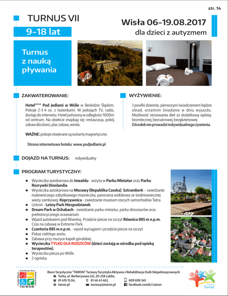 str. 14 TURNUS VII 9-18 lat Wisła 06-19.08.2017 dla dzieci z autyzmem Turnus z nauką pływania WYŻYWIENIE: ZAKWATEROWANIE: Hotel*** Pod Jedlami w Wiśle w Beskidzie Śląskim. Pokoje 2-3-4 os. z łazienkami. W pokojach TV, radio, dostęp do internetu. Hotel położony w odległości 1000m od centrum. Na obiekcie znajdują się: restauracja, pokój zabaw dla dzieci, plac zabaw, winda. 3 posiłki dziennie, pierwszym świadczeniem będzie obiad, ostatnim śniadanie w dniu wyjazdu. Możliwość stosowania diet za dodatkową opłatą: bezmlecznej, bezcukrowej, bezglutenowej. Ośrodeknie prowadzi indywidualnego żywienia. WAŻNE: pokoje otwierane są na kartymagnetyczne. Strona internetowa hotelu: www.podjedlami.pl DOJAZD NA TURNUS: indywidualny PROGRAM TURYSTYCZNY: l l l l l l l l l l l Wycieczka autokarowa do Inwałdu - wizyta w Parku Miniatur oraz Parku Rozrywki Dinolandia. Wycieczka autokarowa na Morawy (Republika Czeska): Sztramberk – zwiedzanie malowniczego zabytkowego miasteczka, panorama widokowa ze średniowiecznej wieży zamkowej; Koprzywnica - zwiedzanie muzeum starych samochodów Tatra. Ustroń - Leśny Park Niespodzianek. Dream Park w Ochabach - zwiedzanie parku miniatur, parku dinozaurów oraz prehistorycznego oceanarium. Wjazd autokarem pod Równicę. Przejście piesze na szczyt Równica 885 m n.p.m. Czas na zabawę w Extreme Park. Czantoria 885 m n.p.m. - wjazd wyciągiem i przejście piesze na szczyt. Pokaz ciekłego azotu. Zabawa przy muzyce kapeli góralskiej. Wycieczka TYLKO DLA RODZICÓW (dzieci zostają w ośrodku pod opieką terapeutów). Wycieczka piesza po Wiśle. 2 ogniska. Biuro Turystyczne "TAIRON" Turnusy Turystyka Aktywna i Rehabilitacja Osób Niepełnosprawnych Turka, ul. Berberysowa 2/2, 20-258 Lublin, 81 476 15 04, 81 46 43 463, 609 699 345 tairon.pl [email protected] facebook.com/b.t.tairon str. 15 PROGRAM TERAPEUTYCZNY TURNUSU: Zajęcia prowadzą terapeuci ze Stowarzyszenia „Wspólny Świat” z Białej Podlaskiej ZAJĘCIA GRUPOWE (grupy 4 os.) 1 godz. dziennie (łącznie 10 godz. na turnusie). Połączenie terapii pedagogicznej i ruchowej z elementami integracji sensorycznej. W czasie tych zajęć będą również wykorzystywane techniki treningu umiejętności społecznych (TUS) – ćwiczenia zdolności komunikacyjnych, przestrzegania zasad społecznych, rozwijanie umiejętności zabaw i gier. W ramach zajęć prowadzona będzie również terapia psychologiczna: redukcja zachowań trudnych, a także trening teorii umysłu. MUZYKOTERAPIA (grupy 4 os.) 1 godz. dziennie (łącznie 10 godz. na turnusie). Terapia, której celem jest stymulowanie rozwoju komunikacji, funkcji społecznych i poznawczych poprzez wielostronną aktywność inspirowaną muzyką. Metody stosowane w terapii to metoda zabawowo – naśladowcza, pedagogika zabawy i metoda Ruchu Rozwijającego Weroniki Sherborne, które mają na celu integrację grupy. Podczas muzykoterapii wprowadza się w świat wartości estetycznych, rozwija się ekspresję oraz zdolności muzyczne takie jak śpiew, poczucie rytmu i umiejętność gry na instrumentach. W czasie tych zajęć wykorzystywane są również techniki muzykoterapii kreatywnej , neurologicznej, aktywnego słuchania, Metody Dobrego Startu. Podczas terapii stosuje się program Knillów i metody relaksacji dr Macieja Kieryła. ZAJĘCIA INDYWIDUALNE Z LOGOPEDĄ 30 min. co drugi dzień (łącznie 2,5 godz. na turnusie). ZAJĘCIA INDYWIDUALNE Z ARTETERAPII 30 min. co drugi dzień (łącznie 2,5 godz. na turnusie). WIECZORNE ZAJĘCIA GRUPOWE (grupy 8 os.) 30 min. dziennie (łącznie 4 godz. na turnusie). NAUKA PŁYWANIA - wyjazdy na kryty basen do Skoczowa 30 min. dziennie (łącznie 5 godz. na turnusie). Zajęcia odbywają się od poniedziałku do piątku (10 dni na turnusie). Turnus dla 32 dzieci objętych terapią + opiekunowie CENA TURNUSU: Rodzina (2 os.): 5550 zł, w tym: Dziecko objęte terapią: 3550 zł Opiekun dziecka: 2000 zł Dodatkowa osoba w wieku powyżej 12 lat: 1800 zł Dodatkowe dziecko w wieku 4-11: 1450 zł Dodatkowe dziecko w wieku 4-11, bez własnego łóżka: 1150 zł Dodatkowe dziecko do lat 3, bez świadczeń: gratis Dopłata do diety bezcukrowej: 75 zł /os./turnus Dopłata do diety bezmlecznej: 75 zł /os./turnus Dopłata do diety bezglutenowej: 125 zł /os./turnus Istnieje możliwość dodatkowego ubezpieczenia od kosztów rezygnacji z turnusu. Biuro Turystyczne "TAIRON" Turnusy Turystyka Aktywna i Rehabilitacja Osób Niepełnosprawnych Turka, ul. Berberysowa 2/2, 20-258 Lublin, 81 476 15 04, 81 46 43 463, 609 699 345 tairon.pl [email protected] facebook.com/b.t.tairon Niniejsza propozycja nie stanowi oferty w rozumieniu przepisów Kodeksu Cywilnego.