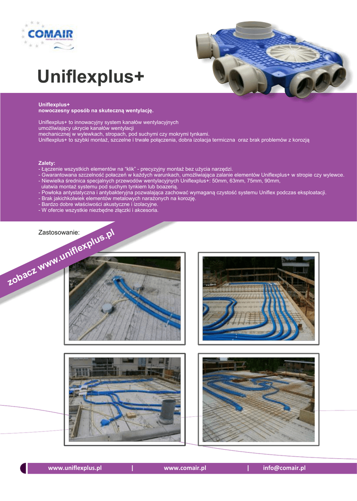 Uniflexplus+ Uniflexplus+ nowoczesny sposób na skuteczną wentylację. Uniflexplus+ to innowacyjny system kanałów wentylacyjnych umożliwiający ukrycie kanałów wentylacji mechanicznej w wylewkach, stropach, pod suchymi czy mokrymi tynkami. Uniflexplus+ to szybki montaż, szczelne i trwałe połączenia, dobra izolacja termiczna oraz brak problemów z korozją Zalety: - Łączenie wszystkich elementów na “klik” - precyzyjny montaż bez użycia narzędzi. - Gwarantowana szczelność połaczeń w każdych warunkach, umożliwiająca zalanie elementów Uniflexplus+ w stropie czy wylewce. - Niewielka średnica specjalnych przewodów wentylacyjnych Uniflexplus+: 50mm, 63mm, 75mm, 90mm, ułatwia montaż systemu pod suchym tynkiem lub boazerią. - Powłoka antystatyczna i antybakteryjna pozwalająca zachować wymaganą czystość systemu Uniflex podczas eksploatacji. - Brak jakichkolwiek elementów metalowych narażonych na korozję. - Bardzo dobre właściwości akustyczne i izolacyjne. - W ofercie wszystkie niezbędne złączki i akcesoria. l Zastosowanie: le nif acz b zo .p lus xp w.u w w www.uniflexplus.pl | www.comair.pl | [email protected] dystrybucja powietrza w systemach wentylacji mechanicznej INFORMACJE TECHNICZNE: Wymiary: Średnica D zewnętrzna D wewnętrzna [mm] [mm] DN 50 51 41 DN 63 64 54 DN 75 76 64 DN 90 91 78 Wydajność: DN 50 DN 63 DN 75 DN 90 2m/s 2,5m/s 3m/s 2m/s 2,5m/s 3m/s 2m/s 1 kanał 10m³/h 12,5m³/h 15m³/h 15m³/h 20m³/h 25m³/h 22m³/h 28m³/h 34m³/h 2 kanały 20m³/h 25m³/h 30m³/h 30m³/h 40m³/h 50m³/h 44m³/h 56m³/h 68m³/h 3 kanały 30m³/h 37,5m³/h 45m³/h 45m³/h 60m³/h 75m³/h 2m/s 2,5m/s 3m/s 34m³/h 2,5m/s 3m/s 42m³/h 51m³/h 7,6 10,0 12,6 4,0 5,6 8,4 2,6 4,0 6,0 2,6 4,0 5,4 15,2 20,0 25,2 8,0 11,2 16,8 5,2 8,0 12,0 5,2 8,0 10,8 22,8 30,0 37,8 12,0 16,8 25,2 7,8 12,0 18,0 7,8 12,0 16,2 30,4 40,0 50,4 16,0 22,4 33,6 10,4 16,0 24,0 10,4 16,0 21,6 38,0 50,0 63,0 20,0 28,0 42,0 13,0 20,0 30,0 13,0 20,0 27,0 45,6 60,0 24,0 33,6 50,4 15,6 24,0 36,0 15,6 24,0 32,4 58,8 53,2 28,0 39,2 18,2 28,0 42,0 18,2 28,0 37,8 60,8 32,0 44,8 20,8 32,0 48,0 20,8 32,0 43,2 50,4 23,4 36,0 54,0 23,4 36,0 48,6 36,0 Opór (Pa) 25 kanał DN 50mm 20 15 kanał DN 63mm 10 kanał DN 75mm opór (Pa/m) Długość kanału w metrach WYDAJNOŚĆ w m³/h przy: 5 kanał DN 90mm 0 0 5 10 wydajność (m³/h) www.uniflexplus.pl | 15 20 25 30 www.comair.pl 35 40 45 | 50 [email protected] dystrybucja powietrza w systemach wentylacji mechanicznej Uniflexplus+ kompletny system dystrybucji powietrza 1038 Ø 63 Uniflexplus+ Kanały wentylacyjne z tworzywa sztucznego 1440000 | FS63B grupa rabatowa | Ø63mm - L = 50m cena netto A € 150,00 1038 Anemostat nawiewny z kolektorem/trójnikiem - 75m³/h - 3x Ø63mm - 125mm 90° 1113300 | TVC180-63R | z króćcem długości 180mm A € 272,00 1113302 | TVC50-63R | z króćcem długości 50mm A € 272,00 1113305 | TVC70-63R | z króćcem długości 70mm A € 272,00 1038 Anemostat wywiewny z kolektorem/trójnikiem - 75m³/h - 3x Ø63mm - 125mm 90° 1113301 | AVC180-63B | z króćcem długości 180mm A € 269,00 1113303 | AVC50-63B | z króćcem długości 50mm A € 269,00 1113305 | AVC70-63B | z króćcem długości 70mm A € 269,00 1038 Kratka ścienna ze skrzynką rozprężną - 75m³/h - 3x Ø63mm 1113072 | MCVB63 | lamele sztywne, podłączenie z góry A € 280,00 1113074 | MCIB63 | lamele ruchome, podłączenie z góry A € 265,00 1113076 | MCVA63 | lamele sztywne, podłączenie z tyłu A € 280,00 1113078 | MCIA63 | lamele ruchome, podłączenie z tyłu A € 265,00 www.uniflexplus.pl | www.comair.pl | [email protected] dystrybucja powietrza w systemach wentylacji mechanicznej Uniflexplus+ kompletny system dystrybucji powietrza 1038 Ø 63 Uniflexplus+ NOWOŚĆ! super płaski kolektor Kolektor główny superpłaski Ø180 mm - 18x Ø63mm, wysokość H=80mm grupa rabatowa 1114066 | TVG-63-80 | podłączenie z boku cena netto A € 175,00 1038 Kolektor główny tradycyjny Ø180mm - 18x Ø63mm, wysokość H=100mm 1113011 | HVBO-63 | podłączenie z dołu A € 175,00 1113066 | HVBZ-63 | podłączenie z boku A € 175,00 1113015 | HVZG-63 | z tłumikiem, podłączenie z boku A € 387,00 1113016 | HVOG-63 | z tłumikiem, podłączenie z dołu A € 387,00 NOWOŚĆ! super płaski kolektor 1038 Kolektor pośredni superpłaski Ø180mm - 12x Ø63mm, wysokość H=80mm 1114067 | TVGS-63-80 | podłączenie z boku A € 150,00 1038 Kolektor pośredni tradycyjny Ø180mm - 9x Ø63mm, wysokość H=100mm 1113167 | SVBZ-63 | podłączenie z boku A € 150,00 1113088 | SVZL-63 | podłączenie z boku, +kanał płaski A € 125,00 1113117 | SVZG-63 | z tłumikiem, podłączenie z boku A € 387,00 1113118 | SVOG-63 | z tłumiekiem, podłączenie z dołu A € 387,00 dystrybucja powietrza w systemach wentylacji mechanicznej Uniflexplus+ kompletny system dystrybucji powietrza 1038 Ø 75 Uniflexplus+ Kanały wentylacyjne z tworzywa sztucznego 1440015 | FS75B grupa rabatowa | Ø75mm - L = 50m cena netto A € 225,00 1038 Anemostat nawiewny z kolektorem/trójnikiem - 80m³/h - 2x Ø75mm - 125mm 90° 1113370 | TVC180-75R | z króćcem długości 180mm A € 272,00 1113372 | TVC50-75R | z króćcem długości 50mm A € 272,00 1113374 | TVC70-75R | z króćcem długości 70mm A € 272,00 1038 Anemostat wywiewny z kolektorem/trójnikiem - 80m³/h - 2x Ø75mm - 125mm 90° 1113371 | AVC180-75B | z króćcem długości 180mm A € 269,00 1113373 | AVC50-75B | z króćcem długości 50mm A € 269,00 1113375 | AVC70-75B | z króćcem długości 70mm A € 269,00 1038 Kratka ścienna ze skrzynką rozprężną - 68m³/h - 2x Ø75mm 1113073 | MCVB75 | lamele sztywne, podłączenie z góry A € 280,00 1113075 | MCIB75 | lamele ruchome, podłączenie z góry A € 265,00 1113077 | MCVA75 | lamele sztywne, podłączenie z tyłu A € 280,00 1113079 | MCIA75 | lamele ruchome, podłączenie z tyłu A € 265,00 www.uniflexplus.pl | www.comair.pl | [email protected] dys