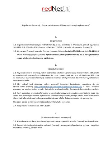 Regulamin Promocji „Kupon rabatowy na 8% wartości usługi wykończenia” 1. [Organizator] 1.1 Organizatorem Promocji jest redNet Dom Sp. z o.o., z siedzibą w Warszawie, przy ul. Dywizjonu 303 129b, NIP: 632-19-28-743, kapitał zakładowy: 774 000 PLN (dalej „Organizator Promocji”). 1.2 Adresatami Promocji są osoby fizyczne i prawne, które od dnia 24.03.2015 r. do dnia 30.04.2015 (Okres Promocji) podpiszą umowę wykończeniową z firmą redNet Dom Sp. z o.o. na wykończenie całego lokalu mieszkaniowego, bądź domu. 2. [Zasady Promocji] 2.1 Aby wziąć udział w promocji, należy pobrać kod rabatowy uprawniający do skorzystania z 8% zniżki na usługi wykończeniowe firmy redNet Dom Sp. z o.o., mieszczącej się przy ul. Dywizjonu 303 129b w Warszawie (www.rednetdom.pl). Zniżka nie obejmuje oferty mieszkań do 30 m kw. wykańczanych w programie BASIC. 2.2 Aby pobrać kod rabatowy, należy wypełnić formularz kontaktowy znajdujący się na stronie www promocji http://rednetdom.pl/zamieszkaj-w-gotowym-mieszkaniu – kod zostanie przesłany na podany adres e-mail. Kod należy przekazać redNet Dom przed skorzystaniem z usługi. 2.3 Kod i pozostałe promocje oferowane w okresie obowiązywania powyższej promocji nie łączą się. Jeden kod promocyjny można wykorzystać tylko raz i dotyczy tylko jednego lokalu. Jeden klient może skorzystać tylko z jednego kodu w przypadku jednego lokalu. Kody promocyjne nie sumują się. Na jeden adres e-mail kupon może zostać wysłany tylko jeden raz. 2.4 Kody można realizować do 30.04.2015r. 3. [Przetwarzanie danych osobowych] 3.1 Administratorem danych osobowych przekazywanych przez Uczestnika Promocji jest Organizator. 3.2 Danymi niezbędnymi do celów realizacji Promocji i postanowień Regulaminu są: imię i nazwisko Uczestnika Promocji, adres e-mail. 3.3 Zgodnie z ustawą z dnia 18.07.2002r. o świadczeniu usług drogą elektroniczną (Dz.U. Nr 144, poz.1204 z późn. zm.), Uczestnik Promocji wyraża zgodę na otrzymywanie informacji handlowych o produktach lub usługach Administratora i podmiotów świadczących usługi powiązane z produktami Administratora za pomocą środków komunikacji elektronicznej. 3.4 Dane osobowe Uczestników mogą być udostępniane podmiotom współpracującym z Organizatorem przy realizacji Promocji. 3.5 Podanie danych osobowych jest dobrowolne jednakże niezbędne dla wzięcia udziału w Promocji i otrzymania kodu rabatowego. 3.6 Osoba, której dane dotyczą, ma prawo wglądu do treści swoich danych osobowych oraz ich poprawiania. 4. [Postępowanie reklamacyjne] 4.1 Wszelkie reklamacje dotyczące Promocji Uczestnicy mogą zgłaszać za pomocą wiadomości e-mail na adres [email protected] 4.2 Reklamacja powinna zawierać: imię, nazwisko, dokładny adres Uczestnika jak również dokładny opis i powód reklamacji. 4.3 Reklamacje rozpatrywane będą przez Organizator Promocji w terminie 7 dni od daty ich otrzymania. 4.4 Reklamacja rozpatrywane będą na podstawie Regulaminu i powszechnie obowiązujących przepisów prawa. 4.5 O decyzji Organizatora w przedmiocie reklamacji Uczestnik zostanie powiadomiony za pośrednictwem wiadomości e-mail, wysłanej na adres podany w reklamacji. 5. [Postanowienia końcowe] 5.1 Regulamin Promocji dostępny jest na stronie www.rednetdom.com/kontakt. 5.2 Przed wzięciem udziału w Promocji, Uczestnik powinien zapoznać się z niniejszym Regulaminem. Wzięcie udziału w Promocji oznacza zapoznanie się z postanowieniami niniejszego Regulaminu. 5.3 Organizator Promocji zastrzega sobie prawo do wprowadzania zmian w Regulaminie z ważnych powodów, którymi są: przedłużenie lub skrócenie okresu trwania Promocji, zmiany przedmiotu Promocji, ważne przyczyny ekonomiczne lub marketingowe leżące po stronie Organizator Promocji. Zmiana Regulaminu nie ma wpływu na prawa uprzednio nabytych przez Uczestników.