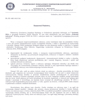 płŃsrwowy powrłrołw INspEKToR SANITARNy r'vGOLENIOWiE Tel. 9U4l8 23 - l00 Goleniów 9ll4l8- 23 - 22 e-mailpssągolenioł[email protected] ul. Pocztowa 36,72 22, 4l&31-95 Frx Golenióu dnia 30,03.20l5 r. PS. PZ- 48l1-0l/1/l6 Szanowni Państwo, Palistwowy Powiatowy Inspektor Sanitamy w Goleniowię uprzejmie infbrmuje. że 7 kwi€tnia 2016 r. prżypada swiatowy Dzień Zdrorłia. W tym roku obchodzony jest pod hasłem ,,Pokonaj cukrzycę". Według prognoz wHo do 2030 r. cukzyca stanie się 7 najczęściej występującą pTzyczyną zgonów. Wraz z rosnącym rozpowszechnieniem cukzycy, coraz wżniejsz€ staje §ię posiadanie wiedzy o tym, jak można zmiŃmalizować ryzyko wystą)ienia choroby, a także o sposobach jej wyĘwania i leczetria. Dlatego WHo podęjmuję działania mającę na celu promocję wiedzy o cukzycy w mmach obchodów Sńatowego Dnia Zdrowia. Organizując wydarzenia zwiąule ze Sł,iatowym Dniem Zdrowia 2016, WHO pragnie: doprowadzić do zwiększenia wiedzy o rosnącym rozpowszechnieniu cukzycy, ogromnym obciążeniu tą chorobą i jej poważnych następstwach. zwlaszłza w krajach o ni§kich i średnich dochodach; spowodować podjęcie konkretnych. skutecznych i ekonomicznych dzialŃ w walce z chorobą jak profilaktykę, któIe bęą obejmować zarówno i metody diagnozy, leczenia i opieki nad osobarni chor},rni na cukzycę; ogłosić pięrwszy śWiatowy raport o cŃrzycy opisujący obciążenie chorobą i jej skutki oraz wzywający do wzrnocnienia systemów ochrony zdrowia w celu zapewnienia lepszego nadzoru i profi laktyki cukzycy olaz skutęcżnięj§żęgo leczerria chorych, Niemal 350 mln. osób na całym świecie cierpi na cukrzycę - chorobę przewlekłą do której dochodzi, gdy organizm nie w)4warza wystarcżająpej ilościinsuliny lub nie jest w stanie §kutecznie wykoźyst}rłaćwłasnej insuliny w procesie metabolizmu cŃrów pochodzących ze spoż}.łanej ź}ałności.Insulina to homon regulujący poziom cukru we klwi, będącego Łódłem energii potrzebnej nam do żTcia, Jeżeli glukoza nie może przeniknąć do komórek organizmu, w których jest spalana jako energia i pozostaje w krwiobiegu, jej stęźenie może wzrastać do szkodliwęgo poziomu. W 2012 r. cukrzyca była bezpośrednią przycz5mą około 1,5 mln, zgonów na śł\,ięcię,ż których 80% miało miejsce w pństwach o niskich i średnich dochodach, Rożróźniamy dwa główne typy choroby. Osoby cierpiące na cukrzycę typu 1 na ogół nie !)łwa.zają własnej insuliny i dlatego, aby ptzężłć,musżą przyjmować insulinę w fomrie iniekcji. Chorzy na cukrzycę typu 2, którzy stanowią około 90% wszystkich przypadków zachorowń najczęściej w}łwaizają własną insulinę. ale w niewystarczającej ilościlub ich organizm nie jest w stanie jej włŃciwie wykorzyst},\Mać. Osoby chore na cŃrzycę typu 2 na ogół mają nadwagę i prowadzą siedący tryb żrycia. paŃstwowy powrłrowy INspEKToR SANITARNy I GOLENIOłVIE ul. Pocztowr 36, 72 , l0{ Goleniów 'fe..9l/4l8 -23 - 22.4l*3l-g5 Fzx glt4$ -23,22 e-maił:p$e.gol€triorv@pis,gov,pl Długotrwale utrzymujący §ię we knvi wysoki poziom glukozy powoduje uszkodzenie narządów ve*nętrznlch i moZe bić prz}czyną ataku seria, udaru mózgu, niewydolności nerek, impotencji oraz rłpłl,w cukrzycy ,,*iĆi pń*uarą"y"n jo amputac;i Lorczyn. Przy zastoso,wanit właściwegoleczenial mogą cieszyć się typu na cukzycę cierpiące ." ry"i"'.ń.ą" iri"^" zmińmalizować, Ńawet ósoby że Wańo odnotować, we.krwi_ Jńfm zyciem"w zdrowiu. jeżeli będą ściślekontrolować poziom cukru jedną jako o cel zmniejszenie <*lil aoionJ i.totn"go kroiu * *ul"e , epidemią cukrzycy, przyjmując 201i0 r, w ramach Celów do cukrzycy. w tym i.""iąii"rty zgonói z powodu chorób niezakaźnych, polityki mające na celu wdlażają,ę R"zwoju. W zwią,zku z tym WHO wspierapaństwa układu chorób łni"j.r"ni" o?działywania choń niezakźnyclr. w tym cukzycy, nowotwolów, krą2enia i pfuc. Ż;;";;ńó Infomuję, także, że wszelkię informacje oraz mateńaly prżygoto\łane przez Światową organizację Zdrowia dostępne sąpod poniższymi linkami: 0l5/1 inótiuitv-und-diub"rę"- ośu,iadczenic dotyczące obciążęnia cukzycą w ELlropejskim Regionie WHO llttp://*ww.who,int/campaigns/rł,orld-health-day/20 1 6/evcnt/en/ http://www.un,org/press/en/20 1 5/sgsnl 1 7320,doc.htm pań§twowv poYJialowy lrBp9lror nv Golb/rowie dI n. nĘd- 9ożena s Ewa Marcnkor'sha