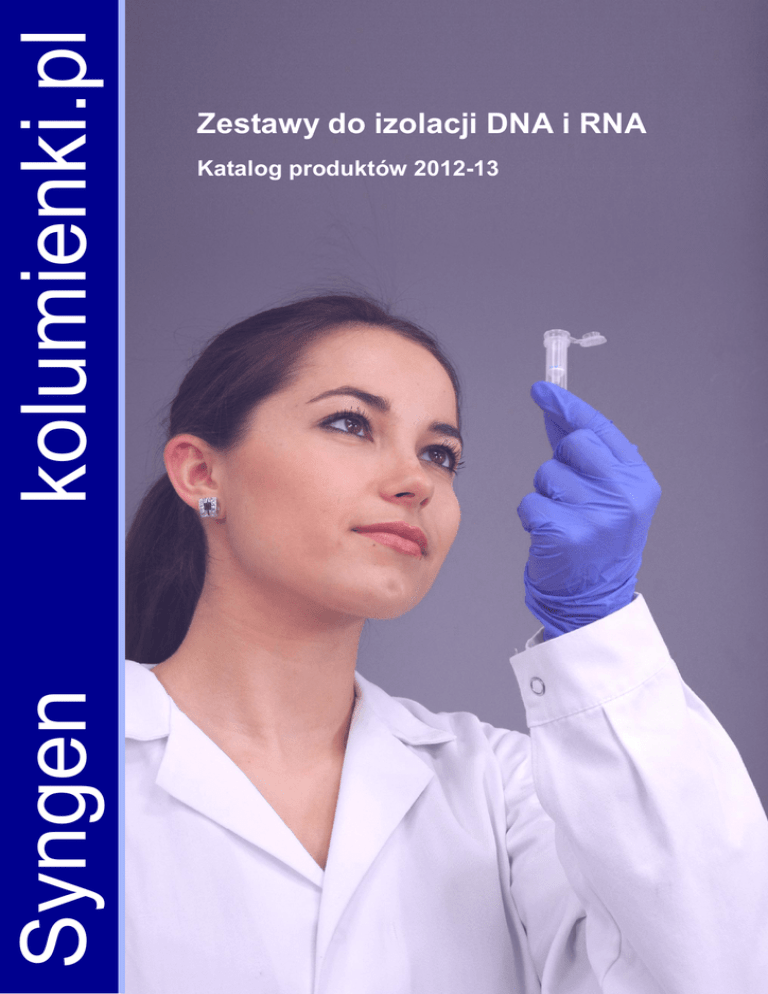 kolumienki.pl Syngen Gotowe zestawy do izolacji i oczyszczania kwasów nukleinowych Zestawy do izolacji DNA i RNA Katalog produktów 2012-13 kolumienki.pl Gotowe zestawy do izolacji i oczyszczania kwasów nukleinowych Syngen Biotech Sp. z o.o., 54-116 Wrocław, ul. Ostródzka 13 www.kolumienki.pl; [email protected]; Tel. +4871 349-70-13, 71 349 91 66, 71349 91 67; faks +4871 349 70 33 kolumienki.pl Gotowe zestawy do izolacji i oczyszczania kwasów nukleinowych Spis treści Wprowadzenie 4 Izolacja genomowego DNA Syngen Blood/Cell DNA Kit Syngen Tissue DNA Kit Syngen Plant DNA Kit Syngen Soil/Stool DNA Kit Izolacja RNA 5-8 5 6 7 8 9-12 Syngen Blood/Cell RNA Kit Syngen Tissue RNA Kit Syngen Plant RNA Kit Syngen Viral Kit Oczyszczanie DNA/RNA 9 10 11 12 13-15 Syngen gDNA/RNA clean-up Kit Syngen Gel/PCR Purification Kit Syngen PCR/Gel ME Purification Kit 13 14 15 Oczyszczanie plazmidowego DNA 16-19 Syngen Plasmid Mini i Maxi SPIN Kit Syngen Plasmid Midi Kit Syngen Plasmid Maxi Kit 16 17 18 Przewodnik po zestawach serii Syngen® 20 kolumienki.pl – strona 3 Gotowe zestawy do izolacji i oczyszczania kwasów nukleinowych Wprowadzenie Dziękujemy za wybór zestawów serii Syngen i okazane nam zaufanie. Produkty marki Syngen to wysokiej jakości zestawy odczynników do izolacji DNA i RNA, wirusowych kwasów nukleinowych, plazmidowego DNA, do doczyszczania i zagęszczania DNA lub RNA, z różnego rodzaju próbek, takich jak świeża i mrożona krew, surowica, osocze, płyny ustrojowe (np. płyn mózgowo-rdzeniowy, popłuczyny oskrzelowe), wymazówki, hodowle komórkowe, tkanki, tkanki FFPE, hodowle bakteryjne, tkanki roślinne, próbki ziemi i inne. Zastosowana technologia wykorzystująca technikę chromatografii na złożu krzemionkowym lub technikę chromatografii na złożu jonowymiennym wraz z unikalnym systemem buforów i zoptymalizowanymi protokołami izolacji gwarantuje, że uzyskany materiał genetyczny jest wysokiej czystości, jaka jest wymagana do zastosowań między innymi w technikach real-time PCR i microarray. W przypadku pytań pozostajemy do Państwa dyspozycji. Życzymy sukcesów w pracy z zestawami Syngen. Zespół Syngen Biotech Ograniczenia Zestawy serii Syngen są przeznaczone wyłącznie do użytku laboratoryjnego. Nie będą uwzględniane żadne roszczenia wynikające z użycia zestawu do diagnozowania lub leczenia chorób. kolumienki.pl – strona 4 Gotowe zestawy do izolacji i oczyszczania kwasów nukleinowych Syngen Blood/Cell DNA Kit Zestaw do izolacji genomowego i mitochondrialnego DNA - izolacja DNA ze świeżej lub mrożonej krwi, surowicy, osocza, płynów ustrojowych (np. płyn mózgowo-rdzeniowy), kożuszka limfocytarnego, wymazów, kultur komórkowych, - szybka i wydajna izolacja, do 50 µg* gDNA lub do 500 µg** gDNA, - brak konieczności używania rozpuszczalników organicznych, - bardzo wysoka czystość wyizolowanego DNA, A260/A280 = 1,7-1,9 - gwarancja usunięcia wszystkich inhibitorów reakcji PCR - wyizolowane DNA może być wykorzystane do wszystkich aplikacji: - PCR i real-time PCR - Southern blotting - genotypowanie SNP - analizy metylacyjne Szczegółowy opis Wielkość próbki Typowa wydajność Objętość elucji Proteinaza K Bufor do odtrawiania erytrocytów DLE Nazwa i numer katalogowy Syngen Blood/Cell DNA Mini Kit Syngen Blood/Cell DNA Mini DLE Kit Syngen Blood/Cell DNA Maxi Kit 200µl krwi, 5*106 komórek 300-1000µl krwi, 1*107 komórek 10 ml krwi, 1*108 komórek 4-12 µg DNA z krwi 20-40µg DNA izolacja z kultur komórkowych 6-50 µg DNA izolacja z krwi 25-50µg DNA izolacja z kultur komórkowych 500µg DNA izolacja z krwi 30-200µl 30-200µl 1-2 ml W zestawie - W zestawie W zestawie - SY 223000 Syngen Blood/Cell DNA Mini DLE Kit (300) SY221031 Syngen Blood/Cell DNA Maxi Kit (24) SY221000 Syngen Blood/Cell DNA Mini DLE Kit (100) SY221030 Syngen Blood/Cell DNA Maxi Kit (10) SY221012 Syngen Blood/Cell DNA Mini Kit (300) SY221011 Syngen Blood/Cell DNA Mini Kit (100) SY221010 Syngen Blood /Cell DNA Mini Kit (50) * maksymalna wydajność przy użyciu zestawu serii Mini ** maksymalna wydajność przy użyciu zestawu serii Maxi kolumienki.pl – strona 5 Gotowe zestawy do izolacji i oczyszczania kwasów nukleinowych Syngen Tissue DNA Kit Zestaw do izolacji genomowego i mitochondrialnego DNA - izolacja DNA ze świeżych lub mrożonych tkanek, tkanek FFPE, hodowli komórkowych i bakteryjnych, wymazów, drożdży, grzybów - szybka i wydajna izolacja do 50 µg gDNA - bez konieczności używania rozpuszczalników organicznych - bardzo wysoka czystość wyizolowanego DNA A260/A280 = 1,7-1,9 - gwarancja usunięcia wszystkich inhibitorów reakcji PCR - wyizolowane DNA może być wykorzystane do wszystkich późniejszych aplikacji - PCR i real time PCR - Southern blotting - genotypowanie SNP - badania farmakogenetyczne - analizy metylacyjne Szczegółowy opis Syngen Tissue DNA Mini Kit Wielkość próbki Typowa wydajność Objętość elucji Średni czas izolacji Nazwa i numer katalogowy 25 mg tkanki, 1 cm mysiego ogonka, 5*106 komórek, 5*107 grzybów, 3 ml hodowli drożdży 5-50 µg DNA w zależności od rodzaju próbki 30 - 200µl 20-40 minut w zależności od rodzaju próbki SY241012 Syngen Tissue DNA Mini Kit (300) SY241011 Syngen Tissue DNA Mini Kit (100) SY241010 Syngen Tissue DNA Mini Kit (50) kolumienki.pl – strona 6 Gotowe zestawy do izolacji i oczyszczania kwasów nukleinowych Syngen Plant DNA Kit Zestaw do izolacji genomowego DNA z materiału roślinnego -izolacja DNA z tkanek roślinnych świeżych lub wysuszonych - szybka i wydajna izolacja do 40 µg DNA* lub do 300 µg DNA** - bez konieczności używania rozpuszczalników organicznych - bardzo wysoka czystość wyizolowanego DNA A260/A280 = 1,7-1,9 - gwarancja usunięcia wszystkich inhibitorów reakcji PCR - wyizolowane DNA może być wykorzystane do wszystkich późniejszych aplikacji - PCR i real time PCR - multipleks PCR - RAPD - RFLP, AFLP, southern blotting Szczegółowy opis Syngen Pla