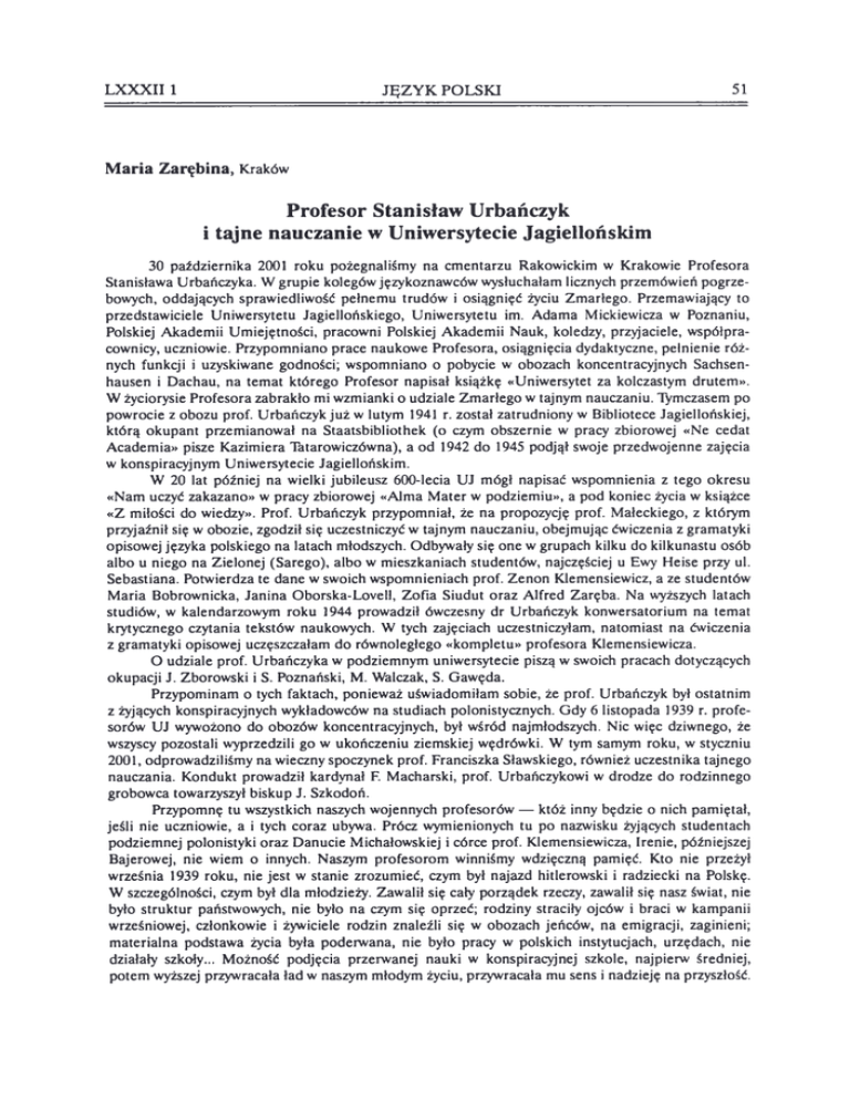 L X X X II1 JĘZYK POLSKI 51 Maria Zarębina, Kraków Profesor Stanisław Urbańczyk i tajne nauczanie w Uniwersytecie Jagiellońskim 30 października 2001 roku pożegnaliśmy na cmentarzu Rakowickim w Krakowie Profesora Stanisława Urbańczyka. W grupie kolegów językoznawców wysłuchałam licznych przemówień pogrze bowych, oddających sprawiedliwość pełnemu trudów i osiągnięć życiu Zmarłego. Przemawiający to przedstawiciele Uniwersytetu Jagiellońskiego, Uniwersytetu im. Adama Mickiewicza w Poznaniu, Polskiej Akademii Umiejętności, pracowni Polskiej Akademii Nauk, koledzy, przyjaciele, współpra cownicy, uczniowie. Przypomniano prace naukowe Profesora, osiągnięcia dydaktyczne, pełnienie róż nych funkcji i uzyskiwane godności; wspomniano o pobycie w obozach koncentracyjnych Sachsen hausen i Dachau, na temat którego Profesor napisał książkę «Uniwersytet za kolczastym drutem». W życiorysie Profesora zabrakło mi wzmianki o udziale Zmarłego w tajnym nauczaniu. Tymczasem po powrocie z obozu prof. Urbańczyk już w lutym 1941 r. został zatrudniony w Bibliotece Jagiellońskiej, którą okupant przemianował na Staatsbibliothek (o czym obszernie w pracy zbiorowej «Ne cedat Academia» pisze Kazimiera Tatarowiczówna), a od 1942 do 1945 podjął swoje przedwojenne zajęcia w konspiracyjnym Uniwersytecie Jagiellońskim. W 20 lat później na wielki jubileusz 600-lecia UJ mógł napisać wspomnienia z tego okresu «Nam uczyć zakazano* w pracy zbiorowej «Alma Mater w podziemiu*, a pod koniec życia w książce «Z miłości do wiedzy*. Prof. Urbańczyk przypomniał, że na propozycję prof. Małeckiego, z którym przyjaźnił się w obozie, zgodził się uczestniczyć w tajnym nauczaniu, obejmując ćwiczenia z gramatyki opisowej języka polskiego na latach młodszych. Odbywały się one w grupach kilku do kilkunastu osób albo u niego na Zielonej (Sarego), albo w mieszkaniach studentów, najczęściej u Ewy Heise przy ul. Sebastiana. Potwierdza te dane w swoich wspomnieniach prof. Zenon Klemensiewicz, a ze studentów Maria Bobrownicka, Janina Oborska-LoveII, Zofia Siudut oraz Alfred Zaręba. Na wyższych latach studiów, w kalendarzowym roku 1944 prowadził ówczesny dr Urbańczyk konwersatorium na temat krytycznego czytania tekstów naukowych. W tych zajęciach uczestniczyłam, natomiast na ćwiczenia z gramatyki opisowej uczęszczałam do równoległego «kompletu» profesora Klemensiewicza. O udziale prof. Urbańczyka w podziemnym uniwersytecie piszą w swoich pracach dotyczących okupacji J. Zborowski i S. Poznański, M. Walczak, S. Gawęda. Przypominam o tych faktach, ponieważ uświadomiłam sobie, że prof. Urbańczyk był ostatnim z żyjących konspiracyjnych wykładowców na studiach polonistycznych. Gdy 6 listopada 1939 r. profe sorów UJ wywożono do obozów koncentracyjnych, był wśród najmłodszych. Nic więc dziwnego, że wszyscy pozostali wyprzedzili go w ukończeniu ziemskiej wędrówki. W tym samym roku, w styczniu 2001, odprowadziliśmy na wieczny spoczynek prof. Franciszka Sławskiego, również uczestnika tajnego nauczania. Kondukt prowadził kardynał F. Macharski, prof. Urbańczykowi w drodze do rodzinnego grobowca towarzyszył biskup J. Szkodoń. Przypomnę tu wszystkich naszych wojennych profesorów — któż inny będzie o nich pamiętał, jeśli nie uczniowie, a i tych coraz ubywa. Prócz wymienionych tu po nazwisku żyjących studentach podziemnej polonistyki oraz Danucie Michałowskiej i córce prof. Klemensiewicza, Irenie, późniejszej Bajerowej, nie wiem o innych. Naszym profesorom winniśmy wdzięczną pamięć. Kto nie przeżył września 1939 roku, nie jest w stanie zrozumieć, czym był najazd hitlerowski i radziecki na Polskę. W szczególności, czym był dla młodzieży. Zawalił się cały porządek rzeczy, zawalił się nasz świat, nie było struktur państwowych, nie było na czym się oprzeć; rodziny straciły ojców i braci w kampanii wrześniowej, członkowie i żywiciele rodzin znaleźli się w obozach jeńców, na emigracji, zaginieni; materialna podstawa życia była poderwana, nie było pracy w polskich instytucjach, urzędach, nie działały szkoły... Możność podjęcia przerwanej nauki w konspiracyjnej szkole, najpierw średniej, potem wyższej przywracała ład w naszym młodym życiu, przywracała mu sens i nadzieję na przyszłość. 52 JĘZYK POLSKI L X X X II1 Coś podobnego musieli przeżyć Amerykanie 11 września 2001 roku po zamachu terrorystycznym na World Trade Center w Nowym Jorku i Pentagon w Waszyngtonie: pożary i zgliszcza, strefa zerowa, śmierć i poszukiwanie najbliższych, zachwianie poczucia bezpieczeństwa. Wyliczam tu kolejne straty osobowe. Daty śmierci poszczególnych profesorów znalazłam w ma teriałach i dokumentach publikacji: «Ne cedat Academia», «Literatura polska. Przewodnik encyklo pedycznym «Złota księga Wydziału Filologicznego UJ», wreszcie zasięgałam informacji w Instytucie Filologii Słowiańskiej UJ. Oto moja lista: W roku 1944, czyli jeszcze w czasie okupacji, zmarł na gruźlicę, której nabawił się w obozie w Sachsenhausen/Oranienburg, doc. Ludwik K a m y k o w s k i . W podziemnym uniwersytecie wykładał literaturę francuskiego i hiszpańskiego Baroku i Oświecenia. Tuż po wojnie, w roku 1946, w wieku 43 lat, odszedł od nas prof. Mieczysław Ma ł e c k i , wię zień obozów koncentracyjnych Sachsenhausen i Dachau. Po powrocie z obozu zorganizował tajne na uczanie na UJ, był za to prześladowany przez władze komunistyczne pod paradoksalnym zarzutem współpracy z okupantem. Wykładał język staro-cerkiewno-slowiański i egzaminował z tego przedmio tu, prowadził też seminaria ze slawistyki. Pochowany w Rabce. W roku 1948 zmarł prof. Zygmunt Z a wi r s k i . Na tajnych kompletach wykładał logikę i filo zofię, egzaminował z nich. W roku 1958 zmarł twórca dialektologii polskiej prof. Kazimierz Ni t s c h, w wieku 84 lat (1874-1958). 
