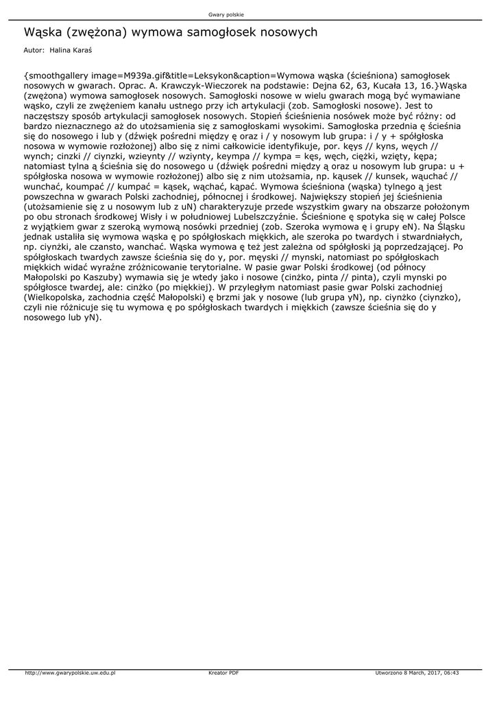 nosowych w gwarach. Oprac. A. Krawczyk-Wieczorek na podstawie: Dejna 62, 63, Kucała 13, 16.}Wąska