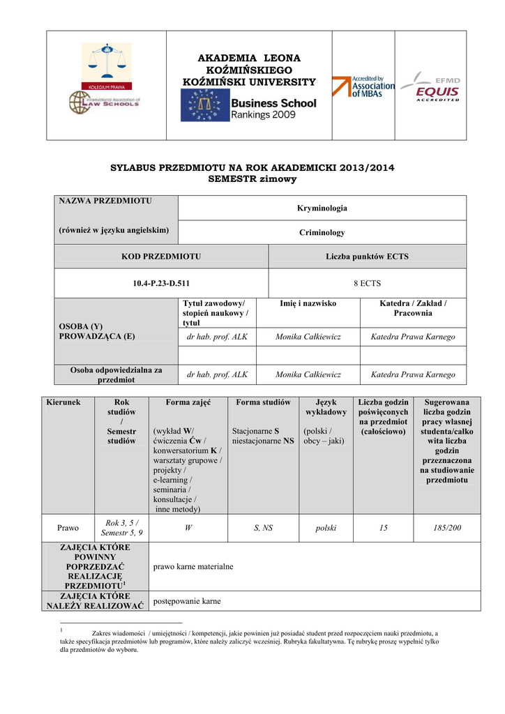 AKADEMIA LEONA KOŹMIŃSKIEGO KOŹMIŃSKI UNIVERSITY SYLABUS PRZEDMIOTU NA ROK AKADEMICKI 2013/2014 SEMESTR zimowy NAZWA PRZEDMIOTU Kryminologia (również w języku angielskim) KOD PRZEDMIOTU Liczba punktów ECTS 10.4-P.23-D.511 8 ECTS OSOBA (Y) PROWADZĄCA (E) Osoba odpowiedzialna za przedmiot Kierunek Prawo Rok studiów / Semestr studiów Rok 3, 5 / Semestr 5, 9 ZAJĘCIA KTÓRE POWINNY POPRZEDZAĆ REALIZACJĘ PRZEDMIOTU1 ZAJĘCIA KTÓRE NALEŻY REALIZOWAĆ 1 Criminology Tytuł zawodowy/ stopień naukowy / tytuł Imię i nazwisko Katedra / Zakład / Pracownia dr hab. prof. ALK Monika Całkiewicz Katedra Prawa Karnego dr hab. prof. ALK Monika Całkiewicz Katedra Prawa Karnego Forma zajęć Forma studiów Język wykładowy (wykład W/ ćwiczenia Ćw / konwersatorium K / warsztaty grupowe / projekty / e-learning / seminaria / konsultacje / inne metody) Stacjonarne S niestacjonarne NS (polski / obcy – jaki) W S, NS polski Liczba godzin poświęconych na przedmiot (całościowo) Sugerowana liczba godzin pracy własnej studenta/całko wita liczba godzin przeznaczona na studiowanie przedmiotu 15 185/200 prawo karne materialne postępowanie karne Zakres wiadomości / umiejętności / kompetencji, jakie powinien już posiadać student przed rozpoczęciem nauki przedmiotu, a także specyfikacja przedmiotów lub programów, które należy zaliczyć wcześniej. Rubryka fakultatywna. Tę rubrykę proszę wypełnić tylko dla przedmiotów do wyboru. JEDNOCZEŚNIE1 ZAŁOŻENIA I CELE PRZEDMIOTU W JĘZYKU POLSKIM (MAX. 300 SŁÓW) Celem przedmiotu jest zapoznanie studentów z podstawowymi zagadnieniami kryminologii i wiktymologii. ZAŁOŻENIA I CELE PRZEDMIOTU W JĘZYKU ANGIELSKIM (MAX. 300 SŁÓW) The purpose of this course is to provide students a basic knowledge of criminology and victimology. TREŚĆ PROGRAMOWA Z podziałem na: wykład, ćwiczenia, konwersatoria, inne. LICZBA GODZIN określona dla poszczególnych treści programowych, w tym odrębnie dla wykładów i zajęć prowadzonych w innych formach TEMAT 1 – Kryminologia jako nauka. 1. Pojęcie kryminologii. 2. Kryminologia a kryminalistyka. 3. Kryminologia a statystyka. 4. Kryminologia a socjologia. 5. Kryminologia a nauka prawa karnego. 2 TEMAT 2 – Teorie kryminologiczne 1. Kryminologia pozytywistyczna 2. Kryminologia antynaturalistyczna 3. Kryminologia neoklasyczna TEMAT 3 – Przestępczość jako zjawisko społeczne 1. Przestępczość ujawniona 2. Przestępczość nieujawniona 2 2 3 TEMAT 4 – Szczególne rodzaje przestępstw 1. Przestępstwa z użyciem przemocy 2. Przestępczość powrotna 3. Przestępczość nieletnich TEMAT 5 – Media a przestępczość 1. Środki masowego przekazu a opinia publiczna. 2. Copycat effect. TEMAT 6 – Profilaktyka kryminalna 1. Strategia zapobiegania przestępczości 2. Kara a zapobieganie przestępczości. 3. Syndrom rozbitych okien. TEMAT 7 – Wiktymologia 1. Pojęcie wiktymologii 2. Ofiara przestępstwa 3. Wiktymizacja RAZEM ILOŚĆ GODZIN: 2 2 2 15 OPIS METOD DYDAKTYCZNYCH Wykład połączony z dyskusją oraz wykorzystaniem takich metod dydaktycznych, jak analiza SWOT. Opis efektów kształcenia (wiedza, umiejętności i inne kompetencje jakie student nabędzie po zrealizowaniu przedmiotu) wiedza umiejętności inne kompetencje Po ukończeniu kursu student: - uzyska podstawową wiedzę z zakresu kryminologii - będzie znał podstawowe pojęcia z zakresu kryminologii i będzie umiał posługiwać się nimi - będzie potrafił umieścić kryminologię w systemie nauk penalnych - będzie umiał wymienić i scharakteryzować podstawowe teorie kryminologiczne - będzie potrafił opisać zjawisko przestępczości w kontekście socjologicznym W trakcie kursu student posiądzie: - umiejętność korzystania ze statystyk: policyjnej, sądowej i penitencjarnej - umiejętność prowadzenia dyskusji na tematy związane z przestępczością i jej zapobieganiem W trakcie kursu student: - nabędzie umiejętność pracy w grupie - nabędzie umiejętność argumentowania i brania udziału w dyskusjach na tematy dotyczące przestępczości - rozwinie postawy etyczne, w tym przede wszystkim poszanowania prawa Sposób sprawdzenia realizacji efektów kształcenia wiedza umiejętności inne kompetencje Wiedza sprawdzona zostanie w trakcie egzaminu. Umiejętność korzystania ze statystyk opisujących przestępczość sprawdzana będzie w trakcie wykładów dotyczących zjawiska przestępczości w Polsce. Umiejętność samodzielnej i krytycznej oceny problemów sprawdzana będzie poprzez branie udziału w dyskusjach na zajęciach i analizach SWOT. Umiejętność pracy w grupie sprawdzona zostanie w czasie wykładów poprzez przygotowywanie w grupach analizy SWOT. Umiejętność argumentowania, wyrażania własnych opinii i postaw etycznych sprawdzana będzie w trakcie zajęć w czasie dyskusji. Ostateczna forma i warunki zaliczenia przedmiotu Egzamin ustny. Przewidywana forma poprawy (o ile inna niż wyżej) LEKTURY OBOWIĄZKOWE DO ZAJĘĆ (zaleca się podawanie do trzech pozycji) LP. 1. 2. 3. AUTOR, TYTUŁ, MIEJSCE I ROK WYDANIA, WYDAWNICTWO J. Błachut, A. Gaberle, K. Krzysztof Krajewski, Kryminologia. Arche, Gdańsk 2007. LEKTURY UZUPEŁNIAJĄCE DO ZAJĘĆ LP. 1. 2. 3. 4. 5. AUTOR, TYTUŁ, MIEJSCE I ROK WYDANIA, WYDAWNICTWO B. Hołyst, Wiktymologia, Lexis Nexis, Warszawa 2011. INNE UWAGI: