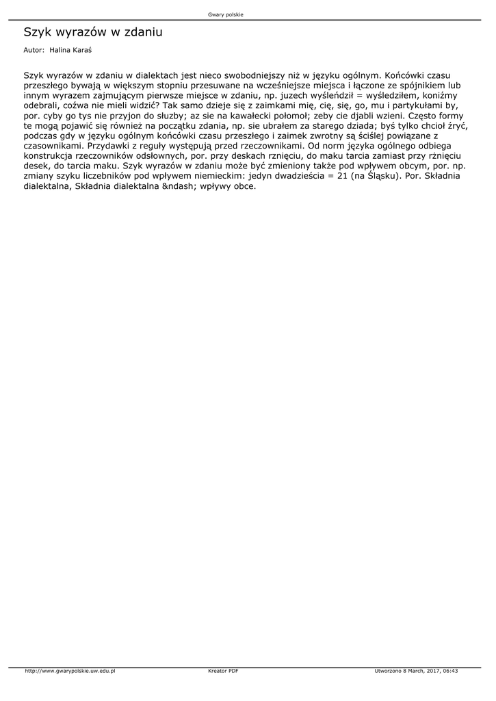 Gwary polskie Szyk wyrazów w zdaniu Autor: Halina Karaś Szyk wyrazów w zdaniu w dialektach jest nieco swobodniejszy niż w języku ogólnym. Końcówki czasu przeszłego bywają w większym stopniu przesuwane na wcześniejsze miejsca i łączone ze spójnikiem lub innym wyrazem zajmującym pierwsze miejsce w zdaniu, np. juzech wyśleńdził = wyśledziłem, koniźmy odebrali, coźwa nie mieli widzić? Tak samo dzieje się z zaimkami mię, cię, się, go, mu i partykułami by, por. cyby go tys nie przyjon do słuzby; az sie na kawałecki połomoł; zeby cie djabli wzieni. Często formy te mogą pojawić się również na początku zdania, np. sie ubrałem za starego dziada; byś tylko chcioł źryć, podczas gdy w języku ogólnym końcówki czasu przeszłego i zaimek zwrotny są ściślej powiązane z czasownikami. Przydawki z reguły występują przed rzeczownikami. Od norm języka ogólnego odbiega konstrukcja rzeczowników odsłownych, por. przy deskach rznięciu, do maku tarcia zamiast przy rżnięciu desek, do tarcia maku. Szyk wyrazów w zdaniu może być zmieniony także pod wpływem obcym, por. np. zmiany szyku liczebników pod wpływem niemieckim: jedyn dwadzieścia = 21 (na Śląsku). Por. Składnia dialektalna, Składnia dialektalna – wpływy obce. http://www.gwarypolskie.uw.edu.pl Kreator PDF Utworzono 8 March, 2017, 06:43