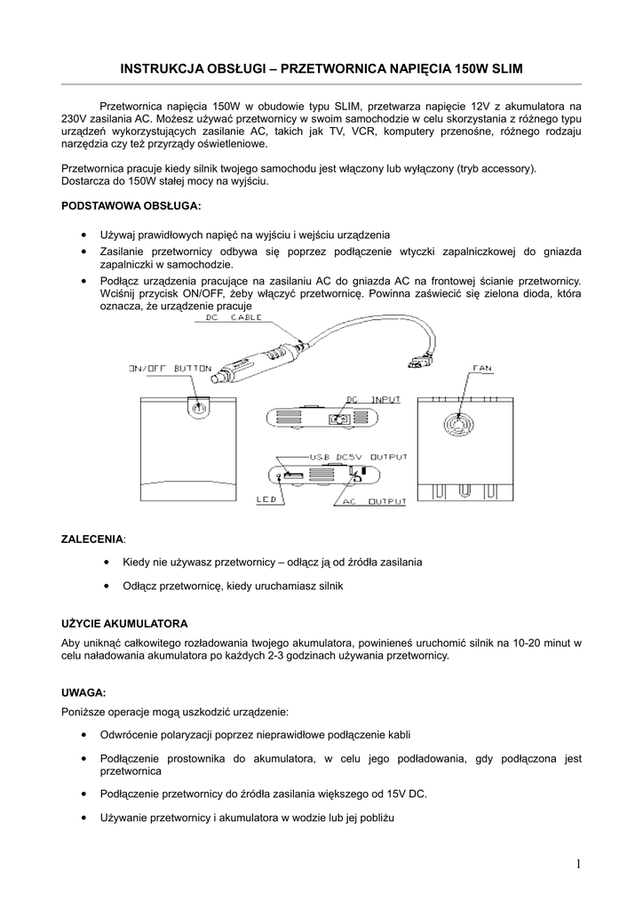 INSTRUKCJA OBSŁUGI – PRZETWORNICA NAPIĘCIA 150W SLIM 1