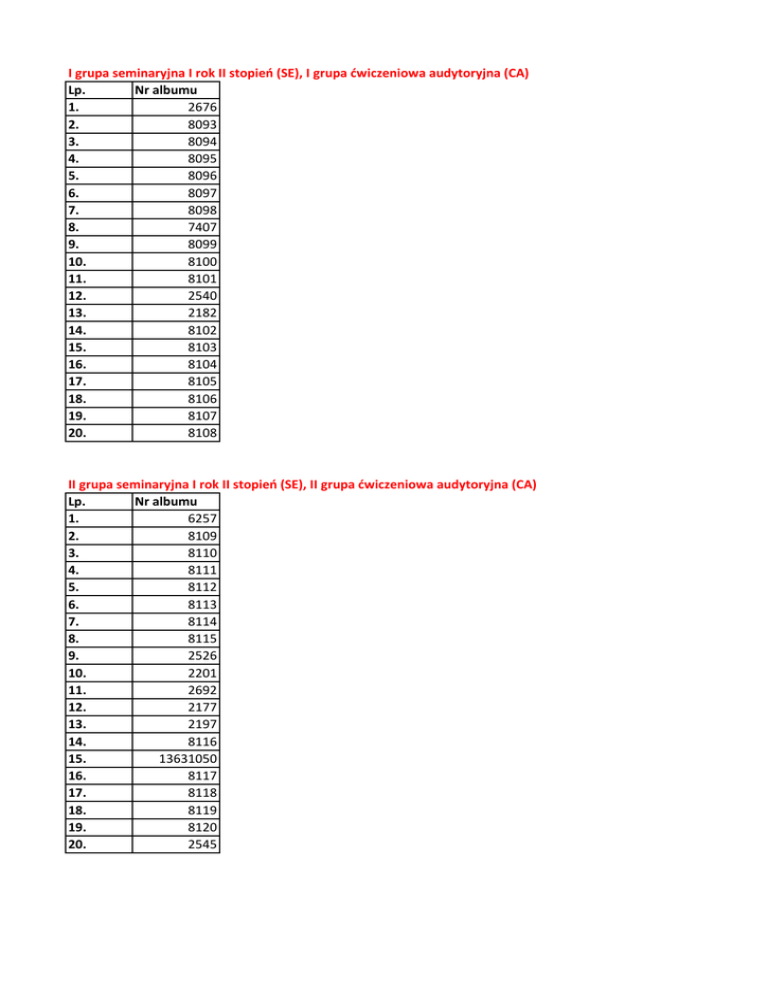 I grupa seminaryjna I rok II stopień (SE), I grupa ćwiczeniowa audytoryjna (CA) Lp. Nr albumu 1. 2676 2. 8093 3. 8094 4. 8095 5. 8096 6. 8097 7. 8098 8. 7407 9. 8099 10. 8100 11. 8101 12. 2540 13. 2182 14. 8102 15. 8103 16. 8104 17. 8105 18. 8106 19. 8107 20. 8108 II grupa seminaryjna I rok II stopień (SE), II grupa ćwiczeniowa audytoryjna (CA) Lp. Nr albumu 1. 6257 2. 8109 3. 8110 4. 8111 5. 8112 6. 8113 7. 8114 8. 8115 9. 2526 10. 2201 11. 2692 12. 2177 13. 2197 14. 8116 15. 13631050 16. 8117 17. 8118 18. 8119 19. 8120 20. 2545