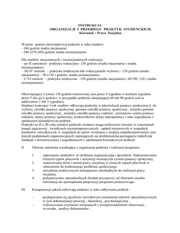 INSTRUKCJA ORGANIZACJI I PRZEBIEGU PRAKTYK STUDENCKICH. Kierunek : Praca Socjalna. Wymiar godzin obowiązkowej praktyki w toku studiów: - 360 godzin studia stacjonarne - 240 (270,360) godzin studia niestacjonarne. Dla studiów stacjonarnych i niestacjonarnych realizacja: - po II semestrze– praktyka wakacyjna- 120 godzin (studia stacjonarne i studia niestacjonarne) - III-IV semestr – praktyka śródroczna lub wakacyjna(do wyboru) - 120 godzin (studia stacjonarne) – 90 (120 ) godzin- studia niestacjonarne - V-VI semestr – praktyka śródroczna - 120 godzin (studia stacjonarne) -60 (90, 120 ) studia niestacjonarne) Obowiązujący wymiar 120 godzin realizowany jest przez 4 tygodnie w każdym tygodniu przez 5 dni po 6 godzin ( w przypadku praktyki obejmującej 60 lub 90 godzin jest to adekwatnie 2 lub 3 tygodnie). Studenci kończący I rok studiów odbywają praktykę w placówkach pomocy społecznej tj. do wyboru: ośrodki pomocy społecznej ,gminne ośrodki pomocy społecznej , miejsko-gminne ośrodki pomocy społecznej , miejskie ośrodki pomocy rodzinie , powiatowe centra pomocy rodzinie, domy pomocy społecznej, środowiskowe domy samopomocy i inne uzgodnione z opiekunem kierunkowym praktyk . Praktyki na II u III roku studiów praktyki studenci mogą realizować również w warsztatach terapii zajęciowej , świetlicach socjoterapeutycznych , sądach rejonowych w zespołach kuratorów zawodowych, w zespołach do spraw orzekania o stopniu niepełnosprawności oraz innych podmiotach organizacyjnych zajmujących się problematyką pomagania (takich jak fundacje i stowarzyszenia ) uzgodnionych z opiekunem kierunkowym praktyk. II Główne założenia wynikające z organizacji praktyki i realizacji programu: 1. 2. 3. 4. III zapoznanie studentów ze strukturą organizacyjną i sposobem funkcjonowania różnych typów placówek i instytucji tworzących system pomocy społecznej zastosowanie form i metod pracy socjalnej w różnych typach placówek w odniesieniu do konkretnego problemu społecznego. utrwalenie praktycznych umiejętności niezbędnych do realizacji pracy socjalnej. podejmowanie samodzielnych działań począwszy od zbierania zasobu informacji do sporządzania propozycji programu pomocowego. Kompetencje jakich nabywają studenci w toku odbywania praktyk : - posługiwania się językiem zawodowym rozumienia tekstów specjalistycznych w tym dokumentacji prawnej , lekarskiej , psychologicznej , wykonywania czynności związanych z przeprowadzeniem obserwacji , wywiadu , analizy dokumentów , IV Dokumentacja praktyk. 1. 2. 3. 4. 5. V opracowania diagnozy społecznej , formułowanie wniosków zastosowanie właściwej formy pomocy , prowadzenia poradnictwa , redagowania pism , prowadzenia mediacji i negocjacji , organizowania w sposób profesjonalny własnego warsztatu pracy . Porozumienie zawarte pomiędzy placówką a uczelnią gwarantujące przyjęcie studenta na praktykę . Skierowanie wydawane na podstawie zawartego porozumienia . Szczegółowy program praktyk opracowany przez opiekuna praktyk . Dziennik praktyk wypełniany przez studenta i potwierdzony przez opiekuna merytorycznego .(studenci studiów stacjonarnych ). Sprawozdanie z realizacji praktyki i zaświadczenie o ich odbyciu po każdej zrealizowanej praktyce (studenci studiów niestacjonarnych). Uwagi końcowe : 1. 2. 3. Warunkiem zaliczenia praktyki (w uczelni ) jest realizacja programu praktyk i określonych w nim zadań i obowiązków. Na podstawie oceny i opinii w dzienniku praktyk wystawionych przez(wyznaczonego przez dyrektora lub kierownika placówki)opiekuna merytorycznego ostatecznego zaliczenia dokonuje opiekun pedagogiczny praktyk . Dla studiów niestacjonarnych zaliczenie odbywa się na podstawie zaświadczenia o odbyciu obowiązkowego wymiaru praktyki i pisemnego sprawozdania z ich przebiegu. Pełną dokumentację z praktyki student jest obowiązany dostarczyć do opiekuna praktyki w wyznaczonym terminie . Opiekun praktyk składa coroczne pisemne sprawozdanie z przebiegu praktyk w terminie wyznaczonym przez Rektora PWSZ w Koninie Opracowanie: mgr Tomasz Naglewski