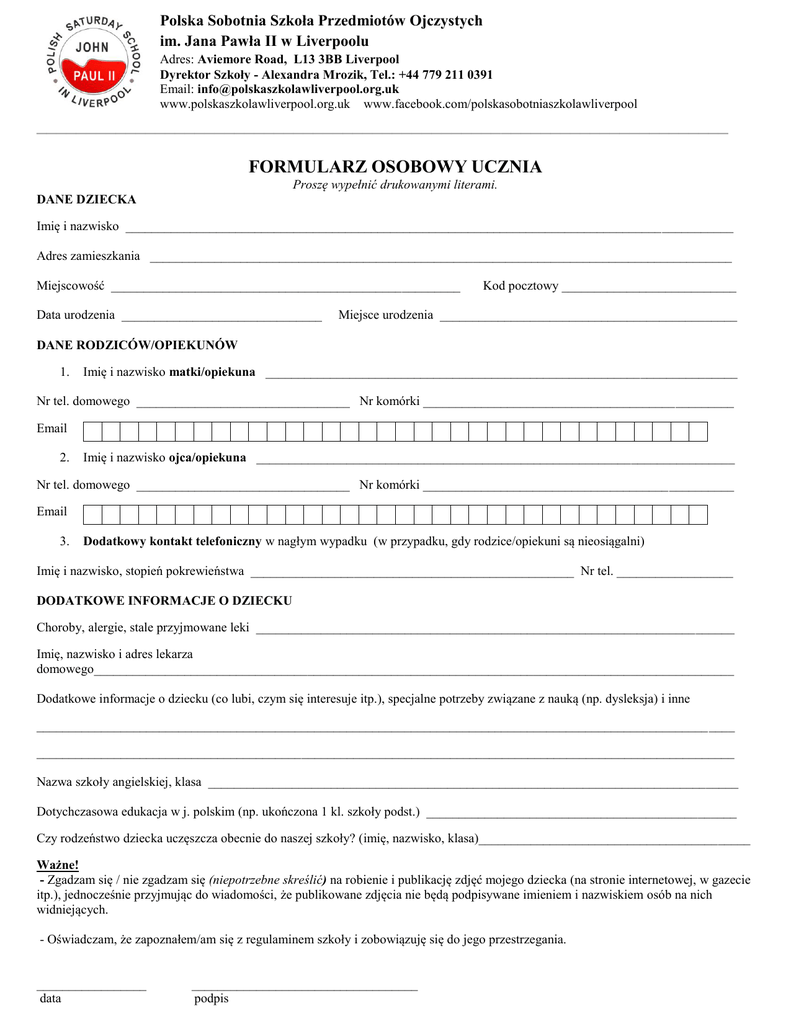 Polska Sobotnia Szkoła Przedmiotów Ojczystych im. Jana Pawła II w Liverpoolu Adres: Aviemore Road, L13 3BB Liverpool Dyrektor Szkoły - Alexandra Mrozik, Tel.: +44 779 211 0391 Email: [email protected] www.polskaszkolawliverpool.org.uk www.facebook.com/polskasobotniaszkolawliverpool ______________________________________________________________________ FORMULARZ OSOBOWY UCZNIA Proszę wypełnić drukowanymi literami. DANE DZIECKA Imię i nazwisko ______________________________________________________________________________________________ Adres zamieszkania __________________________________________________________________________________________ Miejscowość ______________________________________________________ Data urodzenia _______________________________ Kod pocztowy ___________________________ Miejsce urodzenia ______________________________________________ DANE RODZICÓW/OPIEKUNÓW 1. Imię i nazwisko matki/opiekuna _________________________________________________________________________ Nr tel. domowego _________________________________ Nr komórki ________________________________________________ Email 2. Imię i nazwisko ojca/opiekuna __________________________________________________________________________ Nr tel. domowego _________________________________ Nr komórki ________________________________________________ Email 3. Dodatkowy kontakt telefoniczny w nagłym wypadku (w przypadku, gdy rodzice/opiekuni są nieosiągalni) Imię i nazwisko, stopień pokrewieństwa __________________________________________________ Nr tel. __________________ DODATKOWE INFORMACJE O DZIECKU Choroby, alergie, stale przyjmowane leki __________________________________________________________________________ Imię, nazwisko i adres lekarza domowego___________________________________________________________________________________________________ Dodatkowe informacje o dziecku (co lubi, czym się interesuje itp.), specjalne potrzeby związane z nauką (np. dysleksja) i inne ____________________________________________________________________________________________________________ ____________________________________________________________________________________________________________ Nazwa szkoły angielskiej, klasa __________________________________________________________________________________ Dotychczasowa edukacja w j. polskim (np. ukończona 1 kl. szkoły podst.) ________________________________________________ Czy rodzeństwo dziecka uczęszcza obecnie do naszej szkoły? (imię, nazwisko, klasa)__________________________________________ Ważne! - Zgadzam się / nie zgadzam się (niepotrzebne skreślić) na robienie i publikację zdjęć mojego dziecka (na stronie internetowej, w gazecie itp.), jednocześnie przyjmując do wiadomości, że publikowane zdjęcia nie będą podpisywane imieniem i nazwiskiem osób na nich widniejących. - Oświadczam, że zapoznałem/am się z regulaminem szkoły i zobowiązuję się do jego przestrzegania. _________________ data ___________________________________ podpis Polska Sobotnia Szkoła Przedmiotów Ojczystych im. Jana Pawła II w Liverpoolu Adres: Aviemore Road, L13 3BB Liverpool Dyrektor Szkoły - Alexandra Mrozik, Tel.: +44 779 211 0391 Email: [email protected] www.polskaszkolawliverpool.org.uk www.facebook.com/polskasobotniaszkolawliverpool ______________________________________________________________________ Zobowiązania rodziców/opiekunów Jako rodzic/opiekun dziecka uczęszczającego do szkoły zobowiązuję się do: 1. Dokładnego zapoznania się z regulaminem szkolnym oraz przestrzegania reguł tam zawartych, 2. Dopilnowania punktualnego przyprowadzania i odbierania dzieci oraz utrzymywaniu wysokiej frekwencji, 3. Niezwłocznego podawania informacji o zmianie adresu, telefonu, danych personalnych opiekunów dziecka lub stanu zdrowia dziecka (np. alergie), o których szkoła powinna wiedzieć, 4. Zapoznawania się z informacjami przesyłanymi w emailach lub zamieszczanych na szkolnej stronie internetowej (w Aktualnościach), 5. Dopilnowania odrabiania przez dziecko prac domowych, 6. Pełnienia wyznaczonych dyżurów w sprzątaniu szkoły po zajęciach. 7. Uczestnictwa we wszystkich organizowanych spotkaniach nauczyciela z rodzicami. ………………………………………………………. podpis rodzica/opiekuna ______________________________________________________________________ Zgoda na wycieczki edukacyjne Wyrażam zgodę na uczestnictwo mojego dziecka ……………………………………………………………………. w wycieczkach edukacyjnych, organizowanych przez Polską Sobotnią Szkołę w Liverpoolu. Przyjmuję do wiadomości, że szkoła będzie mnie informować o każdej wycieczce z wyprzedzeniem i mam prawo odmówić zgody na wzięcie w niej udziału mojego dziecka. ………………………………………………………………………….. Imię i nazwisko rodzica/opiekuna