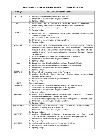 PLAN PRACY KOMISJI SPRAW SPOŁECZNYCH NA 2015 ROK MIESIĄC STYCZEŃ LUTY MARZEC KWIECIEŃ MAJ CZERWIEC LIPIEC SIERPIEŃ WRZESIEŃ PAŹDZIERNIK LISTOPAD GRUDZIEŃ TEMATYKA POSIEDZEŃ KOMISJI 1. 2. 3. 1. Opracowanie planu pracy komisji na 2015 rok. Omówienie i zaopiniowanie projektów uchwał. Sprawy bieżące. Zapoznanie się z działalnością Ośrodka Pomocy Społecznej w Pszczynie (OPS). Pomoc rodzinom wielodzietnym, bezdomnym. 2. Omówienie i zaopiniowanie projektów uchwał. 3. Sprawy bieżące. 1. Zapoznanie się z działalnością Pszczyńskiego Ośrodka RehabilitacyjnoTerapeutycznego (POR-T). 2. Finansowanie klubów sportowych. 3. Omówienie i zaopiniowanie projektów uchwał. 4. Sprawy bieżące. 1. Zapoznanie się z funkcjonowaniem świetlic środowiskowych: "Świetlica środowiskowa na osiedlu Stare Miasto - część południowa" - Towarzystwo Przyjaciół Dzieci oraz Świetlicy środowiskowej na osiedlu Stare Miasto część północna"- Parafia Rzymskokatolicka Wszystkich Świętych - komisja wyjazdowa. 2. Analiza sprawozdania z realizacji budżetu gminy za 2014 rok. 3. Omówienie i zaopiniowanie projektów uchwał. 4. Sprawy bieżące. 1. Zapoznanie się z działalnością Pszczyńskiego Zarządu Edukacji. 2. Zapoznanie się z działalnością Pszczyńskiego Centrum Kultury. 3. Omówienie i zaopiniowanie projektów uchwał. 4. Sprawy bieżące. 1. Ocena infrastruktury sportowej gminy Pszczyna. 2. Analiza działalności Straży Miejskiej. Analiza stanu bezpieczeństwa i porządku publicznego. 3. Omówienie i zaopiniowanie projektów uchwał. 4. Sprawy bieżące. Przerwa wakacyjna. 1. Zapoznanie się z działalnością Organizacji Pożytku Publicznego. 2. Zapoznanie się z działalnością Hospicjum Św. Ojca Pio. 3. Omówienie i zaopiniowanie projektów uchwał. 4. Sprawy bieżące. 1. Ocena stanu zaawansowania prowadzonych inwestycji i remontów w placówka oświatowych, „Szkoły bez boisk”. 2. Analiza informacji z przebiegu wykonania budżetu gminy za I półrocze 2015. 3. Omówienie i zaopiniowanie projektów uchwał. 4. Sprawy bieżące. 1. Zapoznanie się z projektem Unijnym dotyczącym bezpośredniego wsparcia szkół w powiecie pszczyńskim. 2. Omówienie i zaopiniowanie projektów uchwał. 3. Sprawy bieżące. 1. Analiza działalności Polskiego Stowarzyszenia na Rzecz Osób z Upośledzeniem Umysłowym Koło w Pszczynie - komisja wyjazdowa. 2. Omówienie i zaopiniowanie projektów uchwał. 3. Sprawy bieżące. 1. Analiza projektu budżetu gminy Pszczyna na 2016 rok. 2. Omówienie i zaopiniowanie projektów uchwał. 3. Sprawy bieżące.