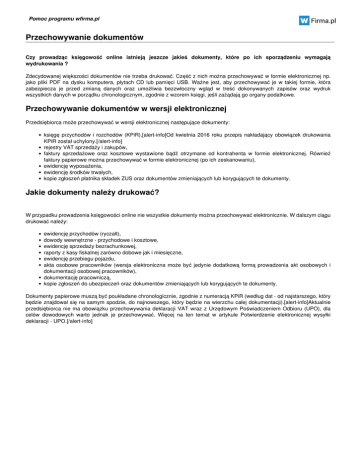 Pomoc programu wfirma.pl Przechowywanie dokumentów Czy prowadząc księgowość online istnieją jeszcze jakieś dokumenty, które po ich sporządzeniu wymagają wydrukowania ? Zdecydowanej większości dokumentów nie trzeba drukować. Część z nich można przechowywać w formie elektronicznej np. jako pliki PDF na dysku komputera, płytach CD lub pamięci USB. Ważne jest, aby przechowywać je w takiej formie, która zabezpiecza je przed zmianą danych oraz umożliwia bezzwłoczny wgląd w treść dokonywanych zapisów oraz wydruk wszystkich danych w porządku chronologicznym, zgodnie z wzorem księgi, jeśli zażądają go organy podatkowe. Przechowywanie dokumentów w wersji elektronicznej Przedsiębiorca może przechowywać w wersji elektronicznej następujące dokumenty: księgę przychodów i rozchodów (KPiR),[alert-info]Od kwietnia 2016 roku przepis nakładający obowiązek drukowania KPiR został uchylony.[/alert-info] rejestry VAT sprzedaży i zakupów, faktury sprzedażowe oraz kosztowe wystawione bądź otrzymane od kontrahenta w formie elektronicznej. Również faktury papierowe można przechowywać w formie elektronicznej (po ich zeskanowaniu), ewidencję wyposażenia, ewidencję środków trwałych, kopie zgłoszeń płatnika składek ZUS oraz dokumentów zmieniających lub korygujących te dokumenty. Jakie dokumenty należy drukować? W przypadku prowadzenia księgowości online nie wszystkie dokumenty można przechowywać elektronicznie. W dalszym ciągu drukować należy: ewidencję przychodów (ryczałt), dowody wewnętrzne - przychodowe i kosztowe, ewidencję sprzedaży bezrachunkowej, raporty z kasy fiskalnej zarówno dobowe jak i miesięczne, ewidencję przebiegu pojazdu, akta osobowe pracowników (wersja elektroniczna może być jedynie dodatkową formą prowadzenia akt osobowych i dokumentacji osobowej pracowników), dokumentację pracowniczą, kopie zgłoszeń do ubezpieczeń oraz dokumentów zmieniających lub korygujących te dokumenty. Dokumenty papierowe muszą być poukładane chronologicznie, zgodnie z numeracją KPiR (według dat - od najstarszego, który będzie znajdował się na samym spodzie, do najnowszego, który będzie na wierzchu całej dokumentacji).[alert-info]Aktualnie przedsiębiorca nie ma obowiązku przechowywania deklaracji VAT wraz z Urzędowym Poświadczeniem Odbioru (UPO), dla celów dowodowych warto jednak je przechowywać. Więcej na ten temat w artykule Potwierdzenie elektronicznej wysyłki deklaracji - UPO.[/alert-info] Powered by TCPDF (www.tcpdf.org)