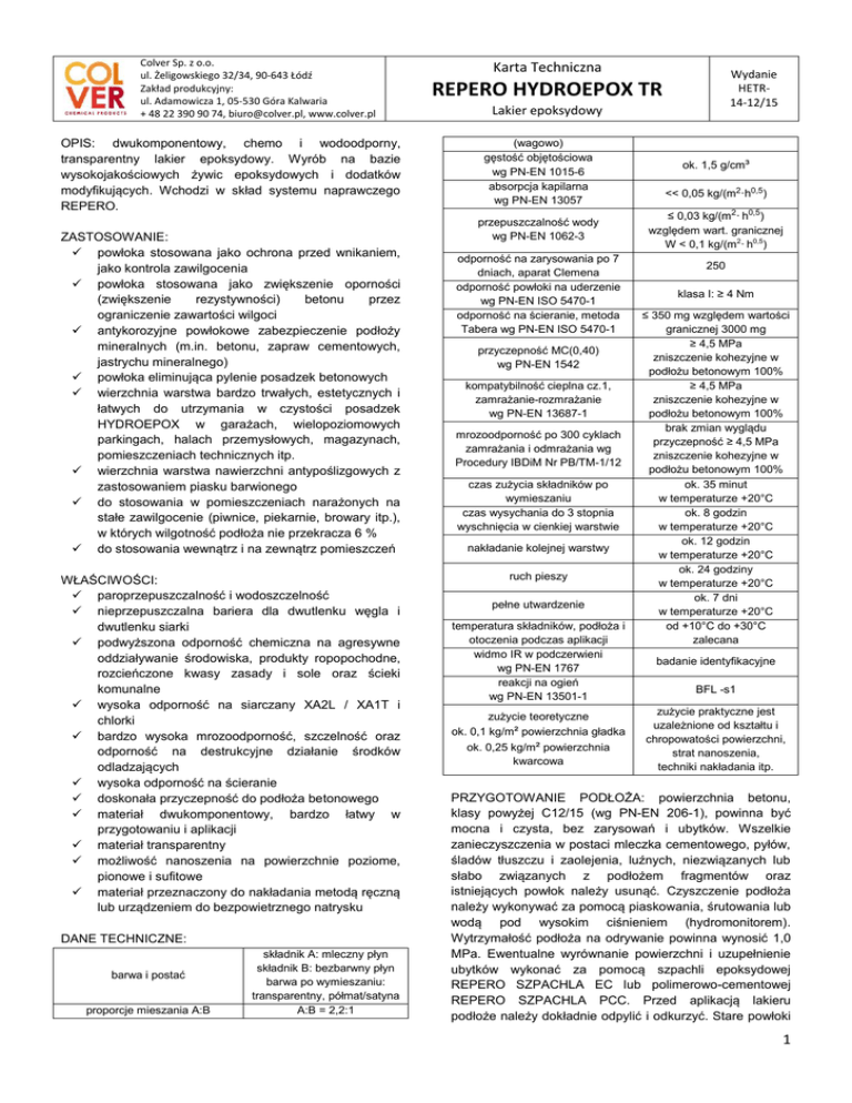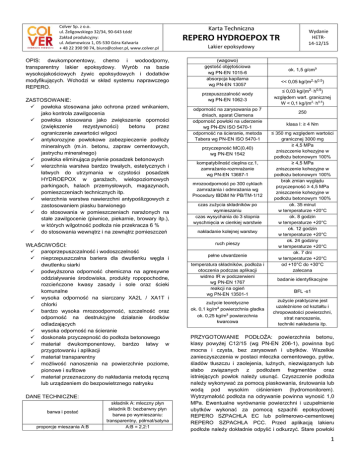 Colver Sp. z o.o. ul. Żeligowskiego 32/34, 90-643 Łódź Zakład produkcyjny: ul. Adamowicza 1, 05-530 Góra Kalwaria + 48 22 390 90 74, [email protected], www.colver.pl OPIS: dwukomponentowy, chemo i wodoodporny, transparentny lakier epoksydowy. Wyrób na bazie wysokojakościowych żywic epoksydowych i dodatków modyfikujących. Wchodzi w skład systemu naprawczego REPERO. ZASTOSOWANIE: powłoka stosowana jako ochrona przed wnikaniem, jako kontrola zawilgocenia powłoka stosowana jako zwiększenie oporności (zwiększenie rezystywności) betonu przez ograniczenie zawartości wilgoci antykorozyjne powłokowe zabezpieczenie podłoży mineralnych (m.in. betonu, zapraw cementowych, jastrychu mineralnego) powłoka eliminująca pylenie posadzek betonowych wierzchnia warstwa bardzo trwałych, estetycznych i łatwych do utrzymania w czystości posadzek HYDROEPOX w garażach, wielopoziomowych parkingach, halach przemysłowych, magazynach, pomieszczeniach technicznych itp. wierzchnia warstwa nawierzchni antypoślizgowych z zastosowaniem piasku barwionego do stosowania w pomieszczeniach narażonych na stałe zawilgocenie (piwnice, piekarnie, browary itp.), w których wilgotność podłoża nie przekracza 6 % do stosowania wewnątrz i na zewnątrz pomieszczeń WŁAŚCIWOŚCI: paroprzepuszczalność i wodoszczelność nieprzepuszczalna bariera dla dwutlenku węgla i dwutlenku siarki podwyższona odporność chemiczna na agresywne oddziaływanie środowiska, produkty ropopochodne, rozcieńczone kwasy zasady i sole oraz ścieki komunalne wysoka odporność na siarczany XA2L / XA1T i chlorki bardzo wysoka mrozoodporność, szczelność oraz odporność na destrukcyjne działanie środków odladzających wysoka odporność na ścieranie doskonała przyczepność do podłoża betonowego materiał dwukomponentowy, bardzo łatwy w przygotowaniu i aplikacji materiał transparentny możliwość nanoszenia na powierzchnie poziome, pionowe i sufitowe materiał przeznaczony do nakładania metodą ręczną lub urządzeniem do bezpowietrznego natrysku DANE TECHNICZNE: barwa i postać proporcje mieszania A:B składnik A: mleczny płyn składnik B: bezbarwny płyn barwa po wymieszaniu: transparentny, półmat/satyna A:B = 2,2:1 Karta Techniczna Wydanie HETR14-12/15 REPERO HYDROEPOX TR Lakier epoksydowy (wagowo) gęstość objętościowa wg PN-EN 1015-6 absorpcja kapilarna wg PN-EN 13057 przepuszczalność wody wg PN-EN 1062-3 odporność na zarysowania po 7 dniach, aparat Clemena odporność powłoki na uderzenie wg PN-EN ISO 5470-1 odporność na ścieranie, metoda Tabera wg PN-EN ISO 5470-1 przyczepność MC(0,40) wg PN-EN 1542 kompatybilność cieplna cz.1, zamrażanie-rozmrażanie wg PN-EN 13687-1 mrozoodporność po 300 cyklach zamrażania i odmrażania wg Procedury IBDiM Nr PB/TM-1/12 czas zużycia składników po wymieszaniu czas wysychania do 3 stopnia wyschnięcia w cienkiej warstwie nakładanie kolejnej warstwy ruch pieszy pełne utwardzenie temperatura składników, podłoża i otoczenia podczas aplikacji widmo IR w podczerwieni wg PN-EN 1767 reakcji na ogień wg PN-EN 13501-1 zużycie teoretyczne ok. 0,1 kg/m² powierzchnia gładka ok. 0,25 kg/m² powierzchnia kwarcowa ok. 1,5 g/cm³ << 0,05 kg/(m2·h0,5) ≤ 0,03 kg/(m2· h0,5) względem wart. granicznej W < 0,1 kg/(m2· h0,5) 250 klasa I: ≥ 4 Nm ≤ 350 mg względem wartości granicznej 3000 mg ≥ 4,5 MPa zniszczenie kohezyjne w podłożu betonowym 100% ≥ 4,5 MPa zniszczenie kohezyjne w podłożu betonowym 100% brak zmian wyglądu przyczepność ≥ 4,5 MPa zniszczenie kohezyjne w podłożu betonowym 100% ok. 35 minut w temperaturze +20°C ok. 8 godzin w temperaturze +20°C ok. 12 godzin w temperaturze +20°C ok. 24 godziny w temperaturze +20°C ok. 7 dni w temperaturze +20°C od +10°C do +30°C zalecana badanie identyfikacyjne BFL -s1 zużycie praktyczne jest uzależnione od kształtu i chropowatości powierzchni, strat nanoszenia, techniki nakładania itp. PRZYGOTOWANIE PODŁOŻA: powierzchnia betonu, klasy powyżej C12/15 (wg PN-EN 206-1), powinna być mocna i czysta, bez zarysowań i ubytków. Wszelkie zanieczyszczenia w postaci mleczka cementowego, pyłów, śladów tłuszczu i zaolejenia, luźnych, niezwiązanych lub słabo związanych z podłożem fragmentów oraz istniejących powłok należy usunąć. Czyszczenie podłoża należy wykonywać za pomocą piaskowania, śrutowania lub wodą pod wysokim ciśnieniem (hydromonitorem). Wytrzymałość podłoża na odrywanie powinna wynosić 1,0 MPa. Ewentualne wyrównanie powierzchni i uzupełnienie ubytków wykonać za pomocą szpachli epoksydowej REPERO SZPACHLA EC lub polimerowo-cementowej REPERO SZPACHLA PCC. Przed aplikacją lakieru podłoże należy dokładnie odpylić i odkurzyć. Stare powłoki 1 epoksydowe odtłuścić, uszorstnić papierem ściernym, odpylić i odkurzyć oraz przemyć rozpuszczalnikiem organicznym niepozostawiającym tłustego filmu, np. acetonem. PRZYGOTOWANIE MATERIAŁU: do czystego pojemnika przelać składniki A oraz B (odważone w odpowiedniej proporcji) i całość wymieszać za pomocą wolnoobrotowego mieszadła (˂ 500 obr/min). Mieszanie kontynuować przez minimum 3 minuty, aż do uzyskania jednolitej barwy i jednorodnej konsystencji. Zaleca się przeniesienie całości do czystego pojemnika i ponowne zamieszanie. Podczas mieszania należy zwrócić uwagę na zgarnianie masy ze ścianek oraz dna naczynia. Nie wolno mieszać ręcznie. Temperatura ma wpływ na lepkość żywicy epoksydowej. Składniki produktu przed użyciem powinny być przechowywane w temperaturze +15÷+25°C przez co najmniej 12 godzin. Zaleca się aby jednorazowo przygotować taką ilość materiału, która zostanie zużyta w ciągu czasu przydatności do użycia. SPOSÓB APLIKACJI: po utwardzeniu warstwy primera lub warstwy właściwej posadzki (po 12÷24 godzinach w zależności od temperatury) można przystąpić do naniesienia powłoki. Powierzchnię należy dwukrotnie pokryć lakier
