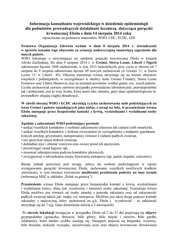 Informacja konsultanta wojewódzkiego w dziedzinie epidemiologii dla podmiotów prowadzących działalność leczniczą dotycząca gorączki krwotocznej Ebola z dnia 14 sierpnia 2014 roku /opracowano na podstawie materiałów WHO, CDC, ECDC, GIS/ Światowa Organizacja Zdrowia wydała w dniu 8 sierpnia 2014 r. oświadczenie w sprawie uznania tego zdarzenia za sytuację nadzwyczajną stanowiącą zagrożenie dla innych państw. WHO informuje o utrzymującej się epidemii gorączki krwotocznej Ebola w krajach Afryki Zachodniej. Do dnia 9 sierpnia 2014 r. w Gwinei, Sierra Leone, Liberii i Nigerii odnotowano łącznie 1848 zachorowań, w tym 1013 śmiertelnych, przy czym w okresie od 7 sierpnia do 9 sierpnia odnotowano łącznie 69 nowych zachorowań (w Gwinei 11, w Sierra Leone 13, w Liberii 45). Obecnie transmisja wirusa utrzymuje się na terenie obszarów wiejskich i podmiejskich, w szczególności w okolicy stolic Gwinei Conakry, Sierra Leone Freetown oraz Liberii Monrovia oraz na terenach powiatów wzdłuż granic ww. trzech państw. Liczba zachorowań zawiera zarówno przypadki potwierdzone laboratoryjnie, prawdopodobne jak i podejrzane, jest to więc liczba, która może ulec zmianie, gdyż dane epidemiologiczne nt. przypadków ulegają ciągłej aktualizacji. W chwili obecnej WHO i ECDC określają ryzyko zachorowania osób podróżujących na teren Gwinei i państw sąsiadujących jako niskie, z uwagi na fakt, iż przeniesienie wirusa Ebola następuje przez bezpośredni kontakt z krwią, wydzielinami i wydalinami osoby zakażonej. Zgodnie z zaleceniami WHO podróżujący powinni: • unikać wszelkich kontaktów z osobami zakażonymi (chorymi lub ciałami osób zmarłych), • unikać wszelkich kontaktów z dzikimi zwierzętami (w szczególności z małpami, gatunkami leśnych antylop, gryzoniami, nietoperzami), również z ciałami padłych zwierząt, • nie spożywać mięsa dzikich zwierząt, • dokładnie myć i obierać warzywa oraz owoce przed ich spożyciem, • przestrzegać zasad higieny rąk, • stosować zabezpieczenia podczas kontaktów płciowych, • zrezygnować z odwiedzania miejsc bytowania nietoperzy (np. jaskiń, kopalni, schronów). Biorąc jednak powyższe pod uwagę, zaleca się osobom podróżującym w rejony występowania gorączki krwotocznej Ebola, zachowanie wszelkich możliwych środków ostrożności, w tym również rozważenie możliwości przełożenia podróży na inny termin (informacja MSZ w zakładce „Polak za granicą”). Przeniesienie wirusa Ebola następuje przez bezpośredni kontakt z krwią, wydzielinami i wydalinami (mocz, ślina, kał, wymiociny i nasienie) osoby zakażonej. Transmisja wirusa Ebola możliwa jest również od osoby zmarłej z powodu zakażenia oraz od zakażonych/ padłych zwierząt takich jak: małpy czy nietoperze. Możliwa jest także droga poprzez kontakt seksualny z mężczyzną, który zachorował na g.k. Ebola i wyzdrowiał – tu zakaźność utrzymuje się do 7 tyg. (inne doniesienia mówią o 3 miesiącach). Po okresie inkubacji trwającym w przypadku Ebola od 2 do 21 dni pojawiają się objawy grypopodobne (gorączka, dreszcze, bóle głowy, bóle mięśni i stawów, bóle gardła, osłabienie), które bardzo szybko nasilają się. Następnie pojawia się biegunka, wymioty, bóle brzucha, niekiedy wysypka, zaczerwienie oczu oraz objawy krwotoczne (krwawienia zewnętrzne i wewnętrzne). Choroba może doprowadzić do śmierci. Nie ma specyficznego leczenia, ani szczepionki przeciwko gorączkom krwotocznym Ebola. Brak skutecznego leczenia i duża zakaźność wirusów wymusza stosowanie odpowiednich zabezpieczeń przez osoby kontaktujące się lub opiekujące osobą zakażoną lub chorą (np. szczególne warunki izolacji, środków ochrony osobistej). W razie zachorowania w trakcie pobytu osoba chora powinna natychmiast poprosić o pomoc lekarską, zaś w przypadku wystąpienia choroby gorączkowej po powrocie z ww. rejonów należy musi niezwłocznie zgłosić się do lekarza informując o przebytej podróży. Należy sprawdzić przygotowanie podmiotu wykonującego działalność leczniczą do podjęcia działań w sytuacji kryzysowej. Nadal należy kierować się zapisami ustawy z dnia 5 grudnia 2008 r. o zapobieganiu oraz zwalczaniu zakażeń i chorób zakaźnych u ludzi (t.j. Dz. U. 2008 Nr 234 poz. 1570), w tym m.in. zastosować się do treści art.28 Lekarz lub felczer, który podejrzewa lub rozpoznaje chorobę szczególnie niebezpieczną i wysoce zakaźną, stanowiącą zagrożenie dla zdrowia publicznego, lub stwierdza zgon w wyniku takiej choroby, podejmuje działania zapobiegające szerzeniu się zachorowań, w tym: 1) kieruje osobę podejrzaną o zakażenie lub zachorowanie oraz zakażoną lub chorą na chorobę zakaźną do szpitala specjalistycznego zapewniającego izolację i leczenie tej osoby oraz niezwłocznie informuje szpital o tym fakcie; 2) organizuje transport uniemożliwiający przeniesienie zakażenia na inne osoby; 3) poucza osobę chorą lub osobę sprawującą prawną pieczę nad chorą osobą małoletnią lub bezradną albo opiekuna faktycznego w rozumieniu art. 3 ust. 1 pkt 1 ustawy z dnia 6 listopada 2008 r. o prawach pacjenta i Rzeczniku Praw Pacjenta, osoby najbliższe oraz osoby, o których mowa w art. 17 ust. 1a, o obowiązkach wynikających z art. 5 ust. 1; 4) niezwłocznie powiadamia państwowego powiatowego inspektora sanitarne-go właściwego dla miejsca podejrzenia, rozpoznania choroby szczególnie niebezpiecznej i wysoce zakaźnej lub stwierdzenia zgonu o podjętych działaniach. Przypomina się, aby druki dotyczące zgłoszeń chorób ZLK były wypełniane przez lekarzy dokładnie i kompletnie z uwzględnieniem wszystkich informacji przewidzianych w druku, w tym danych o podróżach, pobytach zagranicznych niezależnie od jednostki chorobowej, której podejrzenie/ rozpoznanie dotyczy oraz przekazywane zgodnie z obowiązującymi przepisami. Należy w drukach ZLK wpisywać 