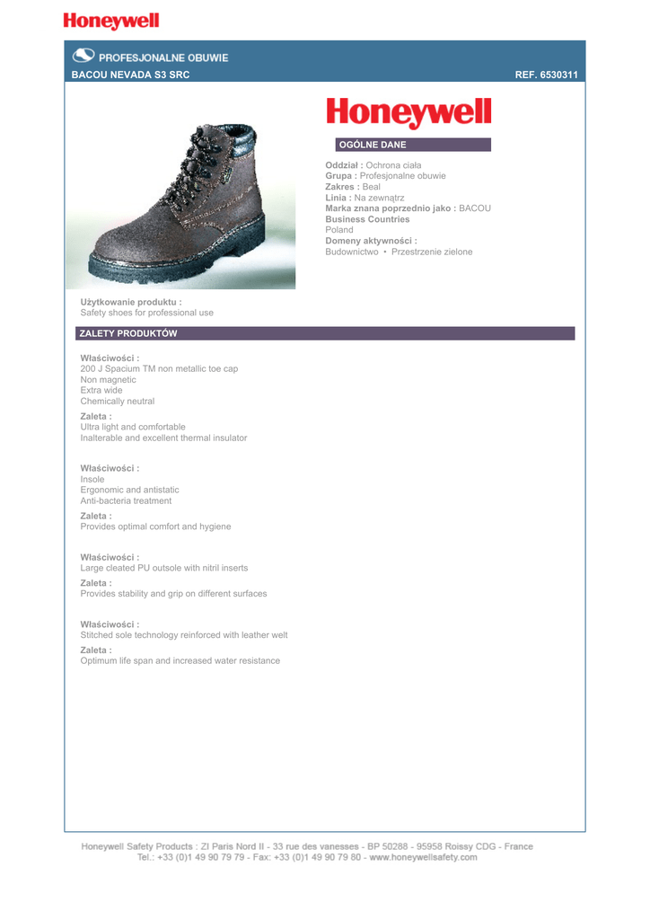 BACOU NEVADA S3 SRC REF. 6530311 OGÓLNE DANE Oddział : Ochrona ciała Grupa : Profesjonalne obuwie Zakres : Beal Linia : Na zewnątrz Marka znana poprzednio jako : BACOU Business Countries Poland Domeny aktywności : Budownictwo • Przestrzenie zielone Użytkowanie produktu : Safety shoes for professional use ZALETY PRODUKTÓW Właściwości : 200 J Spacium TM non metallic toe cap Non magnetic Extra wide Chemically neutral Zaleta : Ultra light and comfortable Inalterable and excellent thermal insulator Właściwości : Insole Ergonomic and antistatic Anti-bacteria treatment Zaleta : Provides optimal comfort and hygiene Właściwości : Large cleated PU outsole with nitril inserts Zaleta : Provides stability and grip on different surfaces Właściwości : Stitched sole technology reinforced with leather welt Zaleta : Optimum life span and increased water resistance OPIS TECHNICZNY Rozmiary : 39-47 Środkowa część podeszwy : Stainless steel midsole for puncture resistance Górna część : Smooth oiled water resistant leather upper Ankle boot with precise lacing system Nosek : 200 J SPACIUM ™ Toe cap : ultra light (50% lighter than a steel toe cap) non metallic Thermal insulation Inalterable Wewnętrzna część podeszwy : Full, ergonomical insole Antistatic and antibacterial Removable and changeable for an optimal comfort. Wewnętrzna część podeszwy : PU with stitched construction with welt. SBR 6mm midsole High slip resistance coefficient : 0.27 (Test method EN 13 287 : 2004) Excellent shock absorption capacities (+35%) = 27 joules Good abrasion resistance INFORMACJE DODATKOWE Akcesoria : BAC’RUN Insole Size : 38-47 Reference : 60 003 21 Czas użytkowania : If the footwear is supplied with a part of, or the whole sole unit made of polyurethane : We advise that the footwear should be used in the limit of 3 years following the manufacturing date, which figures on the footwear. After this time limit, certain factors such as : exposure to sunlight, hydrometry, temperature changes, could cause a modification in the structure of the material, which would no longer maintain the same performance levels with regards to the requirements defined in the European Directive 89.686 CEE. If the footwear is supplied with a sole unit made from a material other than polyurethane : We advise that the footwear should be used in the limit of 5 years following the manufacturing date, which figures on the footwear. Dane dotyczące przechowywania : Footwear should be stored in their original packaging, kept in a controlled stock area, not subject to rapid changes in temperature or humidity levels. Instrukcja obchodzenia się z produktem : After use leave your footwear to dry in an aired place away from heat. Remove any excess dust or dirt with a brush. Remove any marks using a damp cloth and soap if necessary. Finally polish any grain or pigmented leathers using a commercially available shoe care product. CERTYFIKATY I ZGODNOŚĆ Dyrektywy Unii Europejskiej : 89/686/EEC Kategoria UE Środki ochrony osobistej* : Klasa 2 Normy : EN 345-1 Tagging : BEAL CE EN 345-1 S3 Reference 6530311 Zapewnienie jakości : ISO 9001 / 2000 Numer atestu UE : 0075/003/161/06/01/0061 Ext N° 06/05/04 Laboratorium : CENTRE TECHNIQUE DU CUIR *PPE : Środki ochrony osobistej (ŚOO) DEKLARACJA ZGODNOŚCI UE Producent lub jego prawny przedstawiciel/dostawca z siedzibą na terenie Unii Europejskiej: Sperian Protection Europe Stwierdza, że opisane tutaj środki ochrony osobistej są zgodne z postaniowieniami Dyrektywy 89/686/CEE Rady Europy: Designation: BACOU NEVADA S3 SRC Reference: 6530311 Standard(s): EN 345-1 ŚOO podlega powyższemu typowi atestu UE: 0075/003/161/06/01/0061 Ext N° 06/05/04 Delivered by: CENTRE TECHNIQUE DU CUIR 4 rue Hermann Frenkel 69367 Lyon Cedex 07 France Sporządzono w Lyon, na 06/15/2004 przez: Jean-Pierre BRESSON Oddział: Ochrona ciała