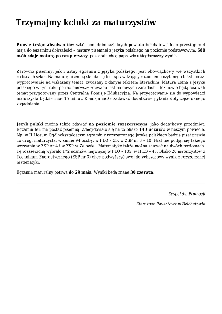 Trzymajmy kciuki za maturzystów Prawie tysiąc absolwentów szkół ponadgimnazjalnych powiatu bełchatowskiego przystąpiło 4 maja do egzaminu dojrzałości – matury pisemnej z języka polskiego na poziomie podstawowym. 680 osób zdaje maturę po raz pierwszy, pozostałe chcą poprawić ubiegłoroczny wynik. Zarówno pisemny, jak i ustny egzamin z języka polskiego, jest obowiązkowy we wszystkich rodzajach szkół. Na maturę pisemną składa się test sprawdzający rozumienie czytanego tekstu oraz wypracowanie na wskazany temat, związany z danym tekstem literackim. Matura ustna z języka polskiego w tym roku po raz pierwszy zdawana jest na nowych zasadach. Uczniowie będą losowali temat przygotowany przez Centralną Komisję Edukacyjną. Na przygotowanie się do wypowiedzi maturzysta będzie miał 15 minut. Komisja może zadawać dodatkowe pytania dotyczące danego zagadnienia. Język polski można także zdawać na poziomie rozszerzonym, jako dodatkowy przedmiot. Egzamin ten ma postać pisemną. Zdecydowało się na to blisko 140 uczniów w naszym powiecie. Np. w II Liceum Ogólnokształcącym egzamin z rozszerzonego języka polskiego będzie pisał prawie co drugi maturzysta, w sumie 94 osoby, w I LO – 35, w ZSP nr 3 – 10. Nikt nie podjął się takiego wyzwania w ZSP nr 4 i w ZSP w Zelowie. Matematykę także można zdawać na dwóch poziomach. Tę rozszerzoną wybrało 172 uczniów, najwięcej w I LO – 105, w II LO – 45. Blisko 20 maturzystów z Technikum Energetycznego (ZSP nr 3) chce podwyższyć swój dotychczasowy wynik z rozszerzonej matematyki. Egzamin maturalny potrwa do 29 maja. Wyniki będą znane 30 czerwca. Zespół ds. Promocji Starostwo Powiatowe w Bełchatowie