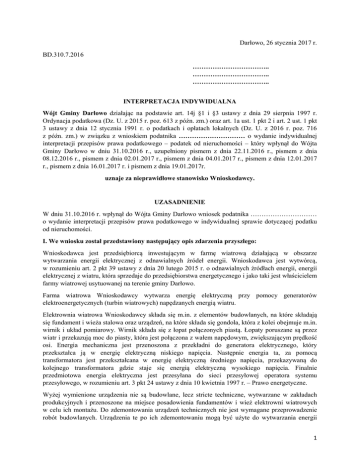 Darłowo, 26 stycznia 2017 r. BD.310.7.2016 …………………………….. …………………………….. …………………………….. INTERPRETACJA INDYWIDUALNA Wójt Gminy Darłowo działając na podstawie art. 14j §1 i §3 ustawy z dnia 29 sierpnia 1997 r. Ordynacja podatkowa (Dz. U. z 2015 r. poz. 613 z późn. zm.) oraz art. 1a ust. 1 pkt 2 i art. 2 ust. 1 pkt 3 ustawy z dnia 12 stycznia 1991 r. o podatkach i opłatach lokalnych (Dz. U. z 2016 r. poz. 716 z późn. zm.) w związku z wnioskiem podatnika ………………………… o wydanie indywidualnej interpretacji przepisów prawa podatkowego – podatek od nieruchomości – który wpłynął do Wójta Gminy Darłowo w dniu 31.10.2016 r., uzupełniony pismem z dnia 22.11.2016 r., pismem z dnia 08.12.2016 r., pismem z dnia 02.01.2017 r., pismem z dnia 04.01.2017 r., pismem z dnia 12.01.2017 r., pismem z dnia 16.01.2017 r. i pismem z dnia 19.01.2017r. uznaje za nieprawidłowe stanowisko Wnioskodawcy. UZASADNIENIE W dniu 31.10.2016 r. wpłynął do Wójta Gminy Darłowo wniosek podatnika ………………………… o wydanie interpretacji przepisów prawa podatkowego w indywidualnej sprawie dotyczącej podatku od nieruchomości. I. We wniosku został przedstawiony następujący opis zdarzenia przyszłego: Wnioskodawca jest przedsiębiorcą inwestującym w farmę wiatrową działającą w obszarze wytwarzania energii elektrycznej z odnawialnych źródeł energii. Wnioskodawca jest wytwórcą, w rozumieniu art. 2 pkt 39 ustawy z dnia 20 lutego 2015 r. o odnawialnych źródłach energii, energii elektrycznej z wiatru, która sprzedaje do przedsiębiorstwa energetycznego i jako taki jest właścicielem farmy wiatrowej usytuowanej na terenie gminy Darłowo. Farma wiatrowa Wnioskodawcy wytwarza energię elektryczną przy pomocy generatorów elektroenergetycznych (turbin wiatrowych) napędzanych energią wiatru. Elektrownia wiatrowa Wnioskodawcy składa się m.in. z elementów budowlanych, na które składają się fundament i wieża stalowa oraz urządzeń, na które składa się gondola, która z kolei obejmuje m.in. wirnik i układ pomiarowy. Wirnik składa się z łopat połączonych piastą. Łopaty poruszane są przez wiatr i przekazują moc do piasty, która jest połączona z wałem napędowym, zwiększającym prędkość osi. Energia mechaniczna jest przenoszona z przekładni do generatora elektrycznego, który przekształca ją w energię elektryczną niskiego napięcia. Następnie energia ta, za pomocą transformatora jest przekształcana w energię elektryczną średniego napięcia, przekazywaną do kolejnego transformatora gdzie staje się energią elektryczną wysokiego napięcia. Finalnie przedmiotowa energia elektryczna jest przesyłana do sieci przesyłowej operatora systemu przesyłowego, w rozumieniu art. 3 pkt 24 ustawy z dnia 10 kwietnia 1997 r. – Prawo energetyczne. Wyżej wymienione urządzenia nie są budowlane, lecz stricte techniczne, wytwarzane w zakładach produkcyjnych i przenoszone na miejsce posadowienia fundamentów i wież elektrowni wiatrowych w celu ich montażu. Do zdemontowania urządzeń technicznych nie jest wymagane przeprowadzenie robót budowlanych. Urządzenia te po ich zdemontowaniu mogą być użyte do wytwarzania energii 1 z wiatru w innej lokalizacji. Po demontażu urządzeń technicznych konstrukcja elementów budowlanych elektrowni wiatrowej, tj. fundamentów lub wieży w żaden sposób nie ulegnie uszkodzeniu. Istotnym podkreślenia jest fakt, iż zakres pozwolenia na budowę elektrowni wiatrowej Wnioskodawcy obejmuje jedynie jej elementy budowlane, nie są natomiast ujęte w nim urządzenia techniczne, jak generator, przekładnia, wirnik, układ pomiarowy. Funkcje elementów budowlanych i najważniejszych urządzeń technicznych zostały opisane poniżej: - Fundament – element konstrukcyjny z żelbetonu przekazujący na podłoże gruntowe całość obciążeń posadowionych na nim obiektów. Fundament swoją masą zapewnia stateczność układu. - Wieża – ważny element konstrukcji turbiny wiatrowej podtrzymujący gondolę oraz układ wirnika. Wieża stalowa za swój główny cel ma umieszczenie wirnika na odpowiedniej wysokości nad poziomem gruntu w celu lepszego wykorzystania wiatru. Wieża elektrowni wiatrowej oprócz utrzymania ważącej często kilkadziesiąt ton gondoli ma za zadanie także obciążenia grawitacyjne, obrotowe i napory wiatru. - Gondola – urządzenia stanowiące element siłowni wiatrowej, w środku której znajdują się mechanizmy i urządzenia produkujące i przetwarzające energię mechaniczną w elektryczną, tj. wał napędowy, przekładnia, sprzęgło, generator oraz układ sterowania. - Mechanizm regulacji kąta nastawienia (yaw) – system urządzeń znajdujący się pod gondolą połączony z układem sterowania całej turbiny, składający się z silników elektrycznych oraz dwóch kół zębatych, których zadaniem jest optymalne ustawienie gondoli względem wiatru. - Wirnik (rotor) z zespołem łopat – to urządzenie stanowi najważniejszy element siłowni wiatrowej, który przekształca energię wiatru w energię mechaniczną przekazywaną przez zespół przeniesienia napędu do generatora. Wirnik osadzony jest w wale, poprzez który napędzany jest generator. Wirnik obraca się najczęściej z prędkością 15-20 obr./min., natomiast typowy generator asynchroniczny wytwarza energię elektryczną przy prędkości ponad 1500 obr./min. Ważną rolę w wirniku odgrywa liczba łopat – typowy układ to 3 łopaty. - Zespół przeniesienia napędu – tworzą go następujące urządzenia: wał główny, łożysko główne, przekładnia, hamulec i sprzęgło. - Wał główny – urządzenie, które przenosi moment obrotowy pomiędzy zespołem łopat a przekładnią. Ponieważ turbina obraca się z niewielką prędkością w porównaniu z generatorem, zatem jej moment obrotowy ma dużą wartość. Z tego względu wał głów