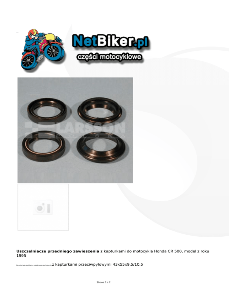 Uszczelniacze przedniego zawieszenia z kapturkami do motocykla Honda CR 500, model z roku 1995 Komplet uszczelniaczy przedniego zawieszenia z kapturkami przeciwpyłowymi 43x55x9,5/10,5 Strona 1 z 2 1. 2. 3. 4. 5. Producent Średnica wew. [mm] Średnica zew. [mm] Wysokość [mm] Kapturek przeciwpyłowy Tourmax 43 55 9.5/10.5 tak Uszczelniacze z kapturkami przeciwpyłowymi to najlepsze rozwiązanie dla osób ceniących jakość i trwałość przedniego zawieszenia w motocyklu. Wszystkie uszczelniacze sprzedawane są w kompletach składających się z dwóch uszczelniaczy wewnętrznych i dwóch kapturków przeciwpyłowych. Dla osób, które nie widzą uzasadnienia wymiany kapturków przeciwpyłowych polecamy uszczelniacze firmy Athena sprzedawane w kompletach po dwie sztuki. Kraj produkcji: Japonia Strona 2 z 2