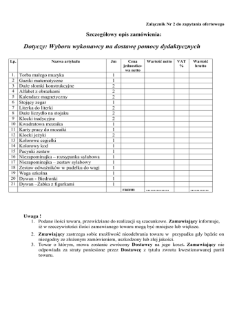 Załącznik Nr 2 do zapytania ofertowego Szczegółowy opis zamówienia: Dotyczy: Wyboru wykonawcy na dostawę pomocy dydaktycznych Lp. 1. 2 3 4 5 6 7 8 9 10 11 12 13 14 15 16 17 18 19 20 21 Nazwa artykułu Torba małego muzyka Guziki matematyczne Duże słomki konstrukcyjne Alfabet z obrazkami Kalendarz magnetyczny Stojący zegar Literka do literki Duże liczydło na stojaku Klocki tradycyjne Kwadratowa mozaika Karty pracy do mozaiki Klocki jeżyki Kolorowe cegiełki Kolorowy kod Pacynki zestaw Niezapominajka – rozsypanka sylabowa Niezapominajka – zestaw sylabowy Zestaw odważników w pudełku do wagi Waga szkolna Dywan - Biedronki Dywan –Żabka z figurkami Jm Cena jednostkowa netto Wartość netto razem …………… VAT % Wartość brutto 1 1 2 2 2 1 2 2 2 1 1 2 1 1 1 1 1 1 1 1 1 ………… Uwaga ! 1. Podane ilości towaru, przewidziane do realizacji są szacunkowe. Zamawiający informuje, iż w rzeczywistości ilości zamawianego towaru mogą być mniejsze lub większe. 2. Zmawiający zastrzega sobie możliwość nieodebrania towaru w przypadku gdy będzie on niezgodny ze złożonym zamówieniem, uszkodzony lub złej jakości. 3. Towar o którym, mowa zostanie zwrócony Dostawcy na jego koszt. Zamawiający nie odpowiada za straty poniesione przez Dostawcę z tytułu zwrotu kwestionowanej partii towaru.
