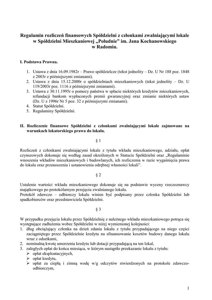 Regulamin rozliczeń finansowych Spółdzielni z członkami zwalniającymi lokale w Spółdzielni Mieszkaniowej „Południe” im. Jana Kochanowskiego w Radomiu. I. Podstawa Prawna. 1. Ustawa z dnia 16.09.1982r – Prawo spółdzielcze (tekst jednolity – Dz. U Nr 188 poz. 1848 z 2003r z późniejszymi zmianami). 2. Ustawa z dnia 15.12.2000r o spółdzielniach mieszkaniowych (tekst jednolity – Dz. U 119/2003r poz. 1116 z późniejszymi zmianami). 3. Ustawa z 30.11.1995r o pomocy państwa w spłacie niektórych kredytów mieszkaniowych, refundacji bankom wypłaconych premii gwarancyjnej oraz zmianie niektórych ustaw (Dz. U z 1996r Nr 5 poz. 32 z późniejszymi zmianami). 4. Statut Spółdzielni. 5. Regulaminy Spółdzielni. II. Rozliczenie finansowe Spółdzielni z członkami zwalniającymi lokale zajmowane na warunkach lokatorskiego prawa do lokalu. §1 Rozliczeń z członkami zwalniającymi lokale z tytułu wkładu mieszkaniowego, udziału, opłat czynszowych dokonuje się według zasad określonych w Statucie Spółdzielni oraz „Regulaminie wnoszenia wkładów mieszkaniowych i budowlanych, ich rozliczenia w razie wygaśnięcia prawa do lokalu oraz przenoszenia i ustanowienia odrębnej własności lokali”. §2 Ustalenie wartości wkładu mieszkaniowego dokonuje się na podstawie wyceny rzeczoznawcy majątkowego po protokólarnym przejęciu zwalnianego lokalu. Protokół zdawczo – odbiorczy lokalu winien być podpisany przez członka Spółdzielni lub spadkobierców oraz przedstawiciela Spółdzielni. §3 W przypadku przejęcia lokalu przez Spółdzielnię z naleŜnego wkładu mieszkaniowego potrąca się występujące zadłuŜenia wobec Spółdzielni w niŜej wymienionej kolejności: 1. dług obciąŜający członka na dzień zdania lokalu z tytułu przypadającego na niego części zaciągniętego przez Spółdzielnie kredytu na sfinansowanie kosztów budowy danego lokalu wraz z odsetkami, 2. nominalną kwotę umorzenia kredytu lub dotacji przypadającą na ten lokal, 3. zaległych opłat do końca miesiąca, w którym nastąpiło przekazanie lokalu z tytułu: opłat eksploatacyjnych, opłat kredytu, opłat za ciepłą i zimną wodę w/g odczytów stwierdzonych na protokole zdawczoodbiorczym, 1 opłat za centralne ogrzewanie w/g obowiązującego Regulaminu, kosztu operatu szacunkowego, odsetek od nieterminowych opłat, innych §4 W przypadku braku pokrycia wkładem mieszkaniowym zadłuŜeń wyszczególnionych w § 3 decyzję o umorzeniu odsetek lub o wliczeniu w koszty Spółdzielni podejmuje Zarząd Spółdzielni. §5 W rozliczeniu wkładu mieszkaniowego nie uwzględnia się długu obciąŜającego członka na dzień zdania lokalu z tytułu przypadającej na niego części zaciągniętego przez Spółdzielnię kredytu na sfinansowanie kosztów budowy danego lokalu wraz z odsetkami. §6 Wypłata wkładu mieszkaniowego albo jego części nie moŜe być wyŜsza od kwoty, jaką Spółdzielnia uzyska od członka obejmującego dany lokal w trybie przetargu przeprowadzonego przez Spółdzielnię. III. Rozliczenie finansowe Spółdzielni z członkami zwalniającymi lokale zajmowane na warunkach własnościowego prawa do lokalu. §7 Rozliczeń udziału i opłat z członkami Spółdzielni lub osobami niebędącymi członkami Spółdzielni, dokonuje się według zasad określonych w Statucie Spółdzielni i „Regulaminie wnoszenia wkładów mieszkaniowych i budowlanych, ich rozliczenia w razie wygaśnięcia prawa do lokalu oraz przenoszenia i ustanawiania odrębnej własności lokali”. §8 Ustalenie wartości wkładu budowlanego dokonuje się na podstawie wyceny rzeczoznawcy majątkowego po protokólarnym przejęciu zwalnianego lokalu. Protokół zdawczo – odbiorczy winien być podpisany przez członka Spółdzielni lub spadkobierców oraz przedstawiciela Spółdzielni. §9 Z wartości wkładu budowlanego w pierwszej kolejności potrąca się dług obciąŜający członka na dzień zdania lokalu z tytułu przypadającego na niego części zaciągniętego przez Spółdzielnię kredytu na sfinansowanie kosztów budowy danego lokalu wraz z odsetkami. § 10 Z naleŜnej, pozostałej części wartości wkładu budowlanego potrąca się występujące zadłuŜenie wobec Spółdzielni w kolejności określonej w § 3. 2 § 11 W przypadku braku pokrycia wkładem budowlanym zadłuŜenia wobec Spółdzielni decyzje w sprawie dalszego postępowania podejmuje kaŜdorazowo Zarząd Spółdzielni. IV. Rozliczenie wkładów budowlanych z tytułu rozwiązania umowy o budowę lokalu. § 12 W przypadku rozwiązania umowy o budowę lokalu przed zawarciem umowy o ustanowienie spółdzielczego prawa do lokalu lub odrębnej własności lokalu, Spółdzielnia zwraca uprawnionej osobie wniesioną część wkładu mieszkaniowego lub budowlanego. § 13 W przypadku rozwiązania umowy, o którym mowa w § 12 nastąpiło z przyczyn leŜących po stronie Spółdzielni naleŜny wkład jest zwracany w terminie 14 dni od rozwiązania umowy. § 14 W przypadku rozwiązania umowy, o którym mowa w § 12 nastąpiło z przyczyn leŜących po stronie członka naleŜny wkład jest zwracany w terminie 14 dni od zawarcia przez Spółdzielnię nowej umowy o budowę danego lokalu. V. Postanowienia końcowe. § 15 W sprawach nieuregulowanych w niniejszym Regulaminie mają zastosowanie postanowienia ustawy Prawo Spółdzielcze z dnia 16.09.1982r oraz ustawy z 15.12.2000r o spółdzielniach mieszkaniowych i Statut Spółdzielni. § 16 W sprawach nietypowych i wyjątkowych nie przewidzianych w niniejszym Regulaminie i przepisach określonych w § 1 decyzje podejmuje Zarząd Spółdzielni. § 17 Regulamin niniejszy został zatwierdzony Uchwałą Nr 9/2008 Zarządu Spółdzielni Mieszkaniowej „Południe’ im. Jana Kochanowskiego w Radomiu dnia 27 sierpnia 2008r. i obowiązuje od dnia jej podjęcia. 3