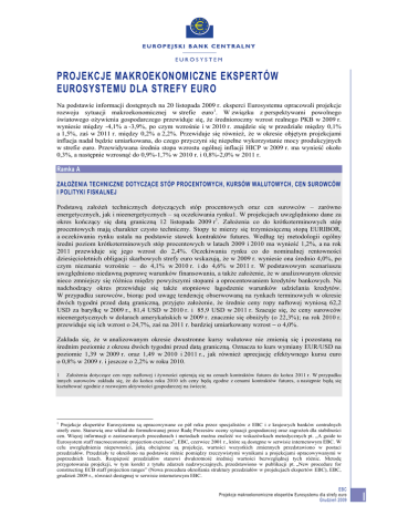 PROJEKCJE MAKROEKONOMICZNE EKSPERTÓW EUROSYSTEMU DLA STREFY EURO Na podstawie informacji dostępnych na 20 listopada 2009 r. eksperci Eurosystemu opracowali projekcje rozwoju sytuacji makroekonomicznej w strefie euro1. W związku z perspektywami powolnego światowego ożywienia gospodarczego przewiduje się, że średnioroczny wzrost realnego PKB w 2009 r. wyniesie między -4,1% a -3,9%, po czym wzrośnie i w 2010 r. znajdzie się w przedziale między 0,1% a 1,5%, zaś w 2011 r. między 0,2% a 2,2%. Przewiduje się również, że w okresie objętym projekcjami inflacja nadal będzie umiarkowana, do czego przyczyni się niepełne wykorzystanie mocy produkcyjnych w strefie euro. Przewidywana średnia stopa wzrostu ogólnej inflacji HICP w 2009 r. ma wynieść około 0,3%, a następnie wzrosnąć do 0,9%-1,7% w 2010 r. i 0,8%-2,0% w 2011 r. Ramka A ZAŁOŻENIA TECHNICZNE DOTYCZĄCE STÓP PROCENTOWYCH, KURSÓW WALUTOWYCH, CEN SUROWCÓW I POLITYKI FISKALNEJ Podstawą założeń technicznych dotyczących stóp procentowych oraz cen surowców – zarówno energetycznych, jak i nieenergetycznych – są oczekiwania rynku1. W projekcjach uwzględniono dane za okres kończący się datą graniczną 12 listopada 2009 r1. Założenia co do krótkoterminowych stóp procentowych mają charakter czysto techniczny. Stopy te mierzy się trzymiesięczną stopą EURIBOR, a oczekiwania rynku ustala na podstawie stawek kontraktów futures. Według tej metodologii ogólny średni poziom krótkoterminowych stóp procentowych w latach 2009 i 2010 ma wynieść 1,2%, a na rok 2011 przewiduje się jego wzrost do 2,4%. Oczekiwania rynku co do nominalnej rentowności dziesięcioletnich obligacji skarbowych strefy euro wskazują, że w 2009 r. wyniesie ona średnio 4,0%, po czym nieznanie wzrośnie – do 4,1% w 2010 r. i do 4,6% w 2011 r. W podstawowym scenariuszu uwzględniono niedawną poprawę warunków finansowania, a także założenie, że w analizowanym okresie nieco zmniejszy się różnica między powyższymi stopami a oprocentowaniem kredytów bankowych. Na nadchodzący okres przewiduje się także stopniowe łagodzenie warunków udzielania kredytów. W przypadku surowców, biorąc pod uwagę tendencję obserwowaną na rynkach terminowych w okresie dwóch tygodni przed datą graniczną, przyjęto założenie, że średnie ceny ropy naftowej wyniosą 62,2 USD za baryłkę w 2009 r., 81,4 USD w 2010 r. i 85,9 USD w 2011 r. Szacuje się, że ceny surowców nieenergetycznych w dolarach amerykańskich w 2009 r. znacznie się obniżyły (o 22,3%); na rok 2010 r. przewiduje się ich wzrost o 24,7%, zaś na 2011 r. bardziej umiarkowany wzrost − o 4,0%. Zakłada się, że w analizowanym okresie dwustronne kursy walutowe nie zmienią się i pozostaną na średnim poziomie z okresu dwóch tygodni przed datą graniczną. Oznacza to kurs wymiany EUR/USD na poziomie 1,39 w 2009 r. oraz 1,49 w 2010 i 2011 r., jak również aprecjację efektywnego kursu euro o 0,8% w 2009 r. i jeszcze o 2,2% w roku 2010. 1 Założenia dotyczące cen ropy naftowej i żywności opierają się na cenach kontraktów futures do końca 2011 r. W przypadku innych surowców zakłada się, że do końca roku 2010 ich ceny będą zgodne z cenami kontraktów futures, a następnie będą się kształtować zgodnie z rozwojem aktywności gospodarczej na świecie. 1 Projekcje ekspertów Eurosystemu są opracowywane co pół roku przez specjalistów z EBC i z krajowych banków centralnych strefy euro. Stanowią one wkład do formułowanej przez Radę Prezesów oceny sytuacji gospodarczej oraz zagrożeń dla stabilności cen. Więcej informacji o zastosowanych procedurach i metodach można znaleźć we wskazówkach metodycznych pt. „A guide to Eurosystem staff macroeconomic projection exercises”, EBC, czerwiec 2001 r., które są dostępne w serwisie internetowym EBC. W celu uwzględnienia niepewności, jaką obciążone są projekcje, wartości wszystkich zmiennych przedstawiono w postaci przedziałów. Przedziały te określono na podstawie różnic pomiędzy rzeczywistymi wynikami a projekcjami opracowywanymi w poprzednich latach. Rozpiętość przedziałów stanowi dwukrotność średniej wartości bezwzględnej tych różnic. Metodę przygotowania projekcji, w tym korekt z tytułu zdarzeń nadzwyczajnych, przedstawiono w publikacji pt. „New procedure for constructing ECB staff projection ranges” (Nowa procedura określania struktury przedziałów w projekcjach ekspertów EBC), EBC, grudzień 2009 r., również dostępnej w serwisie internetowym EBC. EBC Projekcje makroekonomiczne ekspertów Eurosystemu dla strefy euro Grudzień 2009 1 Założenia dotyczące polityki fiskalnej opierają się na planach budżetowych poszczególnych państw strefy euro dostępnych na dzień 20 listopada 2009 r. Uwzględniają one wszystkie posunięcia w zakresie polityki fiskalnej, które zostały już zatwierdzone przez parlamenty krajowe lub też zostały sprecyzowane przez rządy, a ich przyjęcie w procesie legislacyjnym jest prawdopodobne. OTOCZENIE MIĘDZYNARODOWE Widać oznaki dalszej poprawy światowych perspektyw gospodarczych; zwrot nastąpił w drugim kwartale 2009 r. Przewiduje się, że w najbliższym czasie ożywienie będzie przebiegało nierówno, gdyż będzie wynikiem przede wszystkim bodźców polityki pieniężnej i fiskalnej, odbicia w handlu międzynarodowym i zwrotu w cyklu zapasów. Wpływ niektórych czynników będzie jedynie tymczasowy, natomiast bardziej trwały korzystny wpływ na światowe ożywienie gospodarcze powinna wywrzeć poprawa warunków finansowania. Ogólnie przewiduje się, że w okresie objętym projekcjami wzrost gospodarczy na świecie przez cały czas utrzyma się poniżej trendu z przeszłości, gdyż z powodu utrzymujących się skutków kryzysu ożywienie będzie powolne, szczególnie w gospodarkach rozwiniętych. Szacuje się, że realny PKB na świecie z wyłączeniem strefy euro obniżył się w 2009 r. śr