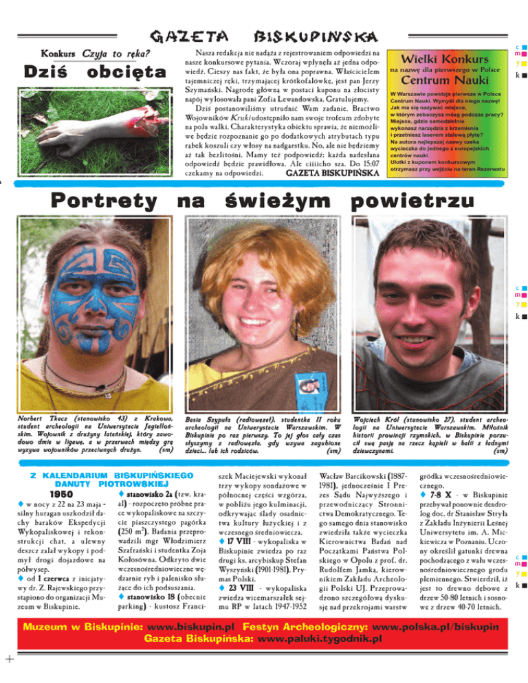 Konkurs Czyja to ręka? Dziś obcięta Nasza redakcja nie nadąża z rejestrowaniem odpowiedzi na nasze konkursowe pytania. Wczoraj wpłynęła aż jedna odpo− wiedź. Cieszy nas fakt, że była ona poprawna. Właścicielem tajemniczej ręki, trzymającej krótkofalówkę, jest pan Jerzy Szymański. Nagrodę główną w postaci kuponu na złocisty napój wylosowała pani Zofia Lewandowska. Gratulujemy. Dziś postanowiliśmy utrudnić Wam zadanie. Bractwo Wojowników Kruki udostępniło nam swoje trofeum zdobyte na polu walki. Charakterystyka obiektu sprawia, że niemożli− we będzie rozpoznanie go po dodatkowych atrybutach typu rąbek koszuli czy włosy na nadgarstku. No, ale nie będziemy aż tak bezlitośni. Mamy też podpowiedź: każda nadesłana odpowiedź będzie prawidłowa. Ale ciiiicho sza. Do 15:07 GAZET A BISKUPIŃSKA czekamy na odpowiedzi. GAZETA Wielki Konkurs na nazwę dla pierwszego w Polsce Centrum Nauki c m y k W Warszawie powstaje pierwsze w Polsce Centrum Nauki. Wymyœl dla niego nazwê! Jak ma siê nazywaæ miejsce, w którym zobaczysz mózg podczas pracy? Miejsce, gdzie samodzielnie wykonasz narzêdzia z krzemienia i przetniesz laserem stalow¹ p³ytê? Na autora najlepszej nazwy czeka wycieczka do jednego z europejskich centrów nauki. Ulotki z kuponem konkursowym otrzymasz przy wejœciu na teren Rezerwatu A Portrety na świeżym powietrzu c m y k Norbert Tkacz (stanowisko 43) z Krakowa, student archeologii na Uniwersytecie Jagielloń− skim. Wojownik z drużyny lateńskiej, który zawo− dowo dmie w ligawę, a w przerwach między grą wyzywa wojowników przeciwnych drużyn. (sm) Basia Szypuła (radiowęzeł), studentka II roku archeologii na Uniwerystecie Warszawskim. W Biskupinie po raz pierwszy. To jej głos cały czas słyszymy z radiowęzła, gdy wzywa zagubione dzieci... lub ich rodziców. (sm) Z KALENDARIUM BISKUPIŃSKIEGO DANUTY PIOTROWSKIEJ 1950 J w nocy z 22 na 23 maja − silny huragan uszkodził da− chy baraków Ekspedycji Wykopaliskowej i rekon− strukcji chat, a ulewny deszcz zalał wykopy i pod− mył drogi dojazdowe na półwysep. J od 1 czerwca z inicjaty− wy dr. Z. Rajewskiego przy− stąpiono do organizacji Mu− zeum w Biskupinie. isko 2a (tzw. kra− J stanow stanowisko al) − rozpoczęto próbne pra− ce wykopaliskowe na szczy− cie piaszczystego pagórka (250 m2). Badania przepro− wadzili mgr Włodzimierz Szafrański i studentka Zoja Kołosówna. Odkryto dwie wczesnośredniowieczne wę− dzarnie ryb i palenisko słu− żące do ich podsuszania. anowisko 18 (obecnie J st stanowisko parking) − kustosz Franci− szek Maciejewski wykonał trzy wykopy sondażowe w północnej części wzgórza, w pobliżu jego kulminacji, odkrywając ślady osadnic− twa kultury łużyckiej i z wczesnego średniowiecza. J 17 VIII − wykopaliska w Biskupinie zwiedza po raz drugi ks. arcybiskup Stefan Wyszyński (1901−1981), Pry− mas Polski. J 23 VIII − wykopaliska zwiedza wicemarszałek sej− mu RP w latach 1947−1952 Wojciech Król (stanowisko 27), student archeo− logii na Uniwersytecie Warszawskim. Miłośnik historii prowincji rzymskich, w Biskupinie porzu− cił swą pasję na rzecz kąpieli w balii z ładnymi dziewczynami. (sm) Wacław Barcikowski (1887− 1981), jednocześnie I Pre− zes Sądu Najwyższego i przewodniczący Stronni− ctwa Demokratycznego. Te− go samego dnia stanowisko zwiedziła także wycieczka Kierownictwa Badań nad Początkami Państwa Pol− skiego w Opolu z prof. dr. Rudolfem Jamką, kierow− nikiem Zakładu Archeolo− gii Polski UJ. Przeprowa− dzono szczegółową dysku− sję nad przekrojami warstw gródka wczesnośredniowie− cznego. J 7−8 X − w Biskupinie przebywał ponownie dendro− log doc. dr Stanisław Stryła z Zakładu Inżynierii Leśnej Uniwersytetu im. A. Mic− kiewicza w Poznaniu. Uczo− ny określił gatunki drewna pochodzącego z wału wczes− nośredniowiecznego grodu plemiennego. Stwierdził, iż jest to drewno dębowe z drzew 50−80 letnich i sosno− we z drzew 40−70 letnich. Muzeum w Biskupinie: www.biskupin.pl Festyn Archeologiczny: www.polska.pl/biskupin Gazeta Biskupińska: www.paluki.tygodnik.pl c m y k