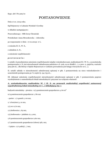 Sygn. akt I Ns 309/10 POSTANOWIENIE Dnia 17.01. 2013 roku. Sąd Rejonowy w Lubaniu Wydział I Cywilny w składzie następującym : Przewodniczący - SSR Jerzy Chruściak Protokolant: Anna Mroczkowska – Jełowicka po rozpoznaniu w dniu : 17.01.2013r. w L. z wniosku H. S., W. S., z udziałem A. D., o zniesienie współwłasności postanawia: I. ustalić, iż przedmiotem zniesienia współwłasności między wnioskodawcami, małżonkami H. i W. S., a uczestniczka postepowania A. D. jest nieruchomość zabudowana położona w S. 306, za nr działki (...), o pow. 0, 3956 ha, wartości 309 506 zł,-, dla której w Sądzie Rejonowym w Lubaniu prowadzona jest księga wieczysta kw nr (...), II. ustalić udziały w nieruchomości zabudowanej opisanej w pkt. I postanowienia na rzecz wnioskodawców i uczestniczki postepowania po ½ części tj. 154 753 zł,-, III. dokonać zniesienia współwłasności nieruchomości zabudowanej opisanej w pkt. I postanowienia poprzez wyodrębnienie 2 samodzielnych lokali mieszkalnych i przyznać na wyłączna własność: A. wnioskodawców małżonków W. i H. S. na prawach małżeńskiej wspólności ustawowej wyodrębniony lokal mieszkalny nr (...) składający się z : budynek mieszkalny - piwnica : 0/3 pomieszczenie gospodarcze 4, 60 m2 0/4 pomieszczenie gospodarcze 1, 80 m2 - parter : 1/1 ganek 2, 00 m2, 1/ 2 korytarz 3, 10 m2, 1/3 wc 0,70 m2, 1/4 kotłownia 1, 63 m2, 1/5 kotłowania + jadalnia 12, 4 m2, 1/6 pomieszczenie gospodarcze 2,60 m2, 1/7 pomieszczenie gospodarcze (obora) 48,1 m2, - I piętro : 2/1 pokój (...) m2, 2/2 łazienka 2,60 m2, 2/3 pokój (...) m2, 2/4 pokój (...) m2 2/5 garderoba 1, 50 m2, 2/6 pokój (...) m2, 2, 7 pokój (...) m2, 2/12 pokój (...) m2, 2/13 kuchnia 3,10 m2, 2/14 łazienka 1, 50 m2, - strych : 3/1 pomieszczenie gospodarcze 76,0m2, - budynek gospodarczy z łącznikiem: 4/4 korytarz 2,30 m2, 4/5 pomieszczenie gospodarcze 14,2 m2, 4/6 pomieszczenie gospodarcze 65,3 m2, 4/7 pomieszczenie gospodarcze 6,52 m2, 4/8 pomieszczenie gospodarcze 19,2 m2, 4/11 pomieszczenie gospodarcze 28,3 m2, - budynek gospodarczy – parter: 4/9 pomieszczenie gospodarcze 129,20 m2, - budynek gospodarczy – piwnica: 5/2 pomieszczenie gospodarcze 6,50 m2, o łącznej powierzchni 472, 65 m2 wraz z udziałem wynoszącym 49,89% w elementach wspólnych budynku mieszkalnego i budynków gospodarczych oraz prawie własności działki o nr (...) i pow. 0, 3956 ha , dla której w Sądzie Rejonowy m w L. prowadzona jest księga wieczysta kw nr (...), wartości 124 367 zł,- oznaczony kolorem żółtym i opisany w opinii biegłego sądowego z zakresu budownictwa inż. K. L. (1) oraz rzeczoznawcy majątkowego L. O. (1) z października 2011r. oraz opinii uzupełniającej z listopada 2012r. (k 114 i 203 akt sprawy INs 309/10), B. uczestniczki postepowania A. D. wyodrębniony lokal mieszkalny nr (...) składający się z: budynek mieszkalny - piwnica : 0/2 pomieszczenie gospodarcze 6,30 m2 - parter : 1/8 pokój (...) m2, 1/ 9 korytarz 4,80 m2, 1/10 łazienka 9, 25 m2, 1/11 korytarz 9,72 m2, 1/12 korytarz 3, 02 m2, 1/13 kuchnia 13, 0 m2, 1/14 pokój (...) m2, 1/15 kotłownia 1, 74 m2, - I piętro : 2/8 kotłowania 0, 70 m2, 2/9 łazienka 1, 50 m2, 2/10 kuchnia 5, 00 m2, 2/11 pokój (...) m2 2/15 łazienka 3,60 m2, 2/16 kuchnia 5, 40 m2, 2/17 pokój (...) m2, 2/18 pokój (...) m2, - strych : 3/2 pomieszczenie gospodarcze 83,50 m2, - budynek gospodarczy z łącznikiem: 4/1 pomieszczenie gospodarcze 9,22 m2, 4/2 pomieszczenie gospodarcze 32,8 m2, 4/3 pomieszczenie gospodarcze 38,2 m2, 4/12 pomieszczeni gospodarcze (poddasze)43,7 m2, - budynek gospodarczy : 4/10 pomieszczenie gospodarcze 129,8 m2, - budynek gospodarczy : 6/1 pomieszczenie gospodarcze 4, 40 m2, 6/2 pomieszczenie gospodarcze 1, 80 m2 o łącznej powierzchni 474, 79 m2 wraz z udziałem wynoszącym 50, 11% w elementach wspólnych budynku mieszkalnego i budynków gospodarczych oraz prawie własności działki o nr (...) i pow. 0, 3956 ha , dla której w Sądzie Rejonowy m w L. prowadzona jest księga wieczysta kw nr (...), wartości 186 267 zł,- oznaczonej kolorem pomarańczowym opisany w opinii biegłego sądowego z zakresu budownictwa inż. K. L. (1) oraz rzeczoznawcy majątkowego L. O. (1) z października 2011r. oraz opinii uzupełniającej z listopada 2012r.( k 114 i 203 akt sprawy INs 309/10), IV. ustalić koszt wyodrębnienia lokali na kwotę 6. 655 zł,- i obciążyć nimi wnioskodawców oraz uczestniczkę postepowania stosownie do wielkości udziałów tj. wnioskodawców w udziale wynoszącym 49, 89 % - 3, 320 zł,-, natomiast uczestniczkę postępowania w udziale 50, 11 % tj. kwocie 3, 335 zł,-, V. zasądzić od uczestniczki postepowania na rzecz wnioskodawców kwotę 500 zł,- tytułem połowy opłaty sądowej, VI. koszty postepowania związane z udziałem pełnomocników wzajemnie znieść. Sygn. akt INs 309/10 UZASADNIENIE Wnioskodawcy H. i W. S. złożyli wniosek o zniesienie współwłasności nieruchomości zabudowanej położonej w S. nr 306 stanowiącej współwłasność wnioskodawców i uczestniczki postępowania A. D. po ½ części, dla której w Sądzie Rejonowym w Lubaniu prowadzona jest księga wieczysta kw nr (...). W uzasadnieniu swojego wniosku domagali się zniesienia współwłasności poprzez fizyczny podział budynku mieszkalnego i budynków gospodarczych wzdłuż płaszczyzny pionowej. Uczestniczka postępowania A. D. w odpowiedzi na wniosek ( k 29 akt sprawy) wniosła o jego oddalenie podnosząc, iż brak jest możliwości zniesienia współwłasności poprzez wydzielenie części budynku mieszkalnego i budynków gospodarczych kierując się przebiegiem podziału wzdłuż płaszczyzny pionowej budynku mieszkalnego i budynków gospodarczych. Sąd ustalił: Strony postępowania wnioskodawcy H. i W. S. oraz A. D. są współwłaścicielami nieruchomości zabudowanej położonej w S. nr 306 , za nr działki (...), o pow. 0, 3956 ha, dla której w Sądzie Rejonowym w Lubaniu pr