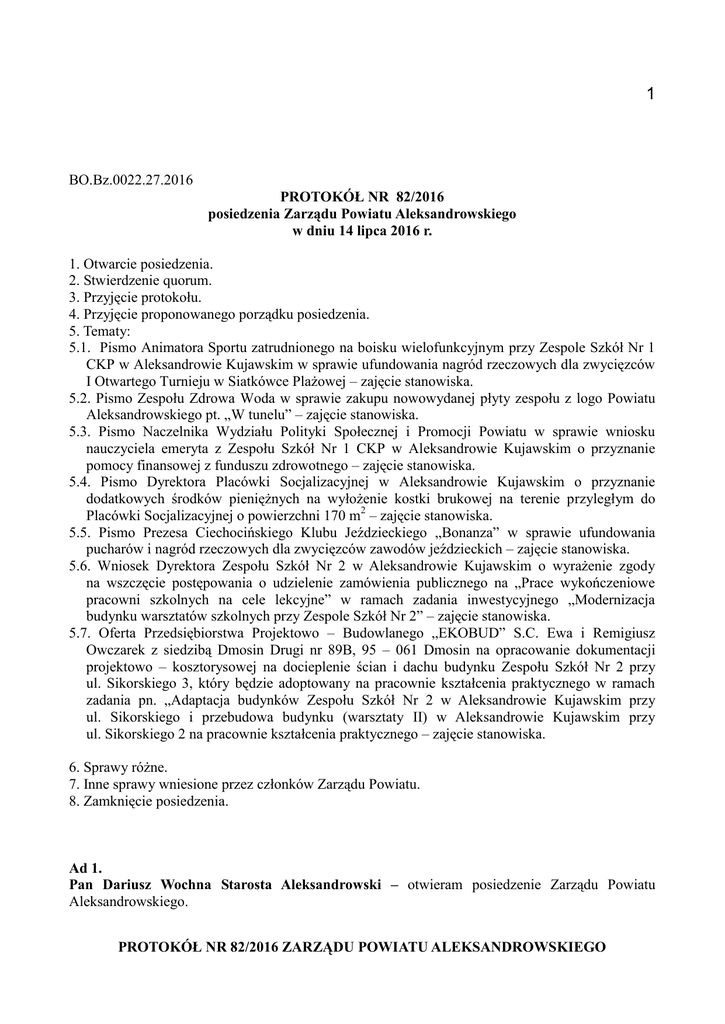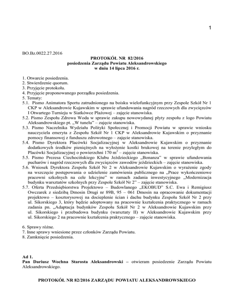 1 BO.Bz.0022.27.2016 PROTOKÓŁ NR 82/2016 posiedzenia Zarządu Powiatu Aleksandrowskiego w dniu 14 lipca 2016 r. 1. Otwarcie posiedzenia. 2. Stwierdzenie quorum. 3. Przyjęcie protokołu. 4. Przyjęcie proponowanego porządku posiedzenia. 5. Tematy: 5.1. Pismo Animatora Sportu zatrudnionego na boisku wielofunkcyjnym przy Zespole Szkół Nr 1 CKP w Aleksandrowie Kujawskim w sprawie ufundowania nagród rzeczowych dla zwycięzców I Otwartego Turnieju w Siatkówce Plażowej – zajęcie stanowiska. 5.2. Pismo Zespołu Zdrowa Woda w sprawie zakupu nowowydanej płyty zespołu z logo Powiatu Aleksandrowskiego pt. „W tunelu” – zajęcie stanowiska. 5.3. Pismo Naczelnika Wydziału Polityki Społecznej i Promocji Powiatu w sprawie wniosku nauczyciela emeryta z Zespołu Szkół Nr 1 CKP w Aleksandrowie Kujawskim o przyznanie pomocy finansowej z funduszu zdrowotnego – zajęcie stanowiska. 5.4. Pismo Dyrektora Placówki Socjalizacyjnej w Aleksandrowie Kujawskim o przyznanie dodatkowych środków pieniężnych na wyłożenie kostki brukowej na terenie przyległym do Placówki Socjalizacyjnej o powierzchni 170 m2 – zajęcie stanowiska. 5.5. Pismo Prezesa Ciechocińskiego Klubu Jeździeckiego „Bonanza” w sprawie ufundowania pucharów i nagród rzeczowych dla zwycięzców zawodów jeździeckich – zajęcie stanowiska. 5.6. Wniosek Dyrektora Zespołu Szkół Nr 2 w Aleksandrowie Kujawskim o wyrażenie zgody na wszczęcie postępowania o udzielenie zamówienia publicznego na „Prace wykończeniowe pracowni szkolnych na cele lekcyjne” w ramach zadania inwestycyjnego „Modernizacja budynku warsztatów szkolnych przy Zespole Szkół Nr 2” – zajęcie stanowiska. 5.7. Oferta Przedsiębiorstwa Projektowo – Budowlanego „EKOBUD” S.C. Ewa i Remigiusz Owczarek z siedzibą Dmosin Drugi nr 89B, 95 – 061 Dmosin na opracowanie dokumentacji projektowo – kosztorysowej na docieplenie ścian i dachu budynku Zespołu Szkół Nr 2 przy ul. Sikorskiego 3, który będzie adoptowany na pracownie kształcenia praktycznego w ramach zadania pn. „Adaptacja budynków Zespołu Szkół Nr 2 w Aleksandrowie Kujawskim przy ul. Sikorskiego i przebudowa budynku (warsztaty II) w Aleksandrowie Kujawskim przy ul. Sikorskiego 2 na pracownie kształcenia praktycznego – zajęcie stanowiska. 6. Sprawy różne. 7. Inne sprawy wniesione przez członków Zarządu Powiatu. 8. Zamknięcie posiedzenia. Ad 1. Pan Dariusz Wochna Starosta Aleksandrowski – otwieram posiedzenie Zarządu Powiatu Aleksandrowskiego. PROTOKÓŁ NR 82/2016 ZARZĄDU POWIATU ALEKSANDROWSKIEGO 2 Witam członków Zarządu Powiatu, Wicestarostę pana Wojciecha Marjańskiego, Skarbnika Powiatu panią Dorotę Sobierajską, Sekretarza Powiatu pana Piotra Marciniaka. Posiedzenie Zarządu Powiatu zostało otwarte o godzinie 10:00. Ad. 2. Pan Dariusz Wochna – stwierdzam quorum. W posiedzeniu uczestniczy dwóch członków Zarządu Powiatu. Nieobecny jest członek Zarządu Powiatu pan Lotfi Mansour. Posiedzenie jest prawomocne i Zarząd może podejmować uchwały. Lista obecności stanowi załącznik do protokołu. Ad 3. Pan Dariusz Wochna – Pan Dariusz Wochna – proponuję przyjąć bez czytania protokół nr 81/2016 posiedzenia Zarządu Powiatu z dnia 7 lipca 2016r. Czy są uwagi, propozycje zmian, czy uzupełnień do przedłożonego protokołu nr 81/2016 posiedzenia Zarządu Powiatu z dnia 7 lipca 2016r.? Nie widzę. Proponuję przyjąć go bez czytania. Kto jest za? Dziękuję. Przebieg głosowania: Za – 2, Przeciw – nie było, Wstrzymujących się – nie było. Jednogłośnie. Członkowie Zarządu Powiatu, w wyniku głosowania przyjęli protokół nr 81/2016 posiedzenia Zarządu Powiatu z dnia 7 lipca 2016r. Ad 4. Pan Dariusz Wochna – przechodzimy do proponowanego porządku dzisiejszego posiedzenia. Proponuję poszerzyć porządek o punkt: 5.5. Pismo Prezesa Ciechocińskiego Klubu Jeździeckiego „Bonanza” w sprawie ufundowania pucharów i nagród rzeczowych dla zwycięzców zawodów jeździeckich – zajęcie stanowiska. Kto jest za rozszerzeniem porządku posiedzenia o punkt 5.5.? Dziękuję. Przebieg głosowania: Za – 2, Przeciw – nie było, Wstrzymujących się – nie było. Jednogłośnie. Pan Dariusz Wochna – czy są inne wnioski o zmianę porządku posiedzenia? Pan Wojciech Marjański – wnoszę o poszerzenie porządku o punkty: 5.6. Wniosek Dyrektora Zespołu Szkół Nr 2 w Aleksandrowie Kujawskim o wyrażenie zgody na wszczęcie postępowania o udzielenie zamówienia publicznego na „Prace wykończeniowe pracowni szkolnych na cele lekcyjne” w ramach zadania inwestycyjnego „Modernizacja budynku warsztatów szkolnych przy Zespole Szkół Nr 2” – zajęcie stanowiska. PROTOKÓŁ NR 82/2016 ZARZĄDU POWIATU ALEKSANDROWSKIEGO 3 5.7. Oferta Przedsiębiorstwa Projektowo – Budowlanego „EKOBUD” S.C. Ewa i Remigiusz Owczarek z siedzibą Dmosin Drugi nr 89B, 95 – 061 Dmosin na opracowanie dokumentacji projektowo – kosztorysowej na docieplenie ścian i dachu budynku Zespołu Szkół Nr 2 przy ul. Sikorskiego 3, który będzie adoptowany na pracownie kształcenia praktycznego w ramach zadania pn. „Adaptacja budynków Zespołu Szkół Nr 2 w Aleksandrowie Kujawskim przy ul. Sikorskiego i przebudowa budynku (warsztaty II) w Aleksandrowie Kujawskim przy ul. Sikorskiego 2 na pracownie kształcenia praktycznego – zajęcie stanowiska. Pan Dariusz Wochna – kto jest za rozszerzeniem porządku posiedzenia o punkt 5.6. i 5.7.? Dziękuję. Przebieg głosowania: Za – 2, Przeciw – nie było, Wstrzymujących się – nie było. Jednogłośnie. Porządek posiedzenia Zarządu Powiatu został rozszerzony o punkt 5.5.- 5.7. Porządek posiedzenia Zarządu Powiatu, stanowi załącznik do protokołu. Ad 5.1. Pismo Animatora Sportu zatrudnionego na boisku wielofunkcyjnym przy Zespole Szkół Nr 1 CKP w Aleksandrowie Kujawskim w sprawie ufundowania nagród rzeczowych dla zwycięzców I Otwartego Turnieju w Siatkówce Plażo