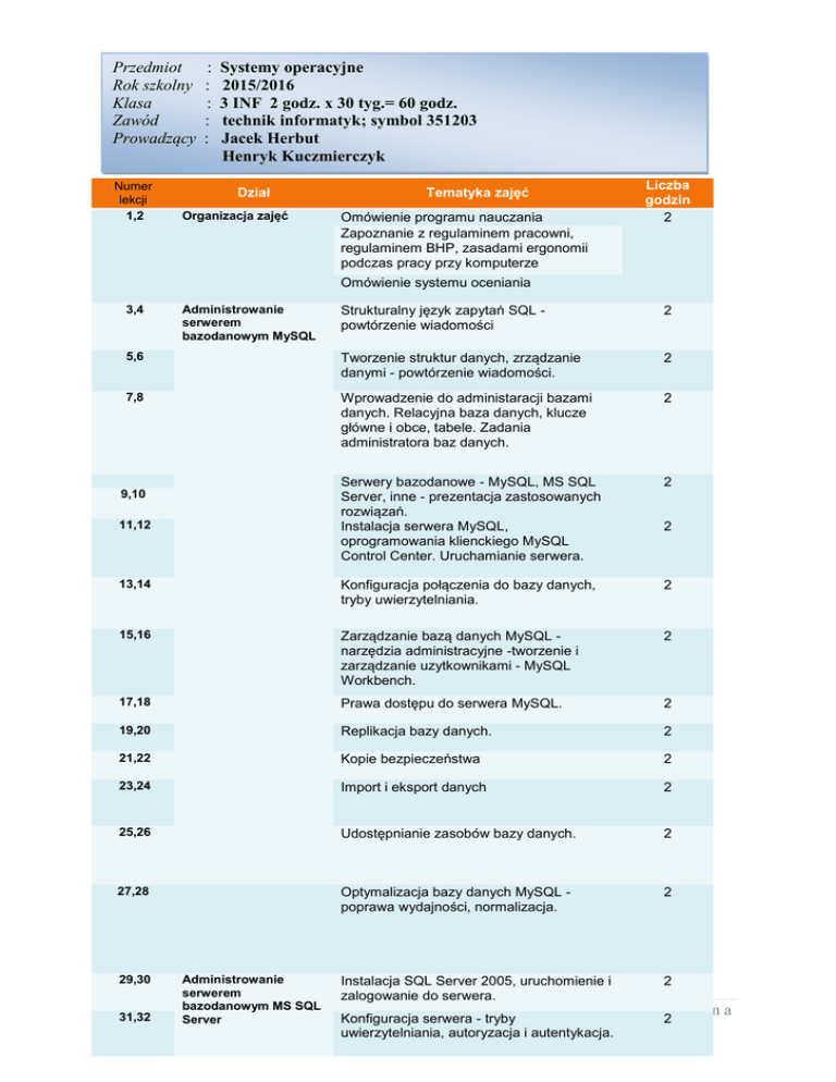 Przedmiot Rok szkolny Klasa Zawód Prowadzący Numer lekcji 1,2 : : : : : Systemy operacyjne 2015/2016 3 INF 2 godz. x 30 tyg.= 60 godz. technik informatyk; symbol 351203 Jacek Herbut Henryk Kuczmierczyk Dział Organizacja zajęć Tematyka zajęć Omówienie programu nauczania Zapoznanie z regulaminem pracowni, regulaminem BHP, zasadami ergonomii podczas pracy przy komputerze Liczba godzin 2 Omówienie systemu oceniania Strukturalny język zapytań SQL powtórzenie wiadomości 2 5,6 Tworzenie struktur danych, zrządzanie danymi - powtórzenie wiadomości. 2 7,8 Wprowadzenie do administaracji bazami danych. Relacyjna baza danych, klucze główne i obce, tabele. Zadania administratora baz danych. 2 Serwery bazodanowe - MySQL, MS SQL Server, inne - prezentacja zastosowanych rozwiązań. Instalacja serwera MySQL, oprogramowania klienckiego MySQL Control Center. Uruchamianie serwera. 2 13,14 Konfiguracja połączenia do bazy danych, tryby uwierzytelniania. 2 15,16 Zarządzanie bazą danych MySQL narzędzia administracyjne -tworzenie i zarządzanie uzytkownikami - MySQL Workbench. 2 17,18 Prawa dostępu do serwera MySQL. 2 19,20 Replikacja bazy danych. 2 21,22 Kopie bezpieczeństwa 2 23,24 Import i eksport danych 2 25,26 Udostępnianie zasobów bazy danych. 2 27,28 Optymalizacja bazy danych MySQL poprawa wydajności, normalizacja. 2 Instalacja SQL Server 2005, uruchomienie i zalogowanie do serwera. 2 3,4 Administrowanie serwerem bazodanowym MySQL 9,10 11,12 29,30 31,32 Administrowanie serwerem bazodanowym MS SQL Server Konfiguracja serwera - tryby uwierzytelniania, autoryzacja i autentykacja. 2 1|Strona 2 33,34 Typy danych dostarczanych przez MS SQL Server Data Definition Language - tworzenie struktur bazy danych 2 35,36 Data Manipulation Language - operacje na danych. 2 37,38 Prawa dostępu do serwera MS SQL - role, uprawnienia. 2 39,40 Replikacja bazy danych MS SQL 2005 typy replikacji, modele, 2 41,42 Kopie bezpieczeństwa - konfigurowanie, sprawdzanie spójności, przywracanie bazy z kopii. 2 43,44 Eksport i import danych 2 45,46 Udostępnianie zasobów bazy danych MS SQL. 2 47,48 Filtracja danych, funkcje agregujące 2 49,50 Łączenie tabel. 2 51,52 Praca z podzapytańami, tabelami tymczasowymi i zmiennymi tabelarycznymi 2 53,54 Data Control Language - schematy 2 55,56 Transakcje, zarządzanie transakcjami 2 57,58 Procedury składowalne i funkcje bazodanowe Zastosowanie XML i Xquery w bazie danych. 2 59,60 Razem: 2 60 2|Strona EFEKTY KSZTAŁCENIA 11.1. Modyfikacja i optymalizacja bazy danych Uszczegółowione efekty kształcenia Poziom wymagań Kategoria Materiał nauczania Uczeń po zrealizowaniu zajęć potrafi: programowych taksonomiczna PKZ(E.b)(11)7 skorzystać z publikacji elektronicznych dotyczących Różne SZBD. P C administrowania bazami danych; Funkcje SZBD. PKZ(E.b)(11)8 ocenić publikacje elektroniczne dotyczące Serwery sieciowych baz danych (MySQL, MsSQL, Oracle itp.). P D administrowania bazami danych; Właściwości bazy danych. PKZ(E.b)(12)1 przestrzegać zasad zarządzania projektem w trakcie Współdzielenie danych. P C organizacji pracy z bazami danych; Integracja i integralność danych. PKZ(E.b)(12)2 przestrzegać zasad zarządzania projektem w trakcie Trwałość danych. P C planowania pracy z bazami danych; Bezpieczeństwo danych. PKZ(E.b)(13)5 rozróżnić programy komputerowe wspomagające Abstrakcja danych. P B wykonywanie zadań z zakresu administrowania bazami danych; Niezależność danych. PKZ(E.b)(13)6 zastosować programy komputerowe wspomagające Instalacja bazy danych. P C wykonywanie zadań z zakresu administrowania bazami danych; Uruchamianie i wyłączanie serwera bazy danych. E.14.2(1)1 scharakteryzować składnię strukturalnego języka Uzyskiwanie informacji o serwerze i bazach danych. P B zapytań; Konfiguracja, optymalizacja konfiguracji serwera. E.14.2(1)2 skorzystać z funkcji strukturalnego języka zapytań; P C Optymalizacja bazy danych. E.14.2(2)1 zastosować instrukcje strukturalnego języka zapytań Język SQL. P C w celu strukturalizacji informacji w bazie danych; Instrukcje sterowania dostępem do danych. E.14.2(2)2 zastosować instrukcje strukturalnego języka zapytań Optymalizacja zapytań. P C w celu wyszukiwania informacji w bazie danych; Transakcje. E.14.2(2)3 zastosować instrukcje strukturalnego języka zapytań P C w celu zmiany informacji w bazie danych; E.14.2(6)1 zainstalować systemy baz danych; P C E.14.2(6)2 zainstalować systemy zarządzania bazami danych; P C E.14.2(7)1 zmodyfikować strukturę bazy danych; P C E.14.2(7)2 rozbudować strukturę bazy danych; P C E.14.2(9)1 zarządzać bazą danych; P C E.14.2(11)2 wyeksportować raport do pliku HTML; P C E.14.2(13)1 kontrolować spójność fizyczną bazy danych; P C E.14.2(13)2 kontrolować spójność logiczną bazy danych. P C Planowane zadania (ćwiczenia) Zainstaluj MySQL w systemie Windows a następnie przygotuj jego początkową konfigurację zgodnie z załączoną kartą pracy. Zadanie może być wykonywane w grupach lub indywidualnie. Warunki osiągania efektów kształcenia w tym środki dydaktyczne, metody, formy organizacyjne Zajęcia można realizować w pracowni aplikacji internetowych z podziałem na grupy do 16 osób. 3|Strona 11.1. Modyfikacja i optymalizacja bazy danych Środki dydaktyczne W pracowni, w której prowadzone będą zajęcia edukacyjne powinny się znajdować: Komputery z zainstalowanym systemem zarządzania bazą danych oraz dostępem do Internetu (jedno stanowisko na jednego ucznia). Komputer (notebook) dla nauczyciela i projektor multimedialny. Zestawy ćwiczeń dla uczniów. Prezentacje tematyczne. Zalecane metody dydaktyczne Dominująca metodą kształcenia powinna być metoda tekstu przewodniego oraz metoda projektu. Formy organizacyjne Zajęcia powinny być prowadzone w formie pracy indywidualnej. Propozycje kryteriów oceny i metod sprawdzania efektów kształcenia Do oceny osiągnięć edukacyjnych uczących się proponuje się pr