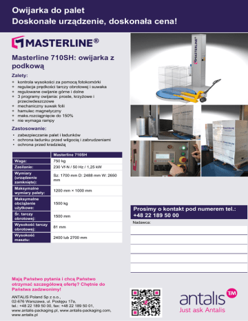 Owijarka do palet Doskonałe urządzenie, doskonała cena! Masterline 710SH: owijarka z podkową Zalety: + + + + + + + + kontrola wysokości za pomocą fotokomórki regulacja prędkości tarczy obrotowej i suwaka regulowane owijanie górne i dolne 3 programy owijania: proste, krzyżowe i przeciwdeszczowe mechaniczny suwak folii hamulec magnetyczny maks.rozciągnięcie do 150% nie wymaga rampy Zastosowanie: • zabezpieczanie palet i ładunków • ochrona ładunku przed wilgocią i zabrudzeniami • ochrona przed kradzieżą Masterline 710SH Waga: 750 kg Zasilanie: 230 Vf-N / 50 Hz / 1,25 kW Wymiary (urządzenie zamknięte): Sz: 1700 mm D: 2488 mm W: 2650 mm Maksymalne wymiary palety: 1200 mm × 1000 mm Maksymalne obciążenie użytkowe: 1500 kg Śr. tarczy obrotowej: 1500 mm Wysokość tarczy obrotowej: 81 mm Wysokość masztu: 2400 lub 2700 mm Prosimy o kontakt pod numerem tel.: +48 22 189 50 00 Nadawca: Mają Państwo pytania i chcą Państwo otrzymać szczegółową ofertę? Chętnie do Państwa zadzwonimy! ANTALIS Poland Sp z o.o., 02-676 Warszawa, ul. Postępu 17a, tel.: +48 22 189 50 00, fax: +48 22 189 50 01, www.antalis-packaging.pl, www.antalis-packaging.com, www.antalis.pl
