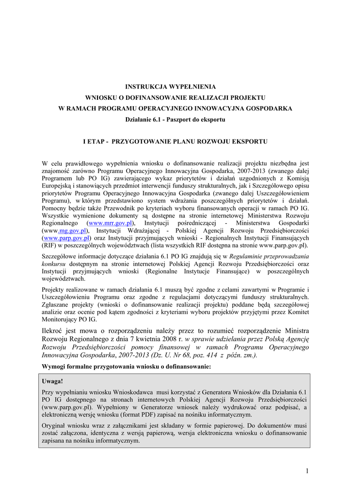 INSTRUKCJA WYPEŁNIENIA WNIOSKU O DOFINANSOWANIE REALIZACJI PROJEKTU W RAMACH PROGRAMU OPERACYJNEGO INNOWACYJNA GOSPODARKA Działanie 6.1 - Paszport do eksportu I ETAP - PRZYGOTOWANIE PLANU ROZWOJU EKSPORTU W celu prawidłowego wypełnienia wniosku o dofinansowanie realizacji projektu niezbędna jest znajomość zarówno Programu Operacyjnego Innowacyjna Gospodarka, 2007-2013 (zwanego dalej Programem lub PO IG) zawierającego wykaz priorytetów i działań uzgodnionych z Komisją Europejską i stanowiących przedmiot interwencji funduszy strukturalnych, jak i Szczegółowego opisu priorytetów Programu Operacyjnego Innowacyjna Gospodarka (zwanego dalej Uszczegółowieniem Programu), w którym przedstawiono system wdrażania poszczególnych priorytetów i działań. Pomocny będzie także Przewodnik po kryteriach wyboru finansowanych operacji w ramach PO IG. Wszystkie wymienione dokumenty są dostępne na stronie internetowej Ministerstwa Rozwoju Regionalnego (www.mrr.gov.pl), Instytucji pośredniczącej - Ministerstwa Gospodarki (www.mg.gov.pl), Instytucji Wdrażającej - Polskiej Agencji Rozwoju Przedsiębiorczości (www.parp.gov.pl) oraz Instytucji przyjmujących wnioski - Regionalnych Instytucji Finansujących (RIF) w poszczególnych województwach (lista wszystkich RIF dostępna na stronie www.parp.gov.pl). Szczegółowe informacje dotyczące działania 6.1 PO IG znajdują się w Regulaminie przeprowadzania konkursu dostępnym na stronie internetowej Polskiej Agencji Rozwoju Przedsiębiorczości oraz Instytucji przyjmujących wnioski (Regionalne Instytucje Finansujące) w poszczególnych województwach. Projekty realizowane w ramach działania 6.1 muszą być zgodne z celami zawartymi w Programie i Uszczegółowieniu Programu oraz zgodne z regulacjami dotyczącymi funduszy strukturalnych. Zgłaszane projekty (wnioski o dofinansowanie realizacji projektu) poddane będą szczegółowej analizie oraz ocenie pod kątem zgodności z kryteriami wyboru projektów przyjętymi przez Komitet Monitorujący PO IG. Ilekroć jest mowa o rozporządzeniu należy przez to rozumieć rozporządzenie Ministra Rozwoju Regionalnego z dnia 7 kwietnia 2008 r. w sprawie udzielania przez Polską Agencję Rozwoju Przedsiębiorczości pomocy finansowej w ramach Programu Operacyjnego Innowacyjna Gospodarka, 2007-2013 (Dz. U. Nr 68, poz. 414 z późn. zm.). Wymogi formalne przygotowania wniosku o dofinansowanie: Uwaga! Przy wypełnianiu wniosku Wnioskodawca musi korzystać z Generatora Wniosków dla Działania 6.1 PO IG dostępnego na stronach internetowych Polskiej Agencji Rozwoju Przedsiębiorczości (www.parp.gov.pl). Wypełniony w Generatorze wniosek należy wydrukować oraz podpisać, a elektroniczną wersję wniosku (format PDF) zapisać na nośniku informatycznym. Oryginał wniosku wraz z załącznikami jest składany w formie papierowej. Do dokumentów musi zostać załączona, identyczna z wersją papierową, wersja elektroniczna wniosku o dofinansowanie zapisana na nośniku informatycznym. 1 1) Wniosek powinien zawierać informacje umożliwiające dokonanie pełnej oceny pozwalającej na udzielenie wsparcia. 2) Należy zastosować właściwy dla Działania 6.1 formularz wniosku udostępniony na stronie internetowej PARP i Instytucji przyjmującej wnioski (RIF). 3) Wniosek powinien być kompletny, zawierać wszystkie ponumerowane strony; wniosek powinien być trwale spięty. 4) Wszystkie wymagane pola wniosku muszą być wypełnione zgodnie z niniejszą instrukcją, w tym podane wszystkie wymagane dane oraz informacje lub adnotacje „nie dotyczy”. Pola wyboru oznaczone kwadratami należy zaznaczyć poprzez wstawienie znaku „X”. 5) Wniosek powinien zostać złożony we właściwej formie (wersja papierowa – wydruk z Generatora Wniosków dla Działania 6.1 oraz wersja elektroniczna). 6) Wersja papierowa i elektroniczna wniosku muszą być tożsame (posiadać ten sam numer identyfikatora). 7) Wniosek powinien zostać wypełniony w formie druku w języku polskim. 8) Wniosek powinien zawierać poprawne wyliczenia arytmetyczne. 9) Wniosek powinien zostać podpisany przez Wnioskodawcę lub osobę upoważnioną do reprezentowania Wnioskodawcy (pełnomocnika) oraz opatrzony pieczątką imienną osoby podpisującej wniosek. W przypadku braku pieczątki imiennej dopuszcza się złożenie czytelnego podpisu oraz pieczątki firmowej wnioskodawcy. 10) Kwota wnioskowanego dofinansowania oraz odpowiednio całkowite wydatki na realizację projektu podane we wniosku o dofinansowanie powinny być spójne – należy sprawdzić zgodność danych w korespondujących rubrykach wniosku. 11) Załączniki w formie kopii muszą być potwierdzone za zgodność z oryginałem przez Wnioskodawcę lub osobę/osoby upoważnione do reprezentowania Wnioskodawcy na każdej stronie dokumentu (Przez kopię potwierdzoną za zgodność z oryginałem należy rozumieć kopię dokumentu zawierającego klauzulę za zgodność z oryginałem umieszczoną na każdej stronie dokumentu wraz z czytelnym podpisem osoby uprawnionej do reprezentacji, lub kopię dokumentu zawierająca na pierwszej stronie dokumentu klauzulę za zgodność z oryginałem od strony ... do strony... oraz czytelny podpis osoby uprawnionej do reprezentacji, a także parafowanie każdej strony dokumentu). Uwaga! W okresie realizacji działania 6.1 możliwe jest jednokrotne uzyskanie dofinansowania na przygotowanie Planu rozwoju eksportu. Uwaga! Rubryki opisowe wniosku o dofinansowanie muszą uwzględniać wszystkie wymagane w danym punkcie informacje wskazane w niniejszej instrukcji. Brak niektórych informacji może prowadzić do negatywnej oceny w odniesieniu do odpowiedniego kryterium merytorycznego. Uwaga! Nie można dokonywać zmian we wzorze wniosku, w tym nie można wklejać dodatkowych tabel ani rysunków. Pierwsze dwie rubryki wniosku Data wpływu wniosku o dofinansowanie oraz Numer wniosku o dofinansowanie są wypełniane przez instytucję przyjmującą wniosek