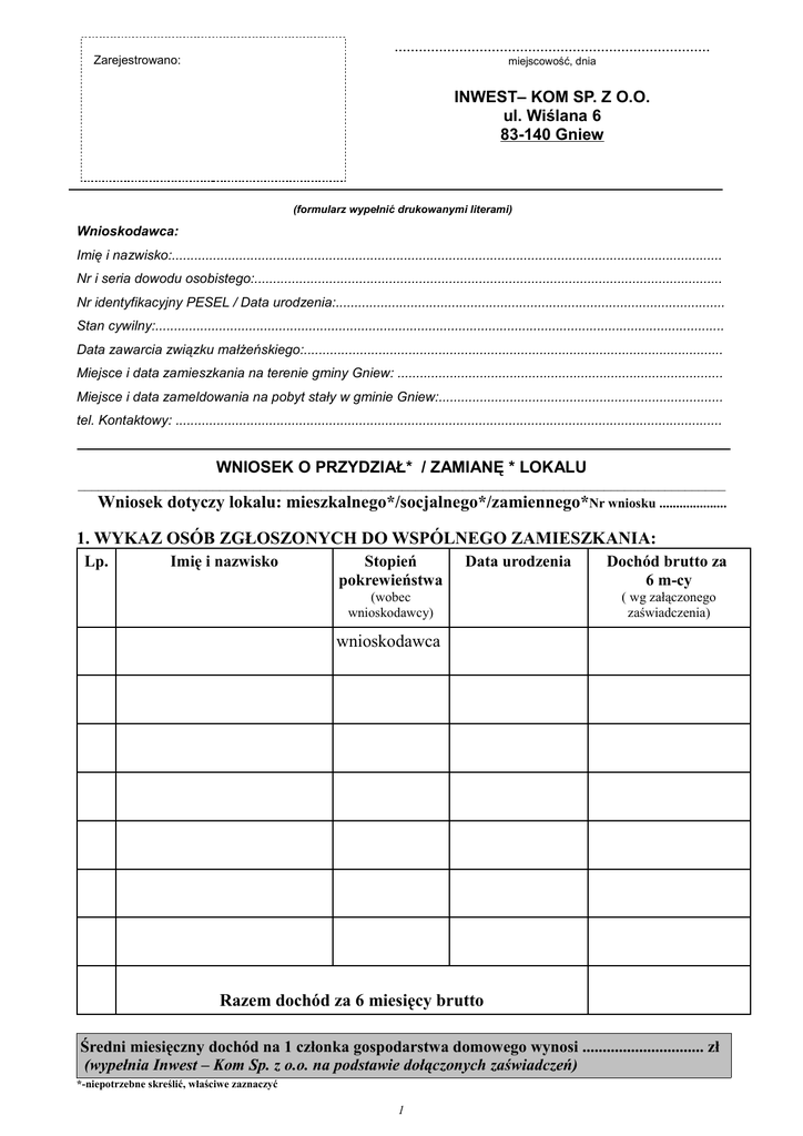 Wniosek dotyczy lokalu: mieszkalnego*/socjalnego - Inwest-Kom
