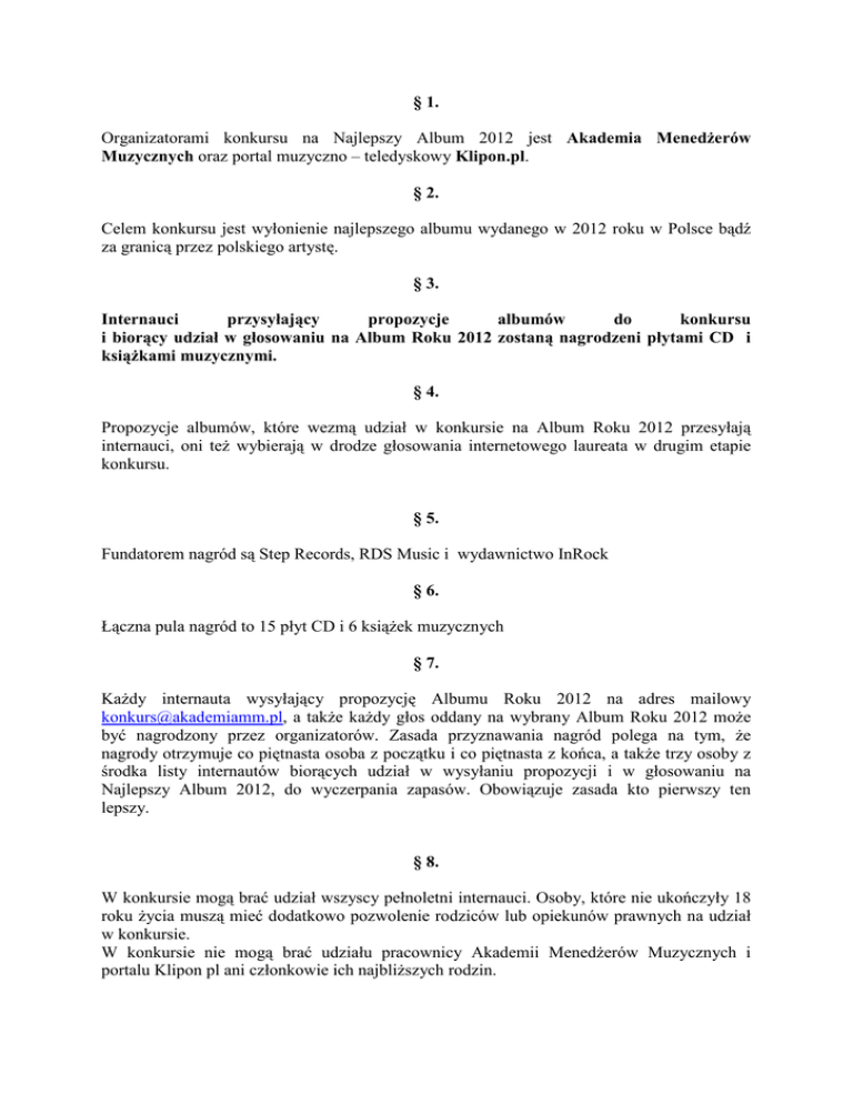 § 1. Organizatorami konkursu na Najlepszy Album 2012 jest Akademia MenedŜerów Muzycznych oraz portal muzyczno – teledyskowy Klipon.pl. § 2. Celem konkursu jest wyłonienie najlepszego albumu wydanego w 2012 roku w Polsce bądź za granicą przez polskiego artystę. § 3. Internauci przysyłający propozycje albumów do konkursu i biorący udział w głosowaniu na Album Roku 2012 zostaną nagrodzeni płytami CD i ksiąŜkami muzycznymi. § 4. Propozycje albumów, które wezmą udział w konkursie na Album Roku 2012 przesyłają internauci, oni teŜ wybierają w drodze głosowania internetowego laureata w drugim etapie konkursu. § 5. Fundatorem nagród są Step Records, RDS Music i wydawnictwo InRock § 6. Łączna pula nagród to 15 płyt CD i 6 ksiąŜek muzycznych § 7. KaŜdy internauta wysyłający propozycję Albumu Roku 2012 na adres mailowy [email protected], a takŜe kaŜdy głos oddany na wybrany Album Roku 2012 moŜe być nagrodzony przez organizatorów. Zasada przyznawania nagród polega na tym, Ŝe nagrody otrzymuje co piętnasta osoba z początku i co piętnasta z końca, a takŜe trzy osoby z środka listy internautów biorących udział w wysyłaniu propozycji i w głosowaniu na Najlepszy Album 2012, do wyczerpania zapasów. Obowiązuje zasada kto pierwszy ten lepszy. § 8. W konkursie mogą brać udział wszyscy pełnoletni internauci. Osoby, które nie ukończyły 18 roku Ŝycia muszą mieć dodatkowo pozwolenie rodziców lub opiekunów prawnych na udział w konkursie. W konkursie nie mogą brać udziału pracownicy Akademii MenedŜerów Muzycznych i portalu Klipon pl ani członkowie ich najbliŜszych rodzin. § 9. Osoba biorąca udział w konkursie poprzez wysłanie propozycji Albumu Roku 2012 lub poprzez oddanie głosu na wybrany album automatycznie zgadza się z warunkami niniejszego regulaminu. § 10. Wyłonienie najlepszego albumu 2012 nastąpi dwuetapowo. I etap – nadsyłanie propozycji albumów wydanych w 2012 roku przez internautów na adres mail: [email protected], II etap – głosowanie internetowe na stronie portalu Klipon.pl. § 11. Propozycje albumów do konkursu moŜna nadsyłać w terminie od 17.12.2012 do 31.12.2012, do godziny 23.59 na adres mail: [email protected]. NaleŜy podać pełną nazwę albumu i wykonawcy. Do II etapu konkursu przejdzie 10 albumów najczęściej proponowanych przez internautów. . § 12. Głosowanie internautów będące II etapem konkursowym, w wyniku którego zostanie wybrany najlepszy album 2012 zostanie uruchomione z dniem 07.01.2013 na stronie portalu Klipon.pl pod adresem www.klipon.pl i będzie trwać do 28.02.2013, do godziny 23.59. § 13. W głosowaniu mogą brać udział wszyscy internauci bez potrzeby rejestrowania się na portalu Klipon.pl. Aby oddać waŜny głos i wziąć udział w losowaniu nagród naleŜy kliknąć „zagłosuj” przy wybranym albumie ubiegającym się o miano Najlepszego Albumu 2012. Głosy oddawać moŜna z jednego komputera raz na 24 godziny. Podczas głosowania internauta będzie poproszony o podanie swojego adresu email i następnie zaakceptowania linku aktywującego głos, wysłanego na wskazany adres email. Z głosowania wyłączone są urządzenia uŜywające systemy: Android, Windows Mobile i Apple iOS (iPad, iPod, iPhone). Głosy oddane z tych urządzeń nie będą naliczane. Wszelkie próby manipulowania wynikami głosowania niezgodne z niniejszym regulaminem spowodują dyskwalifikację internauty z konkursu, a głosy oddane w sposób nieregulaminowy usunięte. W skrajnych przypadkach moŜliwa jest dyskwalifikacja albumu biorącego udział w głosowaniu, jeśli zaistnieje podejrzenie manipulacji osób związanych z danym wykonawcą. Organizatorzy konkursu nie ponoszą odpowiedzialności za próby manipulacji w głosowaniu, ani za błędy wynikające z działalności osób trzecich. § 14. Zakończenie konkursu i jego wyniki, przewidziane są na 01.03.2013 r. i zostaną ogłoszone na stronie głównej portalu Klipon.pl oraz na stronie Akademii MenedŜerów Muzycznych. § 15. Zwycięski album zostanie nagrodzony specjalnie przygotowaną na ten cel statuetką, wręczoną osobiście przez przedstawicieli Akademia MenedŜerów Muzycznych i portalu Klipon.pl. Album będzie promowany przez portal Klipon.pl i Akademię MenedŜerów Muzycznych, a z jego wykonawcą zostanie przeprowadzony specjalny wywiad opublikowany na stronach obydwu portali i w zaprzyjaźnionych mediach. § 16. Nagrodzeni internauci, przesyłający propozycje na Album Roku 2012 i/lub biorący udział w głosowaniu, o wygranej zostanie powiadomiony mailowo na adres podany podczas wysyłania propozycji albumów do konkursu, bądź w czasie głosowania na portalu Klipon.pl. Zwycięzca jest zobowiązany do kontaktu mailowego lub telefonicznego z portalem Akademia MenedŜerów Muzycznych bądź portalem Klipon.pl w celu ustalenia przekazania nagrody. Nagrody zostaną wysłane Pocztą Polską na wskazany adres pocztowy. § 17. W razie braku kontaktu w okresie 15 dni z nagrodzonymi internautami, organizatorzy zastrzegają sobie prawo do przyznania jego nagrody kolejnemu uŜytkownikowi z listy internautów biorących udział w wysyłaniu propozycji i biorących udział w głosowaniu na Album Roku 2012. § 18. Uczestnikom konkursu przysługuje prawo do wycofania się z niniejszego konkursu za pisemną prośbą wysłaną na adres [email protected], z adresu mailowego podanego podczas wysyłania propozycji lub podczas głosowania na Album Roku 2012. § 19. Dane osobowe uczestników konkursu będą przetwarzanie przez Organizatorów w celu: realizacji konkursu, wyłonienia nagrodzonych i zwycięzcy, realizacji nagród, (iv) zebrania opinii od uczestników o przeprowadzonym konkursie, (v) wysyłania mailowych informacji dotyczących konkursu. Organizatorzy zapewniają ochronę danych osobowych zgodnie z ustawą z dnia 29 sierpnia 1997 r. o ochronie danych osobowych. § 20. WyraŜenie zgody na przetwarzanie danych osobowych prze