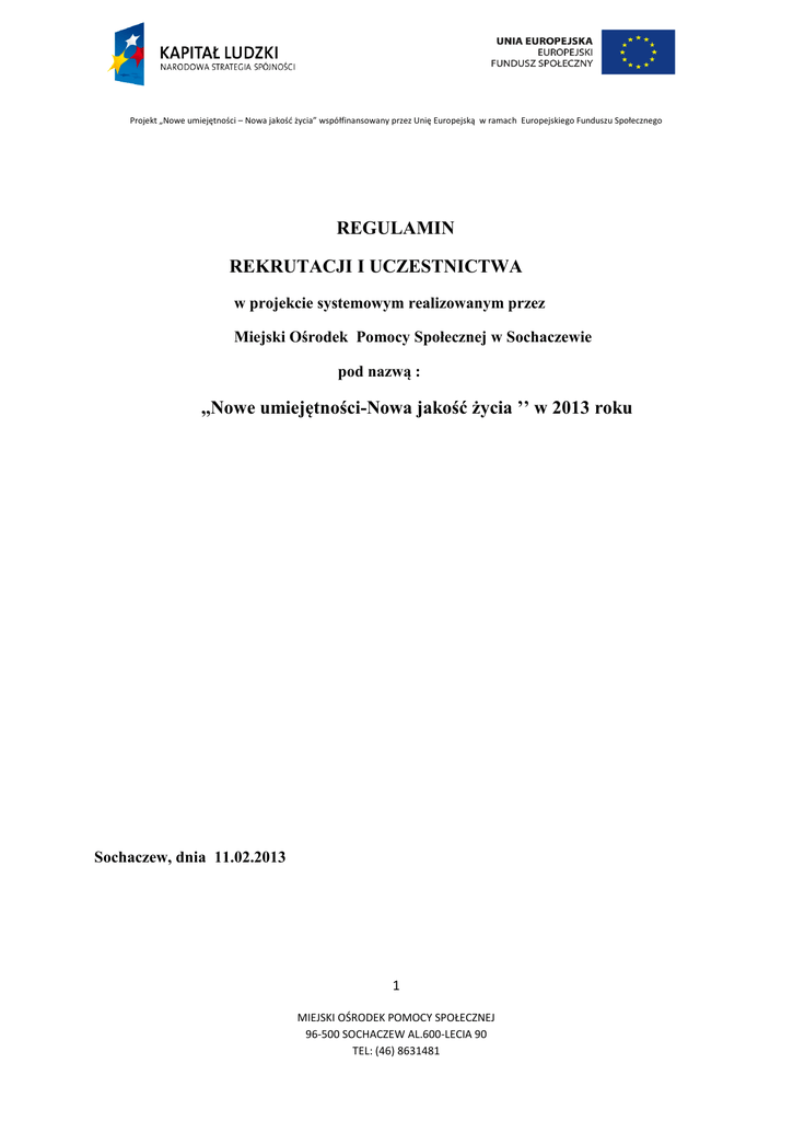 Projekt „Nowe umiejętności – Nowa jakość życia” współfinansowany przez Unię Europejską w ramach Europejskiego Funduszu Społecznego REGULAMIN REKRUTACJI I UCZESTNICTWA w projekcie systemowym realizowanym przez Miejski Ośrodek Pomocy Społecznej w Sochaczewie pod nazwą : ,,Nowe umiejętności-Nowa jakość życia ’’ w 2013 roku Sochaczew, dnia 11.02.2013 1 MIEJSKI OŚRODEK POMOCY SPOŁECZNEJ 96-500 SOCHACZEW AL.600-LECIA 90 TEL: (46) 8631481 Projekt „Nowe umiejętności – Nowa jakość życia” współfinansowany przez Unię Europejską w ramach Europejskiego Funduszu Społecznego Projekt realizowany w roku 2013 stanowi szóstą edycję realizacji projektu w ramach Programu Operacyjnego Kapitał Ludzki, Priorytet VII- Promocja integracji społecznej, Działanie 7.1 – Rozwój i upowszechnianie aktywnej integracji, Poddziałanie 7.1.1.- Rozwój i upowszechnianie aktywnej integracji przez ośrodki pomocy społecznej współfinansowany ze środków Unii Europejskiej w ramach Europejskiego Funduszu Społecznego. §1. INFORMACJE OGÓLNE 1. Niniejszy regulamin określa zasady rekrutacji kandydatów/kandydatek do udziału w projekcie, zasady uczestnictwa w projekcie oraz prawa i obowiązki Beneficjentów Ostatecznych Projektu. 2. Projekt systemowy pod nazwą ,,Nowe umiejętności-Nowa jakość życia’’ realizowany jest przez Miejski Ośrodek Pomocy Społecznej w Sochaczewie z siedzibą przy ulicy Aleja 600lecia 90,96-500 Sochaczew. 3. Biuro projektu znajduje się w budynku Miejskiego Ośrodka Pomocy Społecznej w Sochaczewie przy ulicy Aleja 600-lecia 90,96-500 Sochaczew, Pokój 210 tel: 046 86314 81 wew.15 4. Projekt jest współfinansowany przez Unię Europejską w ramach Europejskiego Funduszu Społecznego. 5.Projekt jest realizowany na podstawie umowy zawartej pomiędzy Gminą Miasto Sochaczew w imieniu, której występuje Miejski Ośrodek Pomocy Społecznej w Sochaczewie, a Mazowiecką Jednostką Wdrażania Programów Unijnych w Warszawie.(Instytucją Pośredniczącą II stopnia) 6. Celem głównym projektu realizowanego w dwóch kolejnych edycjach jest Rozwój aktywnej integracji wśród osób zagrożonych wykluczeniem społecznym z terenu miasta Sochaczew i upowszechnianie pracy socjalnej w okresie od 01.01.2012 do 30.06.2014 W roku 2013 projekt jest skierowany do 21 osób( 13 K i 8 M) 2 MIEJSKI OŚRODEK POMOCY SPOŁECZNEJ 96-500 SOCHACZEW AL.600-LECIA 90 TEL: (46) 8631481 Projekt „Nowe umiejętności – Nowa jakość życia” współfinansowany przez Unię Europejską w ramach Europejskiego Funduszu Społecznego 7. Użyte w regulaminie określenia oznaczają: a) Projekt- Projekt systemowy w ramach Programu Operacyjnego Kapitał Ludzki 20072013, Priorytet VII Promocja integracji społecznej, Działanie 7.1 Rozwój i upowszechnianie aktywnej integracji, Poddziałanie 7.1.1 Rozwój i upowszechnianie aktywnej integracji przez ośrodki pomocy społecznej. pt. „Nowe umiejętności-Nowa jakość życia ” b) EFS- Europejski Fundusz Społeczny c) UE- Unia Europejska d) Beneficjent- Gmina Miasto Sochaczew / Miejski Ośrodek Pomocy Społecznej w Sochaczewie e) Kandydat – osoba ubiegająca się o zakwalifikowanie do udziału w projekcie. f) Beneficjent Ostateczny Projektu/ Uczestnik/Uczestniczka Projektu – uczestnik /uczestniczka projektu. g) Zespół rekrutacyjny- w składzie: Z-ca dyrektora MOPS, reprezentanci pracowników socjalnych, psycholog Zadaniem zespołu jest wybór kandydatów spełniających wszystkie wymogi kwalifikacyjne do udziału w projekcie, z posiedzenia Zespołu sporządzany jest protokół. h) Deklaracja Uczestnictwa w projekcie- dokument stanowiący wyrażenie zgody na udział w projekcie. i) Instrumenty aktywnej integracji( narzędzia aktywizacji zawodowej, społecznej, edukacyjnej, zdrowotnej) – są to formy wsparcia o charakterze aktywizacyjnym mające na celu przywrócenie możliwości lub zdolności do zatrudnienia oraz integracji społecznej osób korzystających ze świadczeń pomocy społecznej. 3 MIEJSKI OŚRODEK POMOCY SPOŁECZNEJ 96-500 SOCHACZEW AL.600-LECIA 90 TEL: (46) 8631481 Projekt „Nowe umiejętności – Nowa jakość życia” współfinansowany przez Unię Europejską w ramach Europejskiego Funduszu Społecznego §2. INFORMACJE O PROJEKCIE 1.Projekt w roku 2013 zakłada objęcie wsparciem aktywizacyjno-integracyjnym 21 Beneficjentów Ostatecznych / Uczestników Projektu przy pomocy kontraktu socjalnego. Kontrakt socjalny zawarty zostanie z Uczestnikami/Uczestniczkami Projektu przez pracownika socjalnego , których stanowić będą osoby bezrobotne, nieaktywne zawodowo, niepełnosprawne będące w wieku aktywności zawodowej zagrożone wykluczeniem społecznym i korzystające ze świadczeń pomocy społecznej Kontrakt socjalny dotyczy 21 osób ,( w tym 13 Kobiet ,8 Mężczyzn ) które stanowić będą osoby bezrobotne (10 kobiet, 7 mężczyzn) nieaktywne zawodowo (3 kobiety, 1 mężczyzna) niepełnosprawne będące w wieku aktywności zawodowej zagrożone wykluczeniem społecznym i korzystające ze świadczeń pomocy społecznej, z którymi pracownik socjalny zawrze kontrakty socjalne. 2.Realizację działań zawartych w kontrakcie dla uczestników/uczestniczek projektu 2013 planuje się do grudnia 2013 roku 3. Udział Uczestników/Uczestniczek w projekcie jest bezpłatny. 4. Udział Uczestników/Uczestniczek w projekcie jest dobrowolny. 5. Każdy z uczestników projektu zostanie objęty co najmniej trzema instrumentami aktywnej integracji ,które będą indywidualnie dobierane do potrzeb uczestników projektu. Zakres wsparcia dla Uczestników/Uczestniczek w projekcie w ramach kontraktu obejmuje a) INSTRUMENTY AKTYWIZACJI ZDROWOTNEJ Celem zastosowanych instrumentów będzie poprawa w zakresie osobistego rozwoju, pomoc w rozwiązywaniu własnych sprawa życiowych, poprawa kondycji psycho- fizycznej(m. innymi poradnictwo psychologiczne, terapia psychospołeczna, terapia rodzinna) 4 MIEJSKI OŚRODEK POMOCY SPOŁECZ
