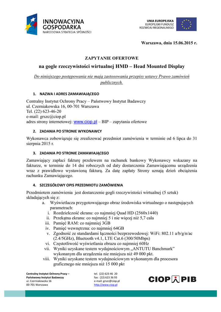 Warszawa, dnia 15.06.2015 r. ZAPYTANIE OFERTOWE na gogle rzeczywistości wirtualnej HMD – Head Mounted Display Do niniejszego postępowania nie mają zastosowania przepisy ustawy Prawo zamówień publicznych. 1. NAZWA I ADRES ZAMAWIAJĄCEGO Centralny Instytut Ochrony Pracy – Państwowy Instytut Badawczy ul. Czerniakowska 16, 00-701 Warszawa Tel. (22) 623-46-20 e-mail: [email protected] adres strony internetowej: www.ciop.pl – BIP – zapytania ofertowe 2. ZADANIA PO STRONIE WYKONAWCY Wykonawca zobowiązuje się zrealizować przedmiot zamówienia w terminie od 6 lipca do 31 sierpnia 2015 r. 3. ZADANIA PO STRONIE ZAMAWIAJĄCEGO Zamawiający zapłaci fakturę przelewem na rachunek bankowy Wykonawcy wskazany na fakturze, w terminie do 14 dni roboczych od daty dostarczenia Zamawiającemu urządzenia wraz z prawidłowo wystawioną fakturą. Za datę zapłaty Strony uznają dzień obciążenia rachunku Zamawiającego. 4. SZCZEGÓŁOWY OPIS PRZEDMIOTU ZAMÓWIENIA Przedmiotem zamówienia jest dostarczenie gogli rzeczywistości wirtualnej (5 sztuk) składających się z: a. Wyświetlacza przygotowującego obraz środowiska wirtualnego o następujących parametrach: i. Rozdzielczość ekranu: co najmniej Quad HD (2560x1440) ii. Przekątna ekranu: co najmniej 5 i nie więcej niż 5,7 cala iii. Pamięć RAM: co najmniej 3GB iv. Pamięć wewnętrzna: co najmniej 64GB v. Zgodność ze standardami łączności bezprzewodowej: WiFi: 802.11 a/b/g/n/ac (2.4/5GHz), Bluetooth v4.1, LTE Cat.6 (300/50Mbps) vi. Częstotliwość wyświetlania obrazu co najmniej 60Hz vii. Wyniki uzyskane testem wydajnościowym „ANTUTU Banchmark” wykonanym dla urządzenia nie mniejsza niż 49 000 pkt. viii. Wyniki uzyskane testem wydajnościowym wykonanym dla procesora graficznego nie mniejsza niż 15 000 pkt Centralny Instytut Ochrony Pracy – Państwowy Instytut Badawczy ul. Czerniakowska 16 00-701 Warszawa tel. (22) 623 46 20 fax: (22) 623 36 93 e-mail: [email protected] http://www.ciop.pl ix. Złącze USB b. Obudowy zakładanej na głowę, wyposażonej w: i. Układ optyczny pozwalający na uzyskanie pola widzenie (FoV) 90 stopni lub więcej ii. Sensory umożliwiające wyznaczenie bezwzględnej orientacji w trójwymiarowej przestrzeni (co najmniej: akcelerometr, żyroskop i magnetometr elektroniczny) Podane powyżej parametry i cechy przedmiotu zamówienia są parametrami minimalnymi. Wykonawcy mogą zaproponować przedmiot o wyższych parametrach technicznych, lecz nie gorszych od wymaganych przez Zamawiającego. Warunki dodatkowe a) W cenie zawarte będą wszystkie koszty dostawy do budynku laboratoryjnego pod nazwą „Centrum Badań i Rozwoju Technik Bezpieczeństwa Procesów Pracy i Środowiska (TECH-SAFE-BIO)” CIOP-PIB przy ul. Czerniakowskiej 16 w Warszawie, oraz udzielenia gwarancji na okres minimum 24 miesiące. b) Wymagana deklaracja zgodności CE. 5. TERMIN I MIEJSCE WYKONANIA ZAMÓWIENIA Zamawiający wymaga, aby przedmiot zamówienia został dostarczony do budynku laboratoryjnego pod nazwą „Centrum Badań i Rozwoju Technik Bezpieczeństwa Procesów Pracy i Środowiska (TECH-SAFE-BIO)” CIOP-PIB przy ul. Czerniakowskiej 16 w Warszawie w terminie od 6 lipca do 31 sierpnia 2015 r. 6. WALUTA, W JAKIEJ BĘDĄ PROWADZONE ROZLICZENIA ZWIĄZANE Z REALIZACJĄ NINIEJSZEGO ZAMÓWIENIA Wszystkie rozliczenia związane z realizacją zamówienia dokonywane będą w PLN. 7. OPIS SPOSOBU PRZYGOTOWANIA OFERTY ORAZ MIEJSCE, SPOSÓB I TERMIN JEJ ZŁOŻENIA Oferta powinna zostać przesłana za pomocą poczty elektronicznej na adres mailowy [email protected] lub w formie pisemnej (pocztą) na adres Zamawiającego kancelaria piętro III pok. 335 z informacją „OFERTA NA GOGLE RZECZYWISTOŚCI WIRTUALNEJ HMD” do dnia 19.06.2015 do godziny 14:00,. Wykonawca ponosi wszelkie koszty związane z przygotowaniem i złożeniem oferty. Wszystkie oferty otrzymane po określonym terminie nie będą rozpatrywane. Zamawiający niezwłocznie zawrze umowę z wybranym wykonawcą po wyborze najkorzystniejszej oferty. 8. KRYTERIA OCENY OFERT I WYBORU WYKONAWCY Przy wyborze najkorzystniejszej oferty Zamawiający będzie się kierował kryterium ceny brutto za realizację przedmiotu zamówienia obliczonej przez Wykonawcę. Centralny Instytut Ochrony Pracy – Państwowy Instytut Badawczy ul. Czerniakowska 16 00-701 Warszawa tel. (22) 623 46 20 fax: (22) 623 36 93 e-mail: [email protected] http://www.ciop.pl lp. Kryterium zasadnicze Opis Waga – udział w ocenie 1 Cena Cena oferty (z podatkiem VAT) za realizację przedmiotu zamówienia, na którą powinny składać się wszelkie koszty ponoszone przez Wykonawcę 100 9. SPOSÓB OBLICZENIA OFERTY Zamawiający za najkorzystniejszą uzna ofertę, która uzyska największą liczbę punktów przyznanych w ramach ustalonego kryterium. Maksymalna liczba punktów w ramach kryterium równa jest określonej wadze kryterium w %. Uzyskana liczba punktów w ramach kryterium zaokrąglana będzie do drugiego miejsca po przecinku. Przyznane liczby punktów poszczególnym ofertom odbywać się będzie według następującej zasady: Liczba punktów = Cena brutto najniższej zaproponowanej oferty Cena brutto oferty badanej X 100 10. UWAGI KOŃCOWE Niniejsze ogłoszenie nie jest ogłoszeniem w rozumieniu ustawy Prawo zamówień publicznych, a propozycje składane przez zainteresowane podmioty nie są ofertami w rozumieniu Kodeksu cywilnego. Niniejsze zapytanie ofertowe nie stanowi zobowiązania Zamawiającego do zawarcia umowy. Zamawiający może odstąpić od podpisania umowy bez podania uzasadnienia swojej decyzji. 11. POSTANOWIENIA KOŃCOWE Do zapytania ofertowego dołączono: Załącznik nr 1 – Formularz cenowy Załącznik nr 2 – Wzór umowy Centralny Instytut Ochrony Pracy – Państwowy Instytut Badawczy ul. Czerniakowska 16 00-701 Warszawa tel. (22) 623 46 20 fax: (22) 623 36 93 e-mail: [email protected] http://www.ciop.pl