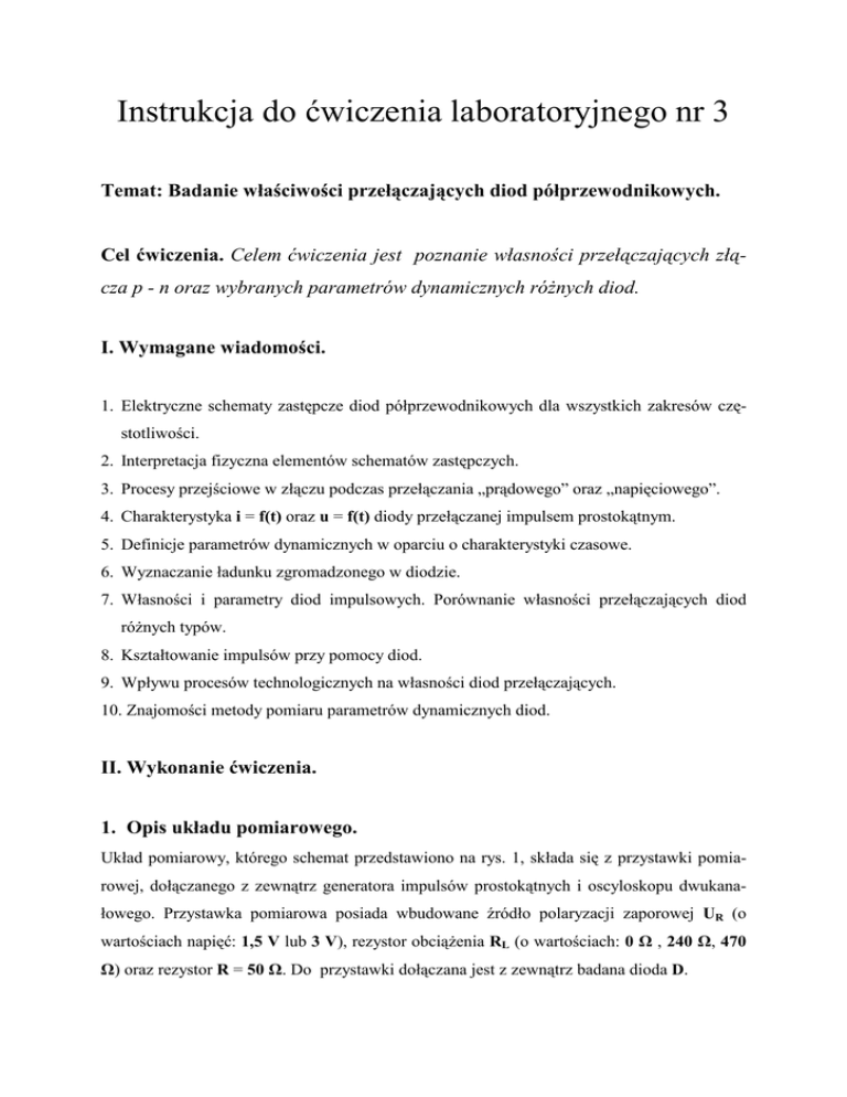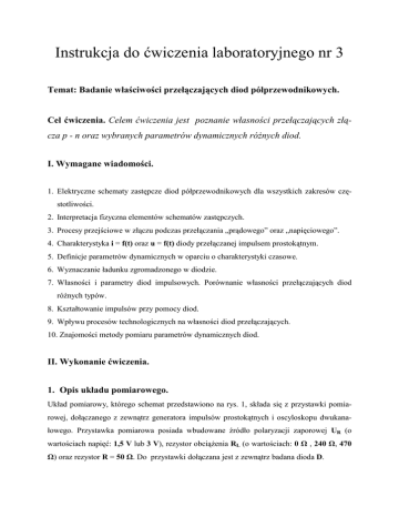 Instrukcja do ćwiczenia laboratoryjnego nr 3 Temat: Badanie właściwości przełączających diod półprzewodnikowych. Cel ćwiczenia. Celem ćwiczenia jest poznanie własności przełączających złącza p - n oraz wybranych parametrów dynamicznych róŜnych diod. I. Wymagane wiadomości. 1. Elektryczne schematy zastępcze diod półprzewodnikowych dla wszystkich zakresów częstotliwości. 2. Interpretacja fizyczna elementów schematów zastępczych. 3. Procesy przejściowe w złączu podczas przełączania „prądowego” oraz „napięciowego”. 4. Charakterystyka i = f(t) oraz u = f(t) diody przełączanej impulsem prostokątnym. 5. Definicje parametrów dynamicznych w oparciu o charakterystyki czasowe. 6. Wyznaczanie ładunku zgromadzonego w diodzie. 7. Własności i parametry diod impulsowych. Porównanie własności przełączających diod róŜnych typów. 8. Kształtowanie impulsów przy pomocy diod. 9. Wpływu procesów technologicznych na własności diod przełączających. 10. Znajomości metody pomiaru parametrów dynamicznych diod. II. Wykonanie ćwiczenia. 1. Opis układu pomiarowego. Układ pomiarowy, którego schemat przedstawiono na rys. 1, składa się z przystawki pomiarowej, dołączanego z zewnątrz generatora impulsów prostokątnych i oscyloskopu dwukanałowego. Przystawka pomiarowa posiada wbudowane źródło polaryzacji zaporowej UR (o wartościach napięć: 1,5 V lub 3 V), rezystor obciąŜenia RL (o wartościach: 0 Ω , 240 Ω, 470 Ω) oraz rezystor R = 50 Ω. Do przystawki dołączana jest z zewnątrz badana dioda D. RL CH1 u = f(t) D UR Gen. CH2 i = f(t) R = 50 Ω Rys. 1. Schemat układu do badania własności przełączających diody. Badana dioda polaryzowana jest w kierunku zaporowym napięciem UR o znanej wartości (1,5 V lub 3 V). Impuls prostokątny dodatni, o amplitudzie większej od wartości UR, wprowadza diodę w stan przewodzenia. Przebiegi czasowe u = f(t), obserwowane po dołączeniu kanału pierwszego oscyloskopu CH1, obrazują kształt spadku napięcia na diodzie z szeregowo połączonym rezystorem R. Wartość prądu płynącego przez diodę polaryzowaną w kierunku przewodzenia określa się na podstawie przebiegu i = f(t), obserwowanego na ekranie oscyloskopu (uzyskanego po dołączeniu kanału drugiego CH2 oscyloskopu). W układzie dokonuje się pomiarów czasów przełączania oraz wartości ładunku zgromadzonego w bazie diody podczas przepływu prądu w kierunku przewodzenia. 2. Pomiar czasów magazynowania ts, opadania tf oraz ładunku Qs zgromadzonego w bazie diody. W układzie połączonym według schematu przedstawionego na rys. 1 dokonuje się pomiarów czasów: magazynowania ts, opadania tf oraz czasu wyłączania trr. Na podstawie przybliŜonego odczytu powierzchni S pomiędzy osią czasową i krzywą przebiegu prądowego i = f(t), w zakresie polaryzacji ujemnej, oblicza się ładunek zgromadzony w 2 bazie diody. Parametry te badane są w funkcji prądu przewodzenia IF, przy ustalonych wartościach napięcia UR = 1,5 V oraz UR = 3 V. Pomiary przeprowadza się dla diod wykonanych róŜnymi technologiami (prostowniczej Ge oraz Si, ostrzowej, impulsowej). Przed przystąpieniem do pomiarów naleŜy wykonać niŜej podane czynności. 1. Dołączyć do przystawki pomiarowej generator impulsów prostokątnych. 2. Ustawić częstotliwość generatora f = 50 kHz, poziom sygnału na zero, wypełnienie impulsu w granicach 25 - 30 %. 3. Dołączyć odpowiednio do przystawki kanały oscyloskopu CH1 [zobrazowanie przebiegu u = f(t)] oraz CH2 [zobrazowanie przebiegu i = f(t)]. 4. Włączyć generator i oscyloskop. Dokonać wstępnych ustawień oscyloskopu korzystając z uproszczonej instrukcji obsługi. Ustawić podstawę czasu Ct = 1 µs/cm. Przyjąć czułość napięciową Cu1 kanału pierwszego CH1 równą 1 V/cm, czułość napięciową Cu2 kanału drugiego równą 50 mV/cm. Uwaga. Takie ustawienie czułości kanału CH2, przy dołączonym do tego kanału rezystorze R = 50 Ω daje czułość prądową Ci = 1 mA/cm. 5. Ustawić przełączniki Regulacja RL w pozycji RL = 0 dla zakresu UR = 1,5 V . 6. Umieścić badaną diodę D w przystawce pomiarowej zachowując polaryzację w kierunku zaporowym w odniesieniu do napięcia UR. Pomiary czasów magazynowania ts, opadania tf oraz ładunku Qs przeprowadza się dla diod róŜnych typów, w niŜej określonych warunkach. 1. Przy wybranym napięciu polaryzacji zaporowej UR = 1,5 V oraz RL = 0 Ω zwiększać amplitudę sygnału z generatora do uzyskania wartości prądu przewodzenia diody IF = 0,5 mA (wartość ustalona na przebiegu i = f(t) powyŜej osi czasowej - kanał drugi oscyloskopu CH2). 2. Z przebiegu i = f(t) odczytać wartości czasów ts oraz tf. Odczytać przybliŜoną wartość powierzchni S [cm2] obszaru ograniczonego osią czasową oraz krzywą i = f(t), w zakresie polaryzacji zaporowej. Wyniki pomiarów umieścić w tabeli (według wzoru Tabela 1). 3. Zwiększyć amplitudę sygnału z generatora w celu uzyskania wartości prądu przewodzenia diody IF = 1 mA. Powtórzyć czynności opisane w p.2. 4. Ustawiając kolejne wartości prądu IF (co 0,5 mA w zakresie do 6 mA) dokonywać odczytów czasów ts i tf oraz powierzchni S [cm2]. Wyniki pomiarów umieszczać w tabeli (według wzoru Tabela 1). 3 5. Przy wybranym napięciu polaryzacji zaporowej UR = 1,5 V, wykonać pomiary przy obciąŜeniu RL, o wartościach wskazanych przez prowadzącego, powtarzając czynności podane w p.(1-4). Wyniki pomiarów umieścić w tabelach analogicznych, według wzoru Tabela 1. Przeprowadzić analogiczne pomiary, w zakresie wskazanym przez prowadzącego, przy wartości napięcia polaryzacji zaporowej UR = 3 V, dla odpowiednich wartości rezystancji obciąŜenia RL. Wykonać pomiary dla diod róŜnych typów. Uwaga ! Po ukończeniu pomiarów wyjąć badana diodę z przystawki pomiarowej. III. Opracowanie wyników. 1. Obliczyć ładunek Qs, zgromadzony w bazie diody podczas polaryzacji w kierunku 