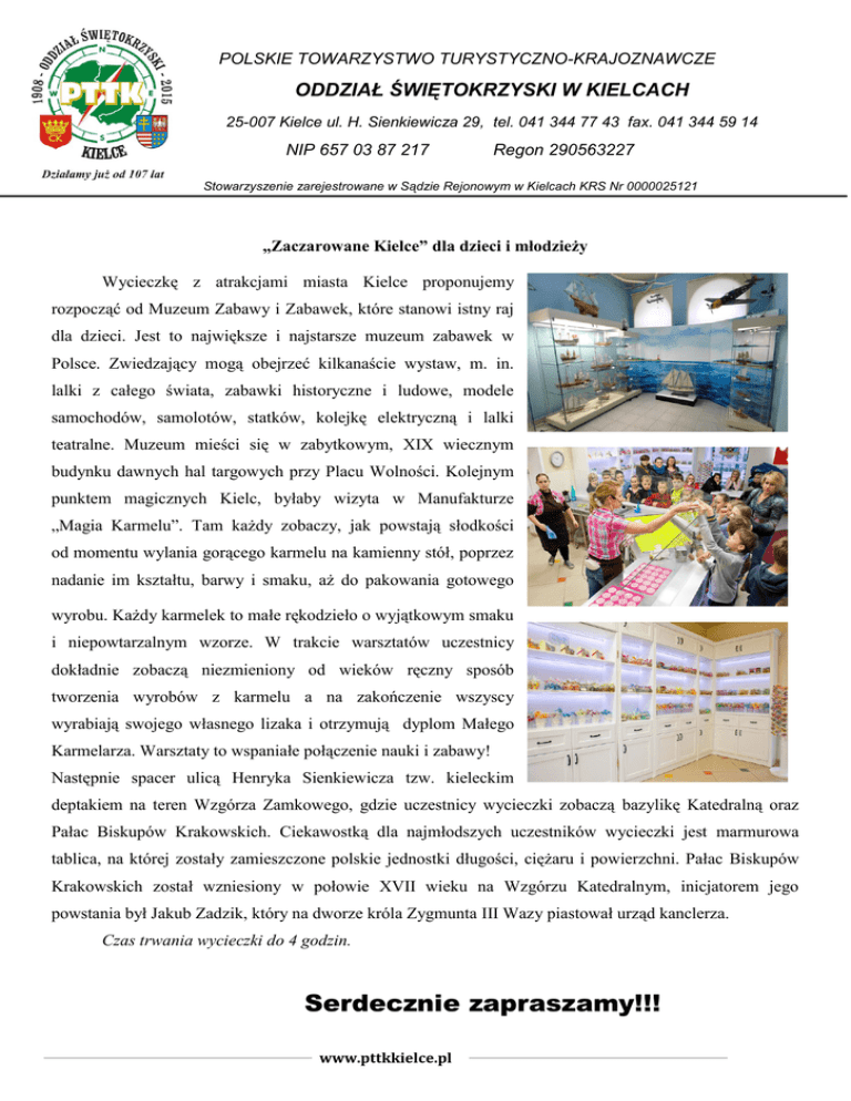 POLSKIE TOWARZYSTWO TURYSTYCZNO-KRAJOZNAWCZE ODDZIAŁ ŚWIĘTOKRZYSKI W KIELCACH 25-007 Kielce ul. H. Sienkiewicza 29, tel. 041 344 77 43 fax. 041 344 59 14 NIP 657 03 87 217 Regon 290563227 Stowarzyszenie zarejestrowane w Sądzie Rejonowym w Kielcach KRS Nr 0000025121 „Zaczarowane Kielce” dla dzieci i młodzieży Wycieczkę z atrakcjami miasta Kielce proponujemy rozpocząć od Muzeum Zabawy i Zabawek, które stanowi istny raj dla dzieci. Jest to największe i najstarsze muzeum zabawek w Polsce. Zwiedzający mogą obejrzeć kilkanaście wystaw, m. in. lalki z całego świata, zabawki historyczne i ludowe, modele samochodów, samolotów, statków, kolejkę elektryczną i lalki teatralne. Muzeum mieści się w zabytkowym, XIX wiecznym budynku dawnych hal targowych przy Placu Wolności. Kolejnym punktem magicznych Kielc, byłaby wizyta w Manufakturze „Magia Karmelu”. Tam każdy zobaczy, jak powstają słodkości od momentu wylania gorącego karmelu na kamienny stół, poprzez nadanie im kształtu, barwy i smaku, aż do pakowania gotowego wyrobu. Każdy karmelek to małe rękodzieło o wyjątkowym smaku i niepowtarzalnym wzorze. W trakcie warsztatów uczestnicy dokładnie zobaczą niezmieniony od wieków ręczny sposób tworzenia wyrobów z karmelu a na zakończenie wszyscy wyrabiają swojego własnego lizaka i otrzymują dyplom Małego Karmelarza. Warsztaty to wspaniałe połączenie nauki i zabawy! Następnie spacer ulicą Henryka Sienkiewicza tzw. kieleckim deptakiem na teren Wzgórza Zamkowego, gdzie uczestnicy wycieczki zobaczą bazylikę Katedralną oraz Pałac Biskupów Krakowskich. Ciekawostką dla najmłodszych uczestników wycieczki jest marmurowa tablica, na której zostały zamieszczone polskie jednostki długości, ciężaru i powierzchni. Pałac Biskupów Krakowskich został wzniesiony w połowie XVII wieku na Wzgórzu Katedralnym, inicjatorem jego powstania był Jakub Zadzik, który na dworze króla Zygmunta III Wazy piastował urząd kanclerza. Czas trwania wycieczki do 4 godzin. Serdecznie zapraszamy!!! www.pttkkielce.pl