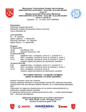 Mistrzostwa Tatrzańskiego Związku Narciarskiego NARCIARSTWO ALPEJSKIE – SLALOM i SLALOM GIGANT Junior B Międzywojewódzki Mistrzostwa Młodzików NARCIARSTWO ALPEJSKIE – SLALOM i SLALOM GIGANT Junior C (strefa A) Zakopane 13 - 14 marca 2013 HARENDA Organizator: Tatrzański Związek Narciarski, Małopolski Związek Stowarzyszeń Kultury Fizycznej Tauron Bachleda Ski Jury zawodów: DT - W. Szamota Sędzia rozjemca - J. Malczewski Kierownik Zawodów - W. Gajewski Sędzia Główny – A. Stachowski Program: 12 marca 2013 19:00 weryfikacja, TZN 20:00 odprawa techniczna, TZN 13 marca 2013 SL 8:00 oglądanie trasy 1 przejazdu: junior B i C, juniorka B i C 9:00 start 1 przejazdu: juniorka B, junior B, juniorka C, junior C 12:15 start 2 przejazdu: juniorka B, junior B, juniorka C, junior C rozdanie nagród pół godziny po zakończeniu zawodów 14 marca 2013 GS 8:00 oglądanie trasy 1 przejazdu: junior B i C, juniorka B i C 9:00 start 1 przejazdu: juniorka B, junior B, juniorka C, junior C 12:15 start 2 przejazdu: juniorka B, junior B rozdanie nagród pół godziny po zakończeniu zawodów 70 zł opłata startowa + przejazdy wyciągiem płatne na odprawie ( za dzień zawodów) Program minutowy może ulec zmianom Wszyscy zgłoszeni zawodnicy muszą posiadać licencję PZN, opłacone pol-punkty, ubezpieczenie NW oraz aktualne badania lekarskie, za co odpowiadają zgłaszające klub. Organizator nie zapewnia ubezpieczenia ani nie ponosi odpowiedzialności za ewentualne wypadki podczas zawodów. W odprawach technicznych uczestniczą kierownicy ekip – 1 osoba reprezentująca klub – obecność obowiązkowa. Zgłoszenia przyjmowane są na adres organizatora fax: 18/20-125-88, e-mail: [email protected] do dnia 12 marca do godz. 12.00