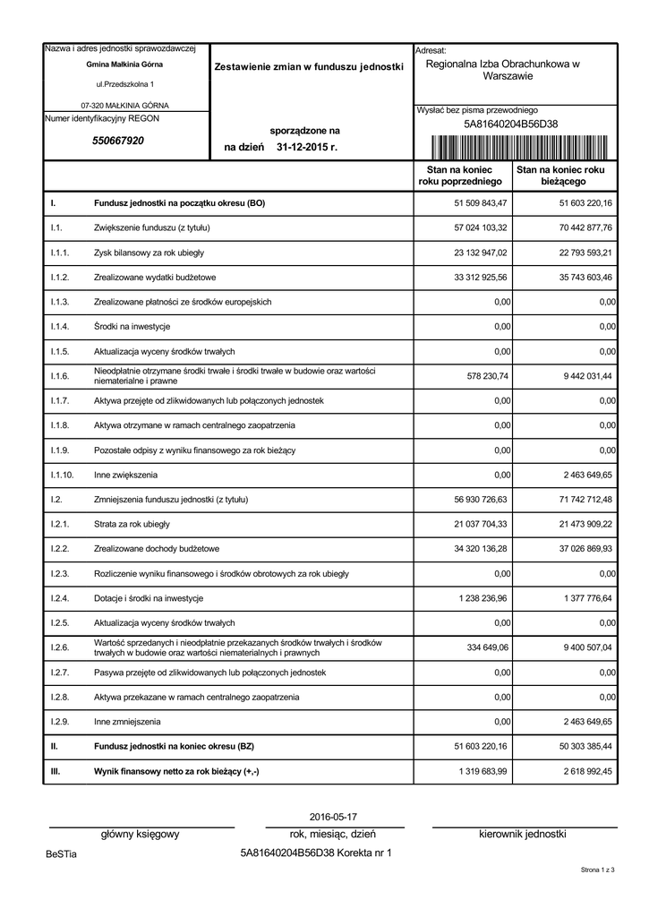 Nazwa i adres jednostki sprawozdawczej Gmina Małkinia Górna ul.Przedszkolna 1 Zestawienie zmian w funduszu jednostki 07-320 MAŁKINIA GÓRNA Numer identyfikacyjny REGON 550667920 na dzień sporządzone na 31-12-2015 r. Adresat: Regionalna Izba Obrachunkowa w Warszawie Wysłać bez pisma przewodniego 5A81640204B56D38 Stan na koniec roku poprzedniego Stan na koniec roku bieżącego I. Fundusz jednostki na początku okresu (BO) 51 509 843,47 51 603 220,16 I.1. Zwiększenie funduszu (z tytułu) 57 024 103,32 70 442 877,76 I.1.1. Zysk bilansowy za rok ubiegły 23 132 947,02 22 793 593,21 I.1.2. Zrealizowane wydatki budżetowe 33 312 925,56 35 743 603,46 I.1.3. Zrealizowane płatności ze środków europejskich 0,00 0,00 I.1.4. Środki na inwestycje 0,00 0,00 I.1.5. Aktualizacja wyceny środków trwałych 0,00 0,00 I.1.6. I.1.7. Nieodpłatnie otrzymane środki trwałe i środki trwałe w budowie oraz wartości niematerialne i prawne 578 230,74 9 442 031,44 Aktywa przejęte od zlikwidowanych lub połączonych jednostek 0,00 0,00 I.1.8. Aktywa otrzymane w ramach centralnego zaopatrzenia 0,00 0,00 I.1.9. Pozostałe odpisy z wyniku finansowego za rok bieżący 0,00 0,00 I.1.10. Inne zwiększenia 0,00 I.2. Zmniejszenia funduszu jednostki (z tytułu) 56 930 726,63 71 742 712,48 I.2.1. Strata za rok ubiegły 21 037 704,33 21 473 909,22 I.2.2. Zrealizowane dochody budżetowe 34 320 136,28 37 026 869,93 I.2.3. Rozliczenie wyniku finansowego i środków obrotowych za rok ubiegły I.2.4. Dotacje i środki na inwestycje I.2.5. Aktualizacja wyceny środków trwałych I.2.6. I.2.7. 0,00 1 238 236,96 Wartość sprzedanych i nieodpłatnie przekazanych środków trwałych i środków trwałych w budowie oraz wartości niematerialnych i prawnych 2 463 649,65 0,00 1 377 776,64 0,00 334 649,06 0,00 9 400 507,04 Pasywa przejęte od zlikwidowanych lub połączonych jednostek 0,00 0,00 I.2.8. Aktywa przekazane w ramach centralnego zaopatrzenia 0,00 0,00 I.2.9. Inne zmniejszenia 0,00 II. Fundusz jednostki na koniec okresu (BZ) 51 603 220,16 50 303 385,44 III. Wynik finansowy netto za rok bieżący (+,-) 1 319 683,99 2 618 992,45 BeSTia główny księgowy 2016-05-17 rok, miesiąc, dzień 5A81640204B56D38 Korekta nr 1 2 463 649,65 kierownik jednostki Strona 1 z 3 III.1. zysk netto (+) 22 793 593,21 24 012 962,42 III.2. strata netto (-) -21 473 909,22 -21 393 969,97 IV. V. Nadwyżka dochodów jednostek budżetowych, nadwyżka środków obrotowych samorządowych zakładków budżetowych Fundusz (II+,-III-IV) 0,00 52 922 904,15 0,00 52 922 377,89 Informacje uzupełniające istotne dla oceny rzetelności i przejrzystości sytuacji finansowej : BeSTia główny księgowy 2016-05-17 rok, miesiąc, dzień 5A81640204B56D38 Korekta nr 1 kierownik jednostki Strona 2 z 3 Wyjaśnienia do sprawozdania BeSTia główny księgowy 2016-05-17 rok, miesiąc, dzień 5A81640204B56D38 Korekta nr 1 kierownik jednostki Strona 3 z 3