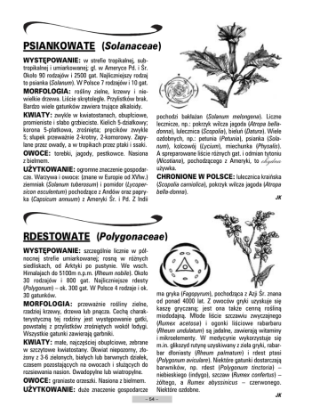 PSIANKOWATE (Solanaceae) WYSTĘPOWANIE: w strefie tropikalnej, subtropikalnej i umiarkowanej; gł. w Ameryce Pd. i Śr. Około 90 rodzajów i 2500 gat. Najliczniejszy rodzaj to psianka (Solanum). W Polsce 7 rodzajów i 10 gat. MORFOLOGIA: rośliny zielne, krzewy i niewielkie drzewa. Liście skrętoległe. Przylistków brak. Bardzo wiele gatunków zawiera trujące alkaloidy. KWIATY: zwykle w kwiatostanach, obupłciowe, promieniste i słabo grzbieciste. Kielich 5-działkowy; korona 5-płatkowa, zrośnięta; pręcików zwykle 5; słupek przeważnie 2-krotny, 2-komorowy. Zapylane przez owady, a w tropikach przez ptaki i ssaki. OWOCE: torebki, jagody, pestkowce. Nasiona z bielmem. UŻYTKOWANIE: ogromne znaczenie gospodarcze. Warzywa i owoce: (znane w Europie od XVIw.) ziemniak (Solanum tuberosum) i pomidor (Lycopersicon esculentum) pochodzące z Andów oraz papryka (Capsicum annuum) z Ameryki Śr. i Pd. Z Indii pochodzi bakłażan (Solanum melongena). Liczne lecznicze, np.: pokrzyk wilcza jagoda (Atropa belladonna), lulecznica (Scopolia), bieluń (Datura). Wiele ozdobnych, np.: petunia (Petunia), psianka (Solanum), kolcowój (Lycium), miechunka (Physalis). A spreparowane liście różnych gat. i odmian tytoniu (Nicotiana), pochodzącego z Ameryki, to ohydna używka. CHRONIONE W POLSCE: lulecznica kraińska (Scopolia carniolica), pokrzyk wilcza jagoda (Atropa bella-donna). JK RDESTOWATE (Polygonaceae) WYSTĘPOWANIE: szczególnie licznie w północnej strefie umiarkowanej; rosną w różnych siedliskach, od Arktyki po pustynie. We wsch. Himalajach do 5100m n.p.m. (Rheum nobile). Około 30 rodzajów i 800 gat. Najliczniejsze rdesty (Polygonum) – ok. 300 gat. W Polsce 4 rodzaje i ok. 30 gatunków. MORFOLOGIA: przeważnie rośliny zielne, rzadziej krzewy, drzewa lub pnącza. Cechą charakterystyczną tej rodziny jest występowanie gatki, powstałej z przylistków zrośniętych wokół łodygi. Wszystkie gatunki zawierają garbniki. KWIATY: małe, najczęściej obupłciowe, zebrane w szczytowe kwiatostany. Okwiat niepozorny, złożony z 3-6 zielonych, białych lub barwnych działek, czasem pozostających na owocach i służących do rozsiewania nasion. Owadopylne lub wiatropylne. OWOCE: graniaste orzeszki. Nasiona z bielmem. UŻYTKOWANIE: duże znaczenie gospodarcze ma gryka (Fagopyrum), pochodząca z Azji Śr. znana od ponad 4000 lat. Z owoców gryki uzyskuje się kaszę gryczaną; jest ona także cenną rośliną miododajną. Młode liście szczawiu zwyczajnego (Rumex acetosa) i ogonki liściowe rabarbaru (Rheum undulatum) są jadalne, zawierają witaminy i mikroelementy. W medycynie wykorzystuje się m.in. glikozyd rutynę uzyskiwany z ziela gryki, rabarbar dłoniasty (Rheum palmatum) i rdest ptasi (Polygonum aviculare). Niektóre gatunki dostarczają barwników, np. rdest (Polygonum tinctoria) – niebieskiego (indygo), szczaw (Rumex confertus) – żółtego, a Rumex abyssinicus – czerwonego. Niektóre ozdobne. – 54 – JK