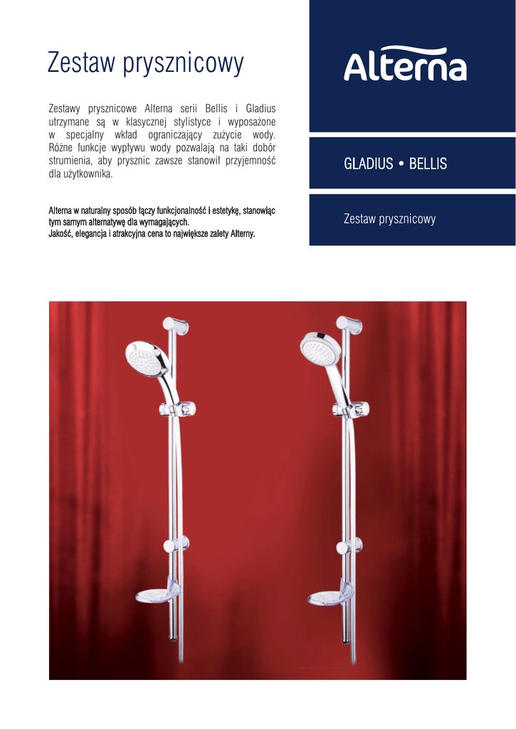 Zestaw prysznicowy Zestawy prysznicowe Alterna serii Bellis i Gladius utrzymane są w klasycznej stylistyce i wyposażone w specjalny wkład ograniczający zużycie wody. Różne funkcje wypływu wody pozwalają na taki dobór strumienia, aby prysznic zawsze stanowił przyjemność dla użytkownika. Alterna w naturalny sposób łączy funkcjonalność i estetykę, stanowiąc tym samym alternatywę dla wymagających. Jakość, elegancja i atrakcyjna cena to największe zalety Alterny. GLADIUS • BELLIS Zestaw prysznicowy ZESTAW PRYSZNICOWY PRZESUWNY GLADIUS 3-FUNKCYJNY NATRYSK PRZESUWNY Z MYDELNICZKĄ 4-FUNKCYJNY NATRYSK PRZESUWNY Z MYDELNICZKĄ 900 900 ZESTAW PRYSZNICOWY PRZESUWNY BELLIS Pełny strumień deszczowy. Pulsujący strumień masujący. Miękki strumień deszczowy i pulsujący strumień masujący. Pełny strumień deszczowy. Pulsujący strumień masujący. Miękki strumień deszczowy i pulsujący strumień masujący. ZALETY: dysze ze specjalnego elastomeru wkład oszczędzający wodę - zużycie mniejsze o 40% drążek o długości 90 cm z regulowanym mocowaniem łatwa regulacja wysokości dzięki dużej dźwigni suwaka wąż prysznicowy 1,60 m ze stożkiem obrotowym 3 lata gwarancji na system SoftClean zapobiegający osadzaniu się kamienia - wystające dysze są tak skonstruowane, że nie zapadają się przy czyszczeniu główki prysznica ręczny montaż węża, bez narzędzi współpracuje z przepływowymi podgrzewaczami wody silny masaż wodny z bezstopniową regulacją pobudza do aktywnego życia pasuje do wszystkich otworów oddalonych od siebie o 300 do 800 mm. Zestaw Bellis • Gladius: Zawiera wkład oszczędzający wodę. (zmniejszenie zużycia wody o 40%) Współpracuje z przepływowymi podgrzewaczami wody. Wyposażona w system przeciwko osadzaniu się kamienia. DANE TECHNICZNE Temperatura zasilania gorącą wodą: maks: 60 - 70°C; zalecana: 42°C maks: 60 - 70°C; zalecana: 42°C Ciśnienie eksploatacyjne: maks: 5 bar; min: 1 bar; zalecane: 3 bar maks: 5 bar; min: 1 bar; zalecane: 3 bar Symbol produktu: ALTN - 950751 ALTN - 950752 Na rączkę prysznicową obowiązuje norma EN 1112. Na wąż prysznicowy obowiązuje norma EN 1113. Uwaga: Rączki prysznicowej nie należy narażać na działanie gorącej wody o temperaturze powyżej 60 - 70°C www.tadmar.pl Tryb oszczędzania wody.