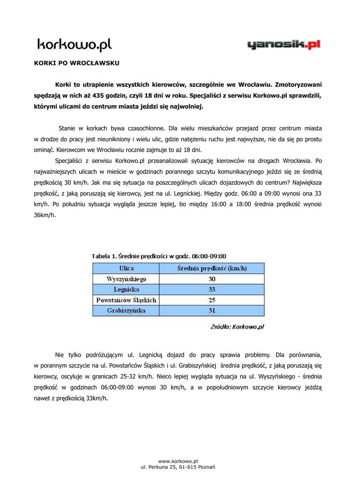 KORKI PO WROCŁAWSKU Korki to utrapienie wszystkich kierowców, szczególnie we Wrocławiu. Zmotoryzowani spędzają w nich aż 435 godzin, czyli 18 dni w roku. Specjaliści z serwisu Korkowo.pl sprawdzili, którymi ulicami do centrum miasta jeździ się najwolniej. Stanie w korkach bywa czasochłonne. Dla wielu mieszkańców przejazd przez centrum miasta w drodze do pracy jest nieunikniony i wielu ulic, gdzie natężeniu ruchu jest najwyższe, nie da się po prostu ominąć. Kierowcom we Wrocławiu rocznie zajmuje to aż 18 dni. Specjaliści z serwisu Korkowo.pl przeanalizowali sytuację kierowców na drogach Wrocławia. Po najważniejszych ulicach w mieście w godzinach porannego szczytu komunikacyjnego jeździ się ze średnią prędkością 30 km/h. Jak ma się sytuacja na poszczególnych ulicach dojazdowych do centrum? Największa prędkość, z jaką poruszają się kierowcy, jest na ul. Legnickiej. Między godz. 06:00 a 09:00 wynosi ona 33 km/h. Po południu sytuacja wygląda jeszcze lepiej, bo między 16:00 a 18:00 średnia prędkość wynosi 36km/h. Nie tylko podróżującym ul. Legnicką dojazd do pracy sprawia problemy. Dla porównania, w porannym szczycie na ul. Powstańców Śląskich i ul. Grabiszyńskiej średnia prędkość, z jaką poruszają się kierowcy, oscyluje w granicach 25-32 km/h. Nieco lepiej wygląda sytuacja na ul. Wyszyńskiego - średnia prędkość w godzinach 06:00-09:00 wynosi 30 km/h, a w popołudniowym szczycie kierowcy jeżdżą nawet z prędkością 33km/h. www.korkowo.pl ul. Perkuna 25, 61-615 Poznań Statystyczny kierowca we Wrocławiu podczas dojazdu i powrotu z pracy w godzinach szczytu komunikacyjnego w ciągu 252 dni roboczych spędzi na ul. Wyszyńskiego ponad 58 godzin, a na ul. Powstańców Ślaskich - 109 godzin. Jeszcze więcej, bo aż 117 godzin spędzą w samochodzie ci, którzy do pracy jeżdżą ul. Grabiszyńską. Natomiast ul. Legnicka wykrada w ciągu roku aż 151 godzin (zaznaczyć jednak trzeba, że jest to najdłuższa ulica spośród badanych). Dane o sytuacji drogowej zostały opracowane przez serwis Korkowo.pl, który prezentuje aktualne informacje o korkach na polskich drogach. Analizie poddano dane z urządzeń GPS umieszczonych w pojazdach poruszających się po ulicach Wrocławia w godzinach od 06:00 do 22:00. Badaniu poddano drogi dojazdowe do centrum Wrocławia (ul. Wyszyńskiego, Legnicka, Powstańców Śląskich i ul. Grabiszyńska). ------------------------------Dystrybucja materiałów: Klaudia Cichocka [email protected] kom./+48/ 519-181-900 www.korkowo.pl ul. Perkuna 25, 61-615 Poznań