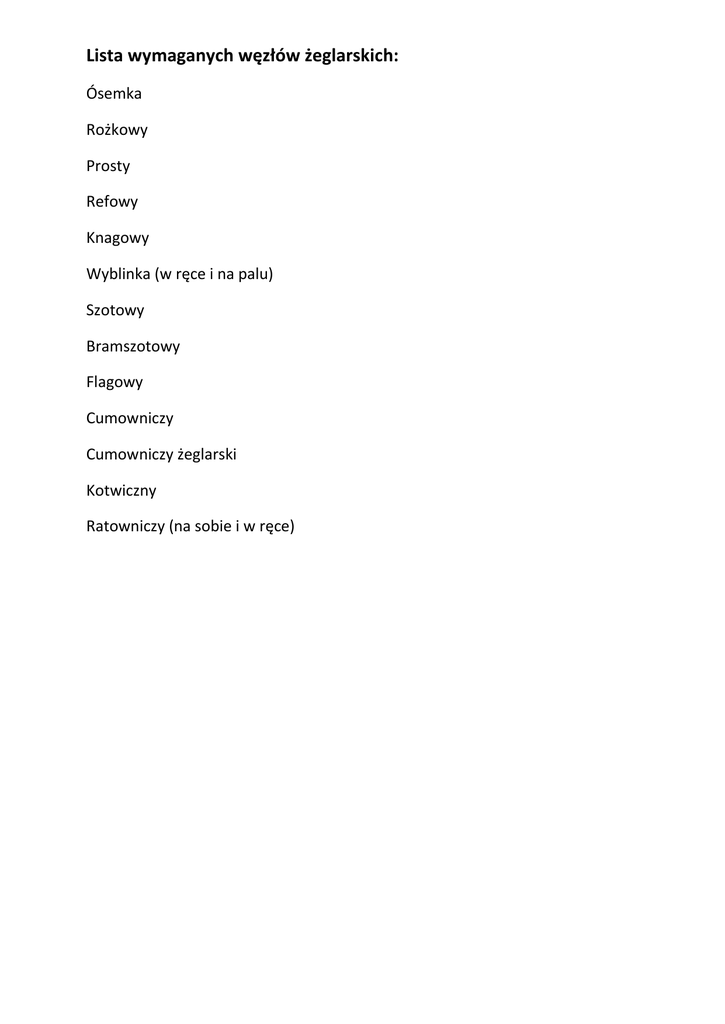 Lista wymaganych węzłów żeglarskich: Ósemka Rożkowy Prosty Refowy Knagowy Wyblinka (w ręce i na palu) Szotowy Bramszotowy Flagowy Cumowniczy Cumowniczy żeglarski Kotwiczny Ratowniczy (na sobie i w ręce)