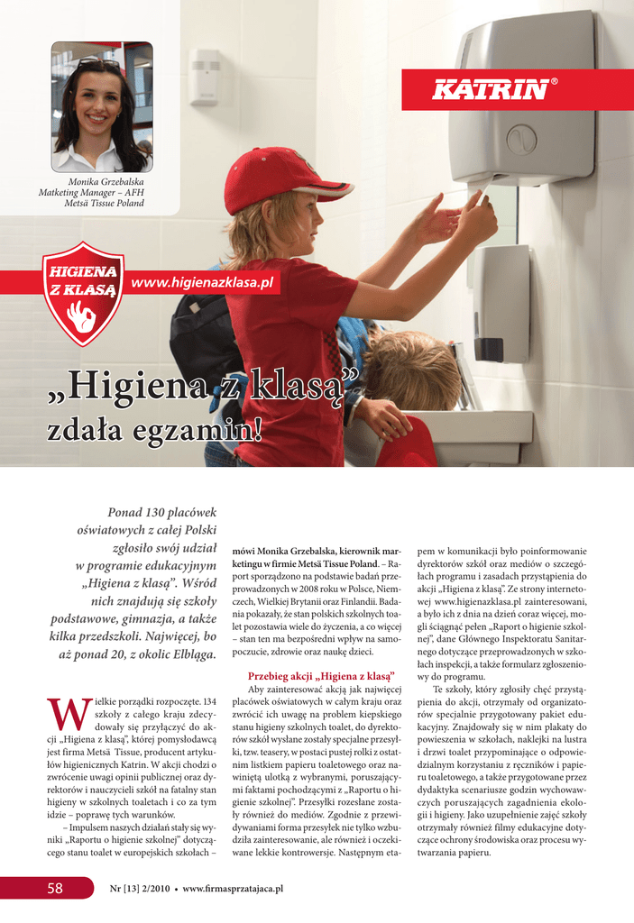 Prezentacje Monika Grzebalska Matketing Manager – AFH Metsä Tissue Poland „Higiena z klasą” zdała egzamin! Ponad 130 placówek oświatowych z całej Polski zgłosiło swój udział w programie edukacyjnym „Higiena z klasą”. Wśród nich znajdują się szkoły podstawowe, gimnazja, a także kilka przedszkoli. Najwięcej, bo aż ponad 20, z okolic Elbląga. W Przebieg akcji „Higiena z klasą” ielkie porządki rozpoczęte. 134 szkoły z całego kraju zdecydowały się przyłączyć do akcji „Higiena z klasą”, której pomysłodawcą jest firma Metsä Tissue, producent artykułów higienicznych Katrin. W akcji chodzi o zwrócenie uwagi opinii publicznej oraz dyrektorów i nauczycieli szkół na fatalny stan higieny w szkolnych toaletach i co za tym idzie – poprawę tych warunków. – Impulsem naszych działań stały się wyniki „Raportu o higienie szkolnej” dotyczącego stanu toalet w europejskich szkołach – 58 mówi Monika Grzebalska, kierownik marketingu w firmie Metsä Tissue Poland. – Raport sporządzono na podstawie badań przeprowadzonych w 2008 roku w Polsce, Niemczech, Wielkiej Brytanii oraz Finlandii. Badania pokazały, że stan polskich szkolnych toalet pozostawia wiele do życzenia, a co więcej – stan ten ma bezpośredni wpływ na samopoczucie, zdrowie oraz naukę dzieci. Aby zainteresować akcją jak najwięcej placówek oświatowych w całym kraju oraz zwrócić ich uwagę na problem kiepskiego stanu higieny szkolnych toalet, do dyrektorów szkół wysłane zostały specjalne przesyłki, tzw. teasery, w postaci pustej rolki z ostatnim listkiem papieru toaletowego oraz nawiniętą ulotką z wybranymi, poruszającymi faktami pochodzącymi z „Raportu o higienie szkolnej”. Przesyłki rozesłane zostały również do mediów. Zgodnie z przewidywaniami forma przesyłek nie tylko wzbudziła zainteresowanie, ale również i oczekiwane lekkie kontrowersje. Następnym eta- Nr [13] 2/2010 • www.firmasprzatajaca.pl pem w komunikacji było poinformowanie dyrektorów szkół oraz mediów o szczegółach programu i zasadach przystąpienia do akcji „Higiena z klasą”. Ze strony internetowej www.higienazklasa.pl zainteresowani, a było ich z dnia na dzień coraz więcej, mogli ściągnąć pełen „Raport o higienie szkolnej”, dane Głównego Inspektoratu Sanitarnego dotyczące przeprowadzonych w szkołach inspekcji, a także formularz zgłoszeniowy do programu. Te szkoły, który zgłosiły chęć przystąpienia do akcji, otrzymały od organizatorów specjalnie przygotowany pakiet edukacyjny. Znajdowały się w nim plakaty do powieszenia w szkołach, naklejki na lustra i drzwi toalet przypominające o odpowiedzialnym korzystaniu z ręczników i papieru toaletowego, a także przygotowane przez dydaktyka scenariusze godzin wychowawczych poruszających zagadnienia ekologii i higieny. Jako uzupełnienie zajęć szkoły otrzymały również filmy edukacyjne dotyczące ochrony środowiska oraz procesu wytwarzania papieru. Prezentacje Uczestnicy akcji mogą również wziąć udział w konkursie plastycznym „Toaleta marzeń”, którego wyniki ogłoszone zostaną tuż przed wakacjami. W nagrodę zwycięska klasa zaproszona zostanie na wycieczkę do fabryki papieru w Konstancinie-Jeziornej oraz na warsztaty czerpania papieru. Przewidziano także nagrody dla szkół, które zgłoszą klasy do konkursu. Na zwycięskie placówki czekają produkty higieniczne (papier toaletowy, ręczniki, mydło w płynie, dozowniki) o wartości netto 5000 zł (nagroda główna) oraz 3 nagrody dodatkowe – zapasy papieru toaletowego i ręczników o wartości 2000 zł netto. Na stronie internetowej programu www.higienazklasa.pl znajduje się lista szkół, które zgłosiły się do akcji. Listy, jakie nadeszły do organizatora akcji po ogłoszeniu programu, potwierdzają wnioski z raportu. Pani Katarzyna, matka ucznia ze szkoły podstawowej w Gliwicach, napisała: „(…) uczniowie naszej szkoły regularnie niszczą pojemniki na mydło i papier toaletowy, demolują i wyrywają zamki w drzwiach, wyważają same drzwi. Rolki papieru i ręczniki papierowe są wpychane do toalet, co powoduje ich zatykanie. Mydło jest wylewane na podłogę i do umywalek. Same sanitariaty także są niszczone, uczniowie wchodzą na deski klozetowe butami, niszcząc je, łamiąc i brudząc. W spłuczkach są wyrywane „rączki” do ich uruchamiania. W związku z tą sytuacją nauczyciele chowają w swoich szafkach papier toaletowy i mydło i wydają je na prośbę ucznia. To żywioł, który panuje w tej szkole od lat – ponoć to samo dzieje się w innych szkołach publicznych. (…) Jak skutecznie walczyć z prymitywnym wandalizmem? Przydałby się monitoring w toaletach – ale którą szkołę na to stać? To chora sytuacja. Mam nadzieję, że Państwa akcja coś zmieni.” – My też mamy wielką nadzieję, że lekcje wychowawcze poświęcone ekologii oraz odpowiedzialnemu korzystaniu z toalet to dopiero początek działań, które pociągną za sobą prawdziwe zmiany zarówno w mentalności dzieci, jak i te bardziej namacalne – w budynkach szkół – mówi wiceprezes do spraw sprzedaży Metsä Tissue Poland, Jarosław Urban. Honorowy patronat nad programem „Higiena z klasą objęli”: Komitet Ochrony Praw Dziecka, Polska Izba Gospodarcza Czystości, Gazeta Szkolna, Medforum. Nr [13] 2/2010 • www.firmasprzatajaca.pl 59