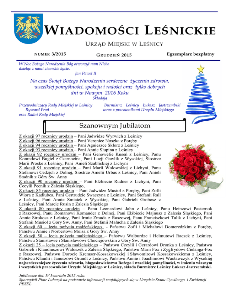 W IADOMOŚCI L EŚNICKIE U RZĄD M IEJSKI W L EŚNICY NUMER 3/2015 G RUDZIEŃ 2015 Egzemplarz bezpłatny W Noc Bożego Narodzenia Bóg otworzył nam Niebo dzieląc z nami ziemskie życie. Jan Paweł II Na czas Świąt Bożego Narodzenia serdeczne życzenia zdrowia, wszelkiej pomyślności, spokoju i radości oraz tylko dobrych dni w Nowym 2016 Roku Składają Przewodniczący Rady Miejskiej w Leśnicy Ryszard Froń oraz Radni Rady Miejskiej Burmistrz Leśnicy Łukasz Jastrzembski wraz z pracownikami Urzędu Miejskiego Szanownym Jubilatom Z okazji 97 rocznicy urodzin – Pani Jadwidze Wyrwich z Leśnicy Z okazji 96 rocznicy urodzin – Pani Veronice Noszka z Poręby Z okazji 94 rocznicy urodzin – Pani Agnieszce Sklorz z Leśnicy Z okazji 93 rocznicy urodzin – Pani Annie Słupina z Leśnicy Z okazji 92 rocznicy urodzin – Pani Genowefie Kuseń z Leśnicy, Panu Konradowi Bugiel z Czarnocina, Pani Łucji Gawlik z Wysokiej, Siostrze Marii Proske z Leśnicy, Pani Anieli Szablickiej z Lichyni Z okazji 91 rocznicy urodzin – Pani Marii Wołowskiej z Lichyni, Panu Stefanowi Cedzich z Dolnej, Siostrze Amelii Urbas z Leśnicy, Pani Anieli Stadnik z Góry Św. Anny Z okazji 90 rocznicy urodzin – Pani Elżbiecie Rudner z Lichyni, Pani Cecylii Pecnik z Zalesia Śląskiego, Z okazji 85 rocznicy urodzin – Pani Jadwidze Musioł z Poręby, Pani Zofii Wiora z Kadłubca, Pani Gertrudzie Swaczyna z Leśnicy, Pani Stefanii Rall z Leśnicy, Pani Annie Smiatek z Wysokiej, Pani Gabrieli Grobosz z Leśnicy, Pani Marcie Rusin z Zalesia Śląskiego Z okazji 80 rocznicy urodzin – Panu Leonardowi Jahn z Leśnicy, Panu Heinzowi Pasternok z Raszowej, Panu Romanowi Komander z Dolnej, Pani Elżbiecie Majnusz z Zalesia Śląskiego, Pani Annie Strokosz z Leśnicy, Pani Irmie Zmuda z Raszowej, Panu Franciszkowi Tulik z Lichyni, Pani Stefanii Musioł z Góry Św. Anny, Pani Stefanii Małucha z Zalesia Śląskiego Z okazji 60 – lecia pożycia małżeńskiego - Państwu Zofii i Michałowi Domeredzkim z Poręby, Państwu Annie i Norbertowi Moisa z Góry Św. Anny Z okazji 50 – lecia pożycia małżeńskiego – Państwu Walburdze i Helmutowi Raczek z Leśnicy, Państwu Stanisławie i Stanisławowi Chociejowskim z Góry Św. Anny Z okazji 25 – lecia pożycia małżeńskiego – Państwu Cecylii i Gerardowi Dronka z Leśnicy, Państwu Gabrieli i Klaudiuszowi Waloszek z Zalesia Śląskiego, Państwu Marii Fox i Zygfrydowi Cielanga-Fox z Raszowej, Państwu Dorocie Kremser-Kossakowskiej i Sławomirowi Kossakowskiemu z Leśnicy, Państwu Klaudii i Januszowi Grundt z Leśnicy, Państwu Annie i Joachimowi Wacławczyk z Wysokiej najserdeczniejsze życzenia zdrowia, błogosławieństwa Bożego i wszelkiej pomyślności, w imieniu własnym i wszystkich pracowników Urzędu Miejskiego w Leśnicy, składa Burmistrz Leśnicy Łukasz Jastrzembski. Jubileusze dot. IV kwartału 2015 roku. Sporządził Piotr Lubczyk na podstawie informacji znajdujących się w Urzędzie Stanu Cywilnego i Ewidencji PESEL S TR . 2 W IADOMOŚCI L EŚNICKIE Stawki podatkowe na rok 2016 Rada Miejska w Leśnicy na sesji w dniu 30 listopada 2015 r. uchwaliła stawki podatkowe na rok 2016. Stawki podatków i opłat lokalnych na 2016 rok utrzymane zostały na tym samym poziomie co w roku 2015. Roczne stawki podatku od nieruchomości na rok 2016 wynoszą: od gruntów: związanych z prowadzeniem działalności gospodarczej, bez względu na sposób zakwalifikowania w ewidencji gruntów i budynków – 0,86 zł od 1 m2 powierzchni, pod wodami powierzchniowymi stojącymi lub wodami powierzchniowymi płynącymi jezior i zbiorników sztucznych - 4,58 zł od 1 hektara powierzchni, pozostałych, w tym zajętych na prowadzenie odpłatnej statutowej działalności pożytku publicznego przez organizacje pożytku publicznego - 0,26 zł od 1 m2 powierzchni, niezabudowanych objętych obszarem rewitalizacji, o którym mowa w ustawie z dnia 9 października 2015 r. o rewitalizacji (Dz. U. poz.1777), i położonych na terenach, dla których miejscowy plan zagospodarowania przestrzennego przewiduje przeznaczenie pod zabudowę mieszkaniową, usługową albo zabudowę o przeznaczeniu mieszanym obejmującym wyłącznie te rodzaje zabudowy, jeżeli od dnia wejścia w życie tego planu w odniesieniu do tych gruntów upłynął okres 4 lat, a w tym czasie nie zakończono budowy zgodnie z przepisami prawa budowlanego - 3 zł od 1 m2 powierzchni, od budynków lub ich części: mieszkalnych - 0,70 zł od 1 m2 powierzchni użytkowej, związanych z prowadzeniem działalności gospodarczej oraz od budynków mieszkalnych lub ich części zajętych na prowadzenie działalności gospodarczej - 20,60 zł od 1 m2 powierzchni użytkowej, zajętych na prowadzenie działalności gospodarczej w zakresie obrotu kwalifikowanym materiałem siewnym - 10,68 zł od 1 m2 powierzchni użytkowej, związanych z udzielaniem świadczeń zdrowotnych w rozumieniu przepisów o działalności leczniczej, zajętych przez podmioty udzielające tych świadczeń - 4,41 zł od 1 m2 powierzchni użytkowej, pozostałych, w tym zajętych na prowadzenie odpłatnej statutowej działalności pożytku publicznego przez organizacje pożytku publicznego - 4,57 zł od 1 m2 powierzchni użytkowej, 3) od budowli: przesyłowych i rozdzielczych wody, rurociągów i przewodów sieci rozdzielczej wody, od budowli służących do odprowadzania i oczyszczania ścieków - 1% ich wartości, pozostałych – 2% ich wartości, Podatek rolny Podatek rolny oblicza się według średniej ceny skupu żyta za okres 11 kwartałów poprzedzający rok podatkowy ogłoszonej przez Prezesa GUS. Zgodnie z komunikatem Prezesa GUS z dnia 19.10.2015r. średnia cena skupu żyta za okres 11 kwartałów, będącej podstawą do ustalenia podatku rolnego na rok podatkowy 2016 wynosi 53,75 zł za 1 dt. Cena ta w porównaniu do roku 2015 jest niższa o 12%. Stawka podatku rolnego na rok 2016 wynosić będzie: dla właścicieli gospodarstw rolnych z 1 ha prze