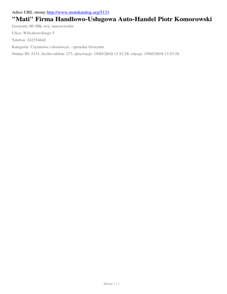 Adres URL strony http://www.motokatalog.org/5131 "Mati" Firma Handlowo-Usługowa Auto-Handel Piotr Komorowski Gostynin, 09-500, woj. mazowieckie Ulica: Wilczkowskiego 5 Telefon: 242354642 Kategorie: Ciężarowe i dostawcze - sprzedaż Gostynin Numer ID: 5131, liczba odsłon: 273, aktywacja: 19/03/2010 13:52:28, edycja: 19/03/2010 13:52:28 Strona 1 / 1